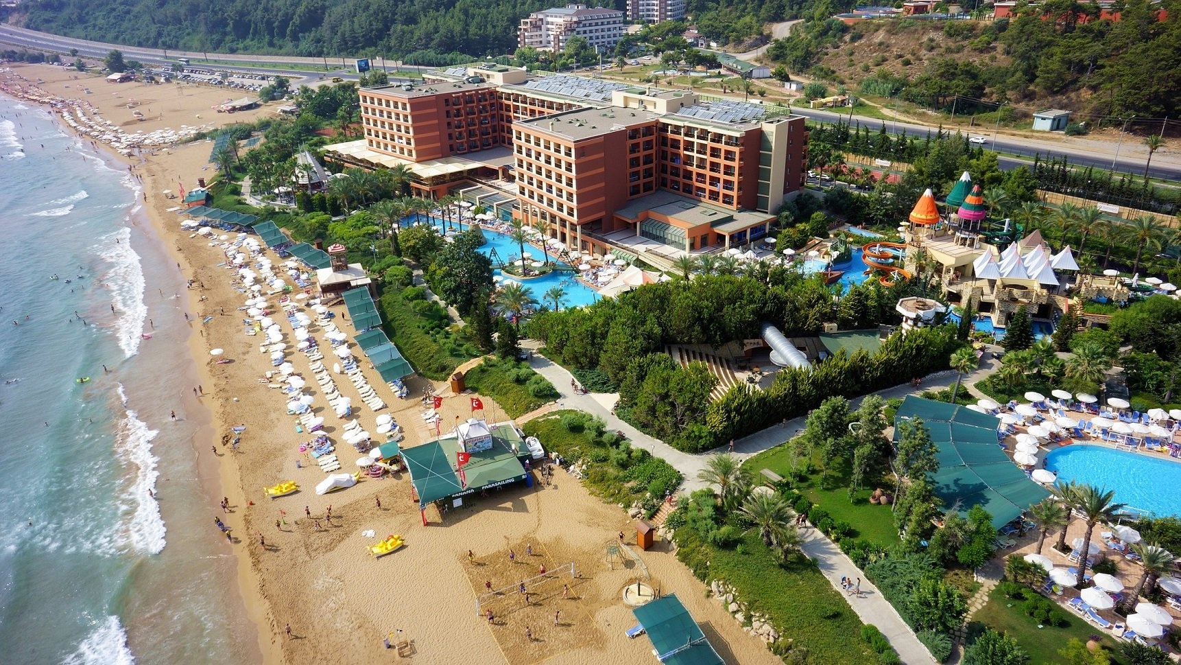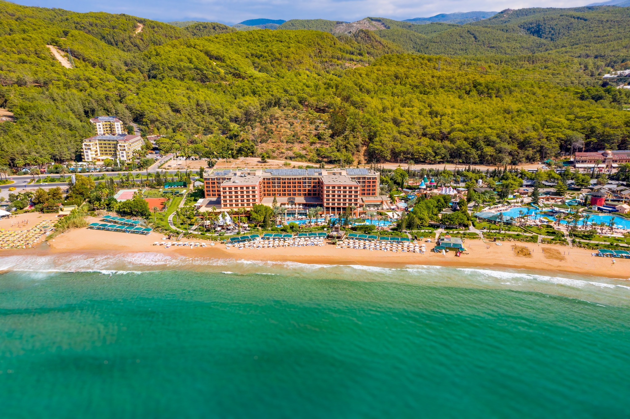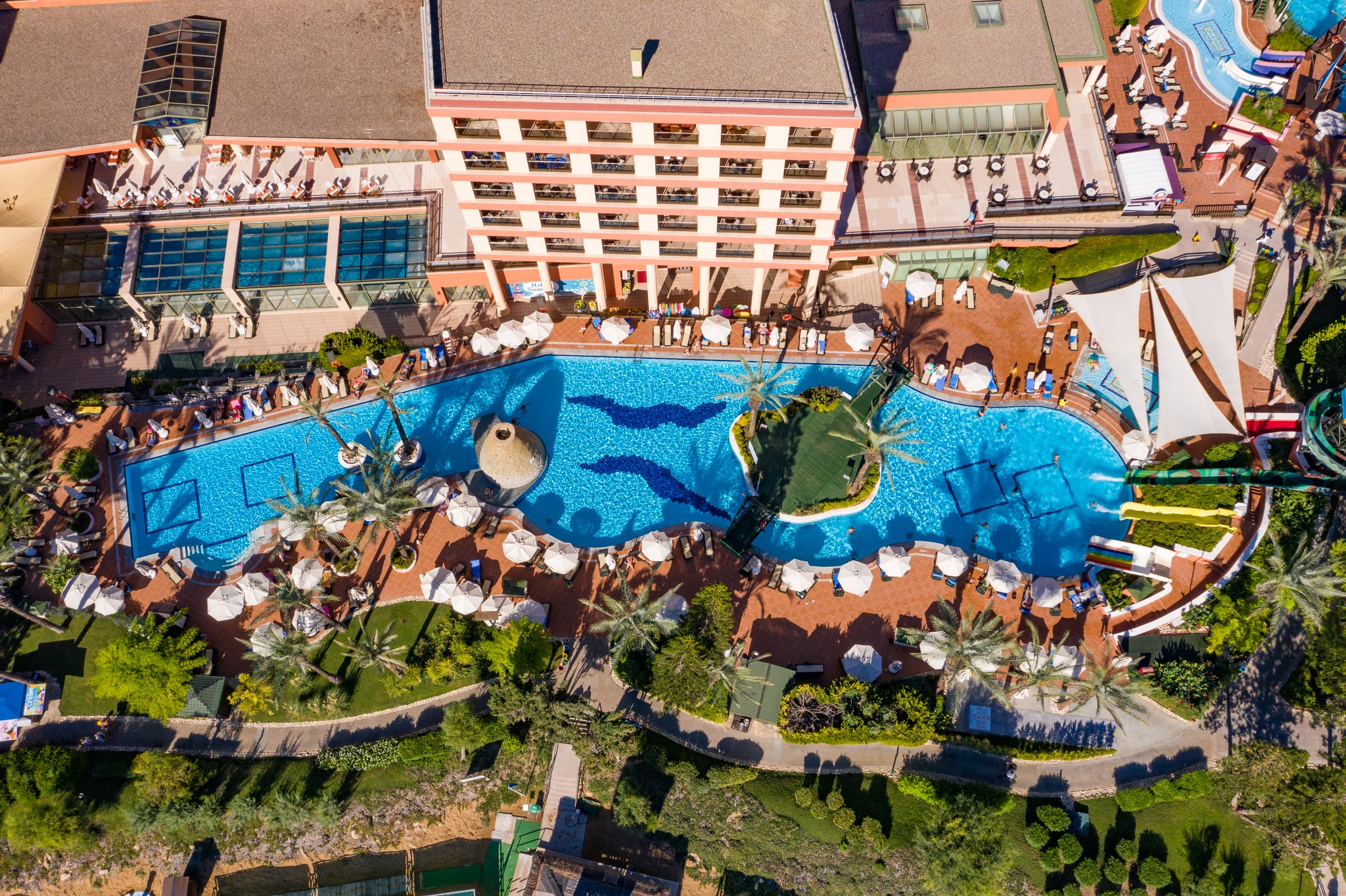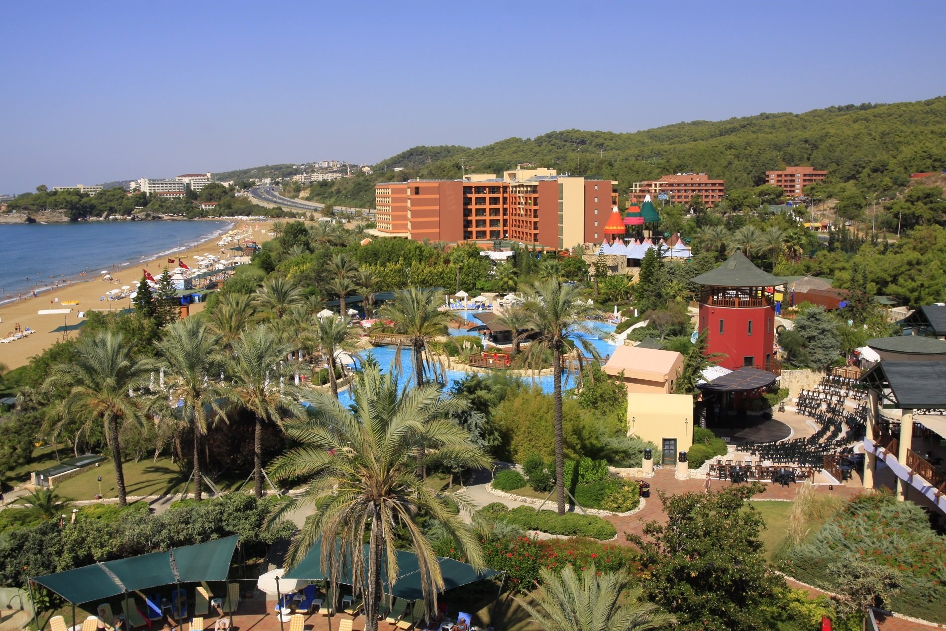 Основен ресторант, 3 а-ла-карт ресторанта 4 бара, 4 открити басейна, 1 детски басейн, водни пързалки за деца и възрастни, детска площадка, мини клуб (4-12г.).