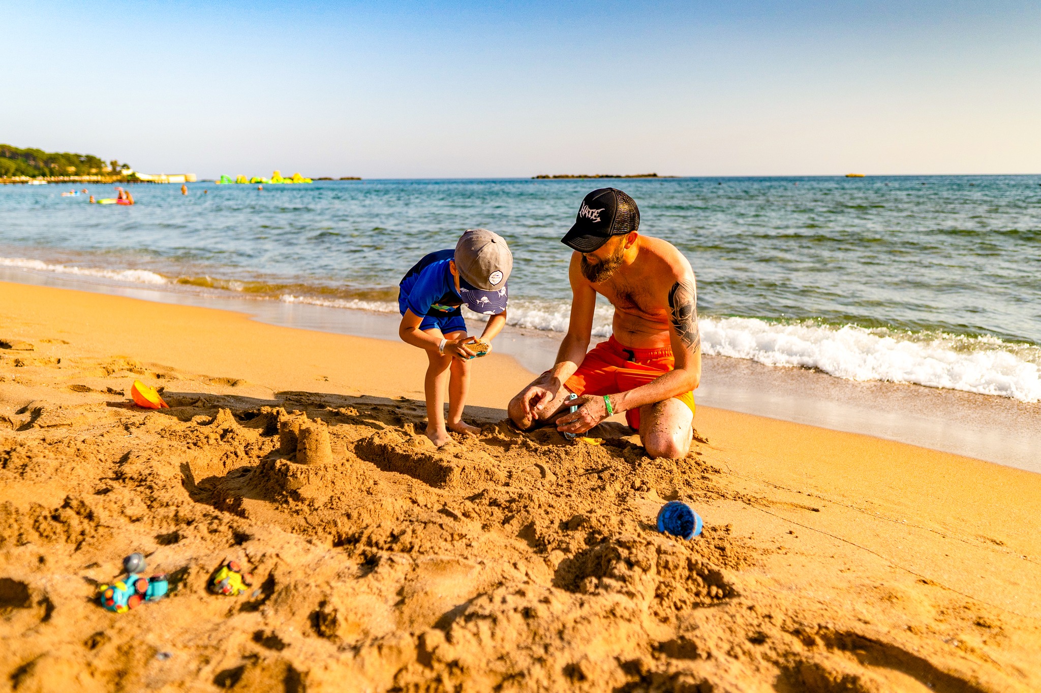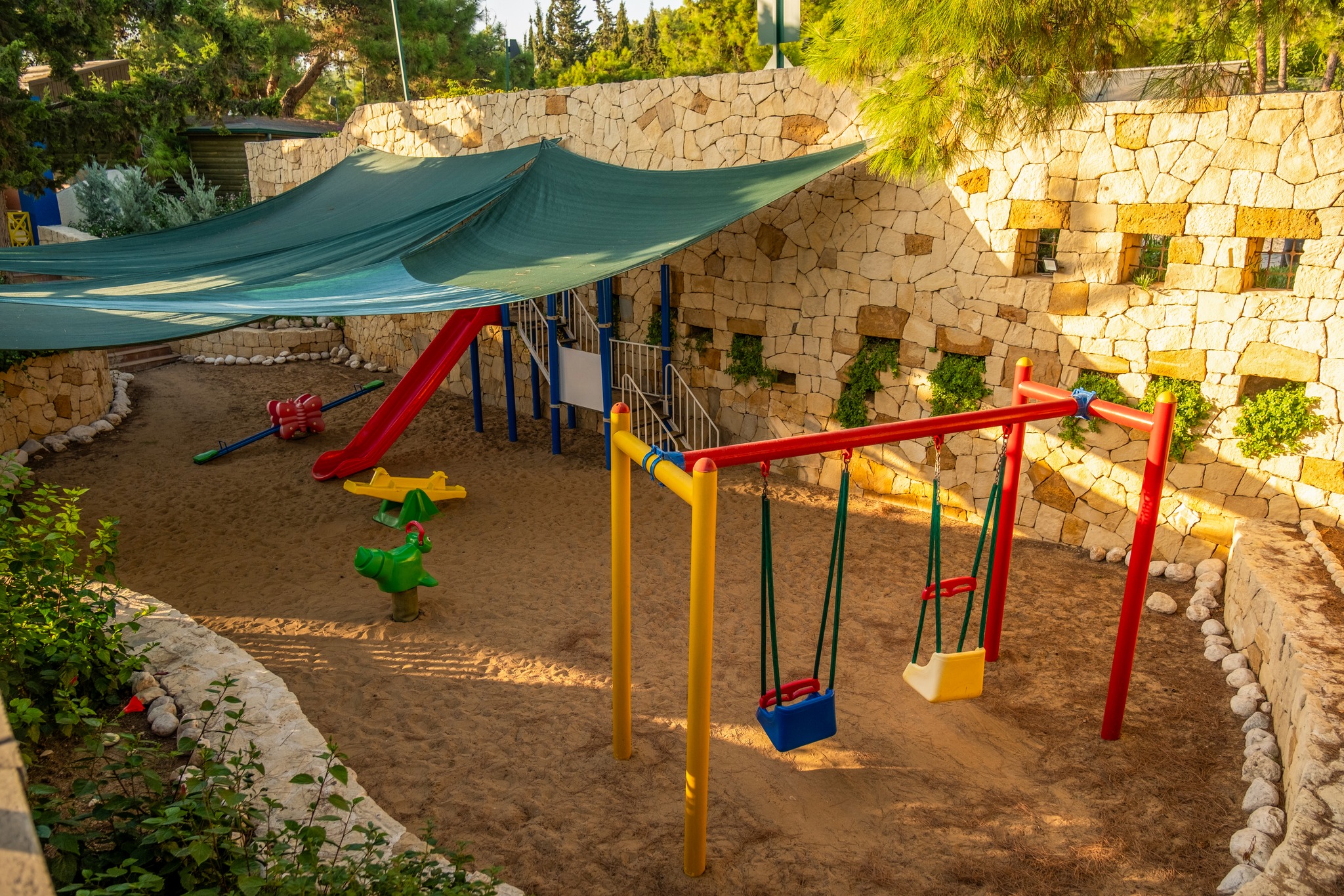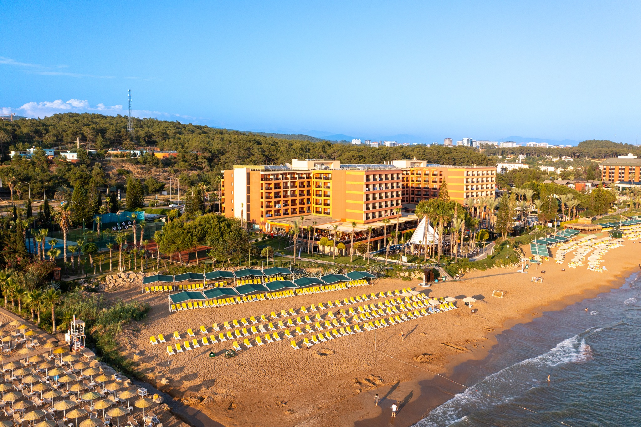 ПЛАЖ: Собствен, пясъчен, удостоен със сертификат Син Флаг за изключително чиста вода. На басейна и на плажа: чадъри, шезлонги, матраци – безплатно. Плажни хавлии: безплатно.