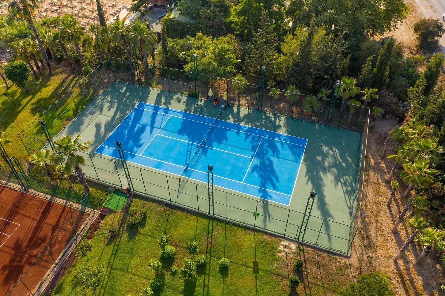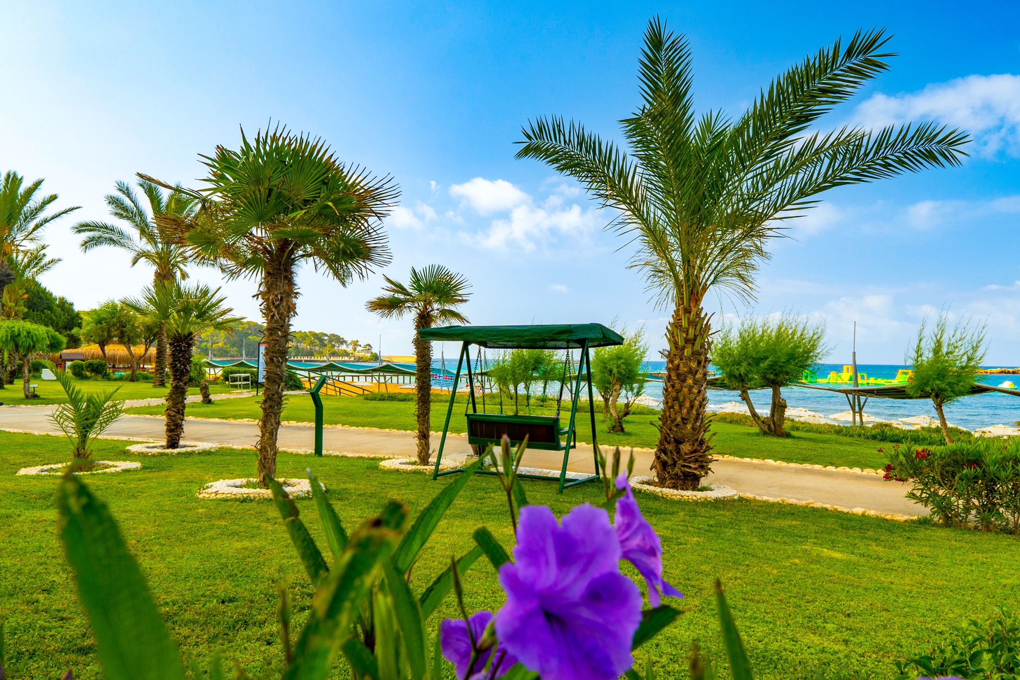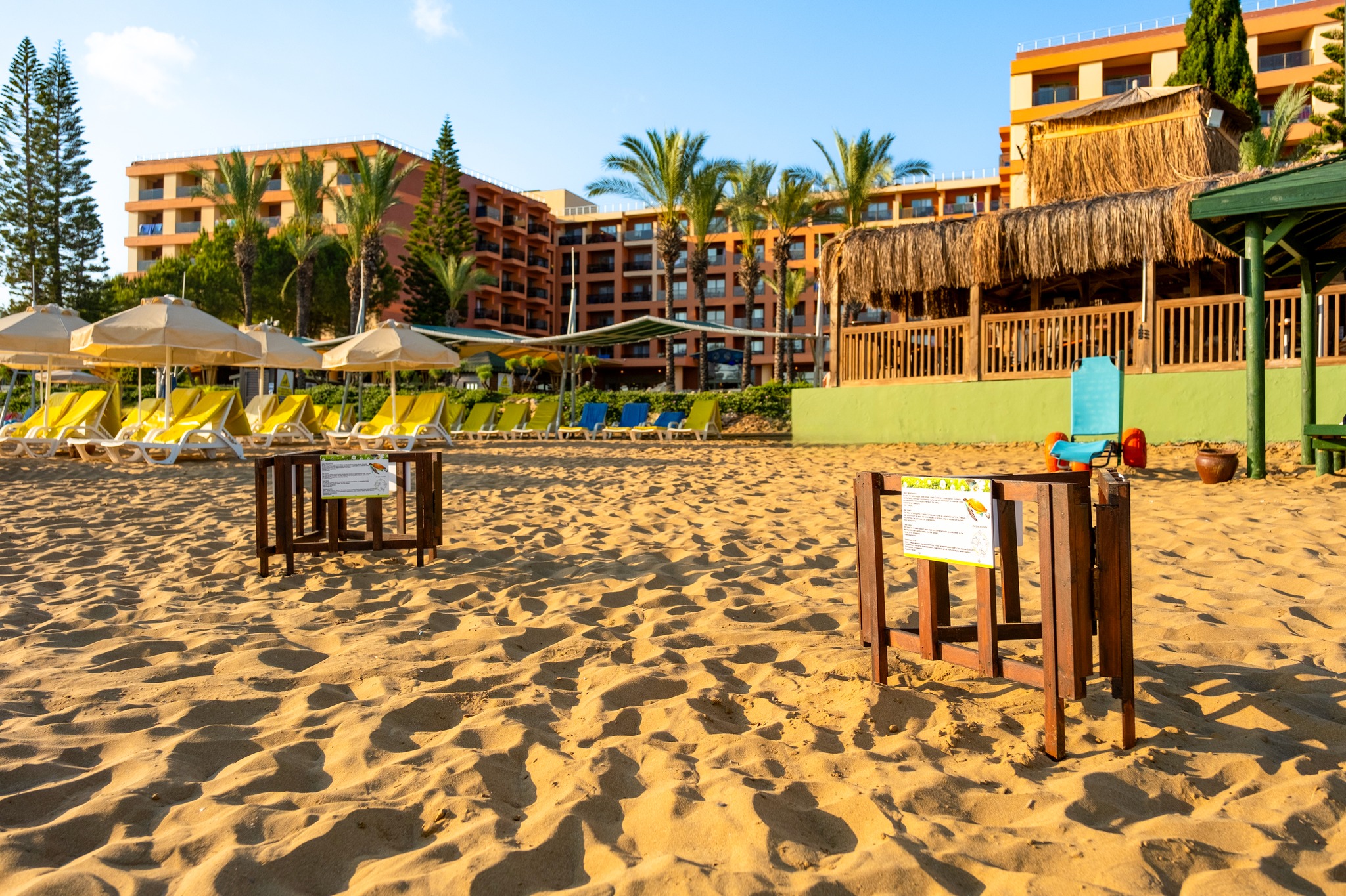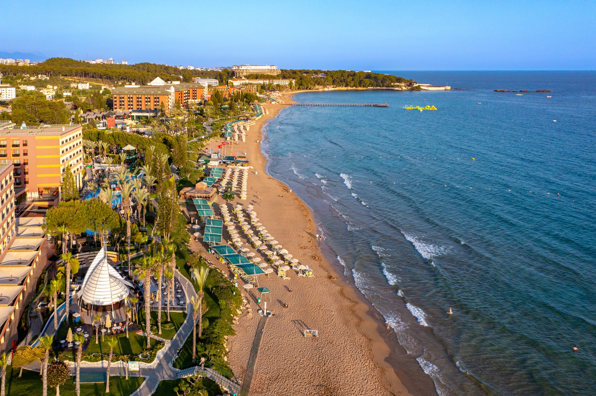 Собствен, пясъчен, удостоен със сертификат "Син флаг" за изключително чиста вода. На басейна и на плажа: чадъри, шезлонги, матраци – безплатно. Плажни хавлии: безплатно.