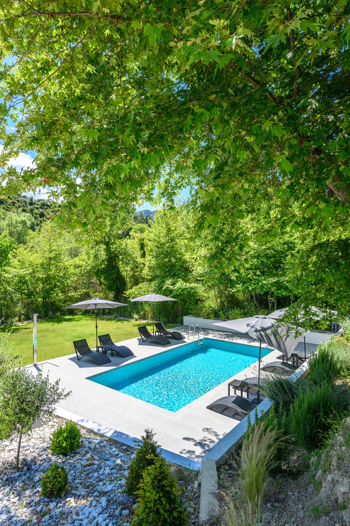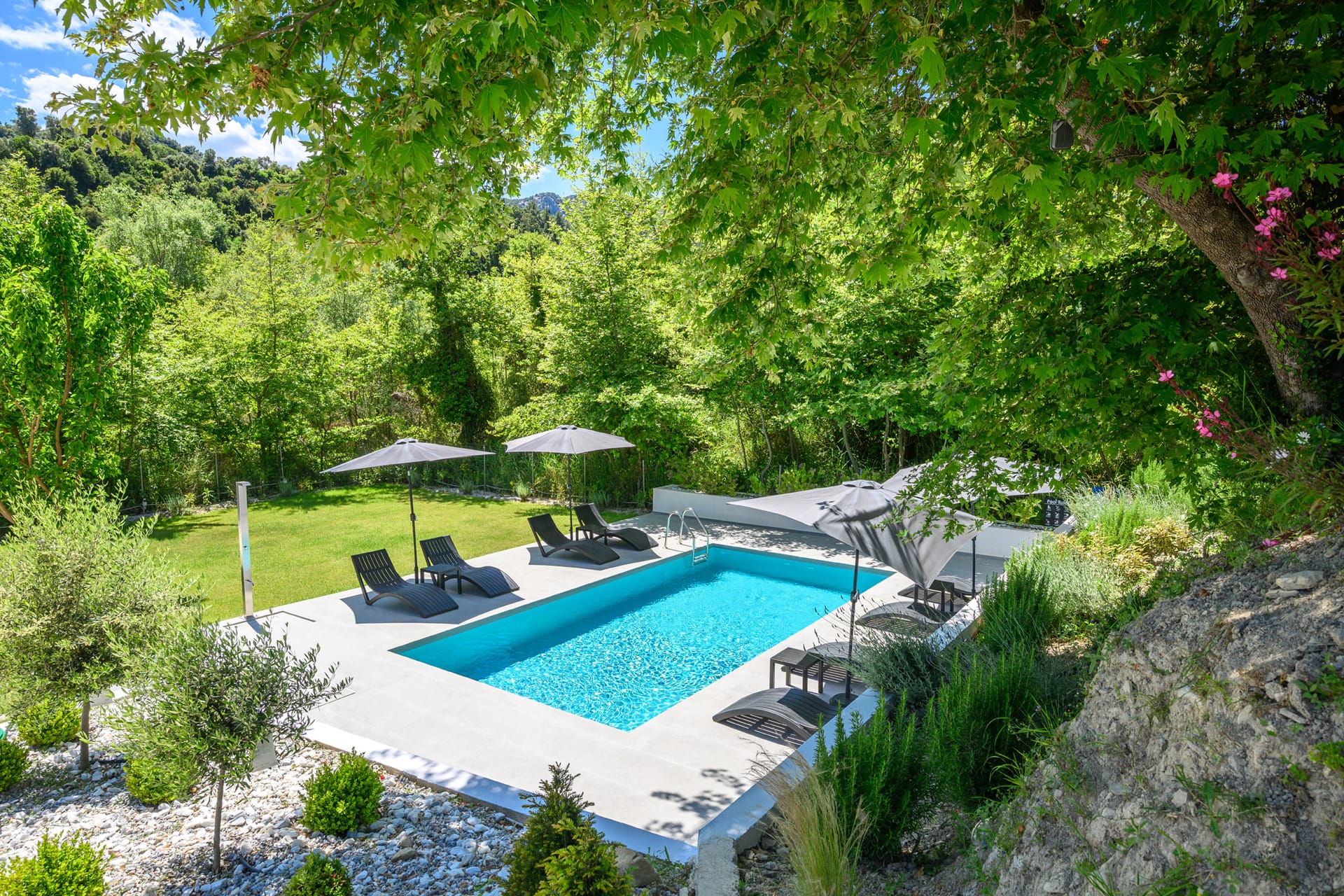 Guests can enjoy the pool with a view and garden at the villa.