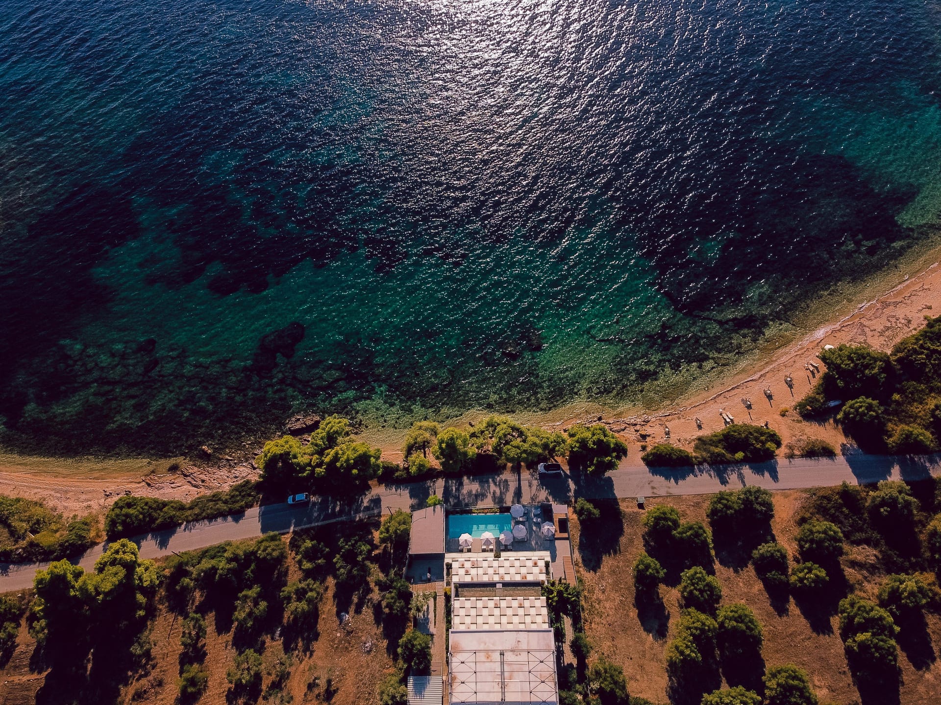 The location is surrounded with pine trees that literally touch the sea, the azure crystal clear water is unique and the sunset is one of a kind.