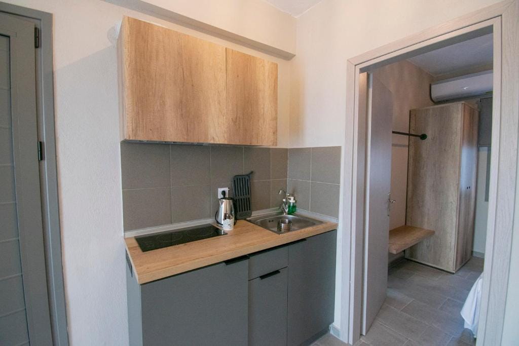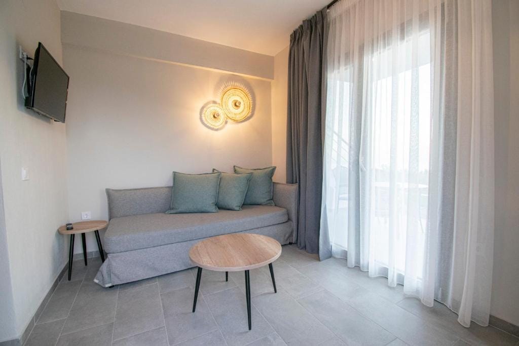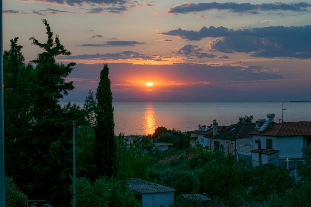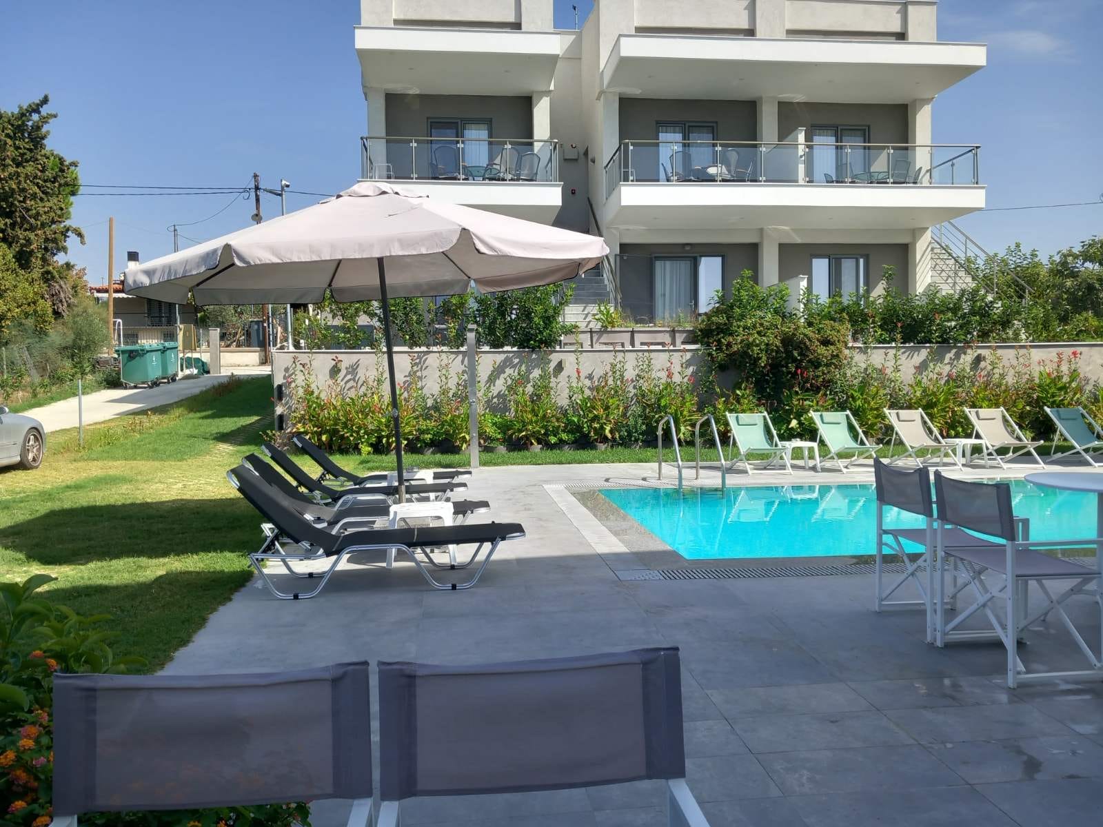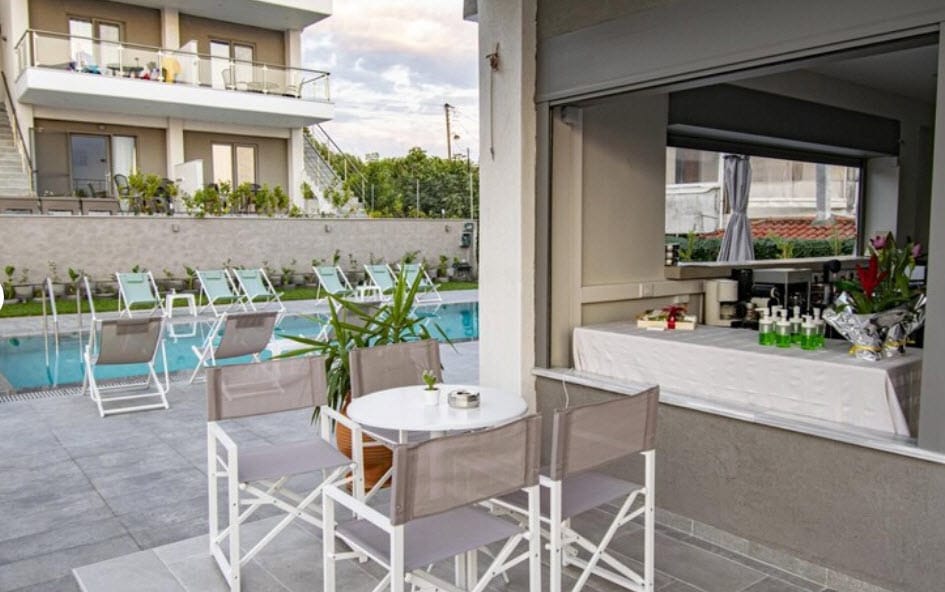 In the complex there is a shared swimming pool with free sunbeds and a snack bar where you can enjoy refreshing drinks or meals for an additional fee. Macedonia Airport is 23 kilometers away and Thessaloniki is 35 kilometers away.