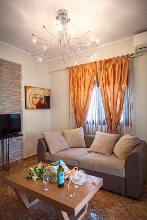 Opening to balconies, the air-conditioned Amalthea Lux Villas have a living area and a fully-equipped kitchen with dining area, fridge and oven. The modern bathroom comes with a spa bath. A safe and a flat-screen satellite TV are available.
