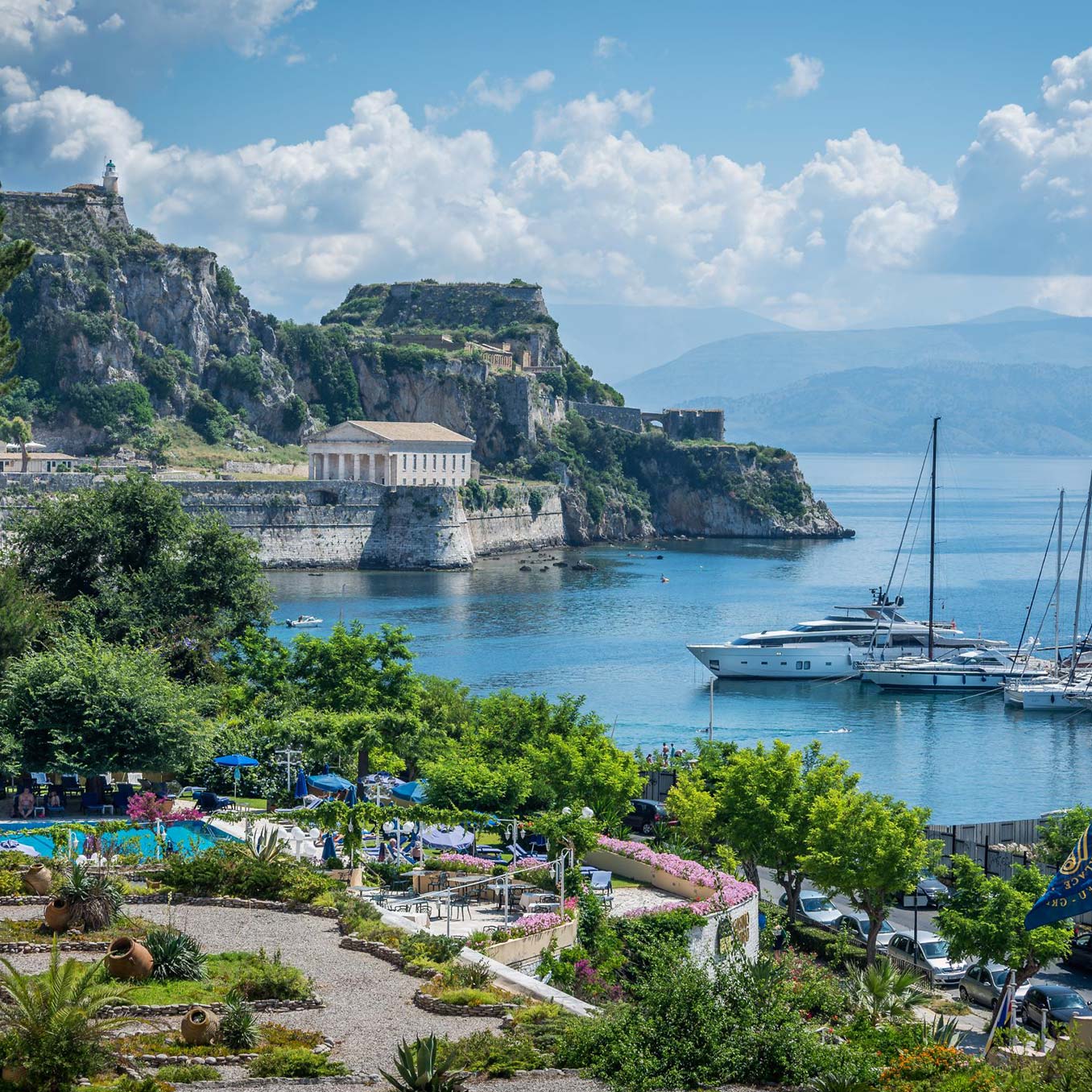 Garitsa Bay and the old fortress of Corfu. Relax in our outdoor swimming pool