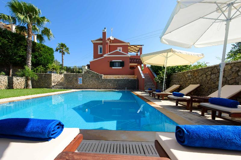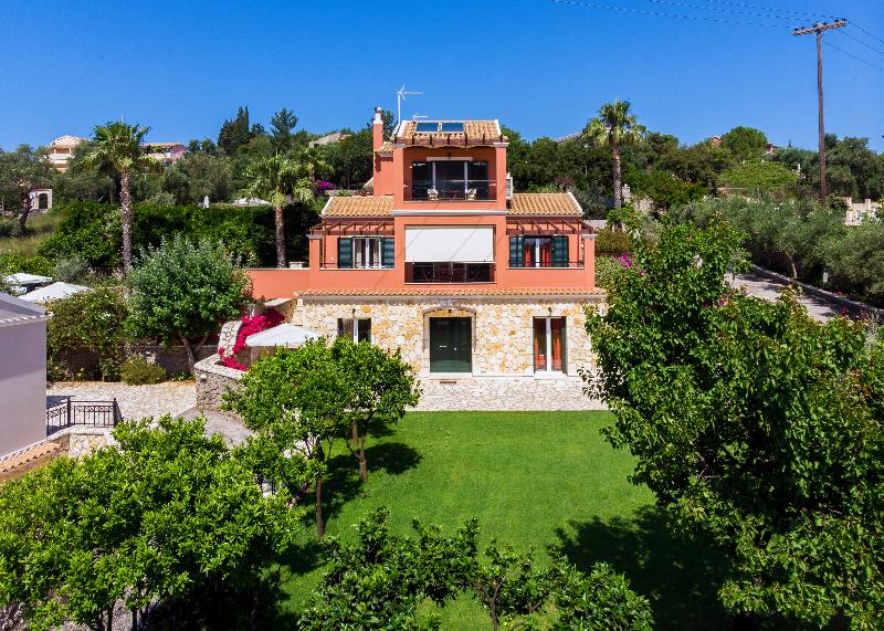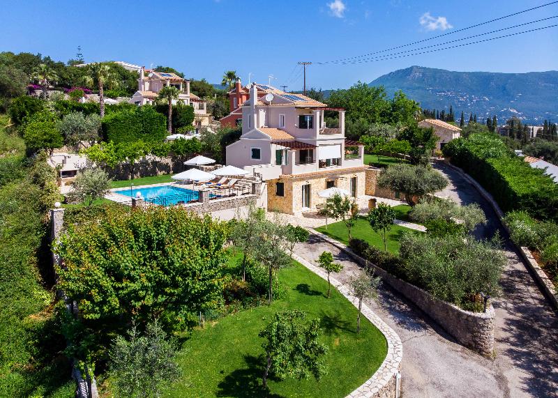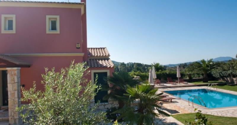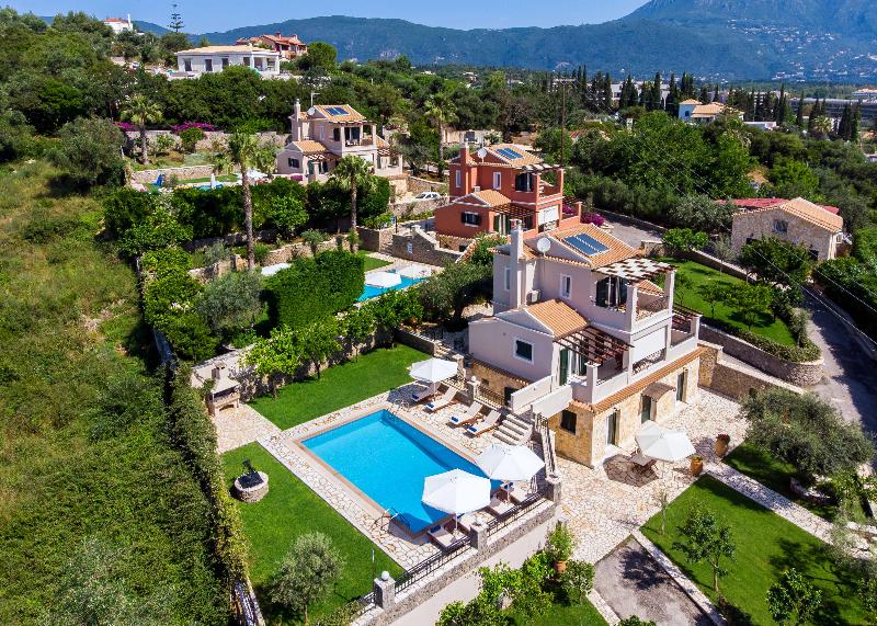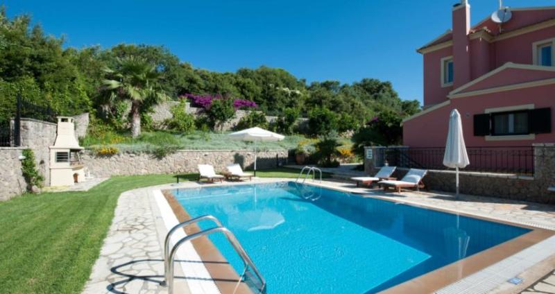 Discover the best of Corfu Island scenery and style at Il Tesori Dassia Villas . Set on hill near the beach of Dassia in the heart of Corfu, the property is set in lush gardens and welcoming Corfiot-inspired design. Four bedrooms in each Villa can accommodate up to 10 guests, but larger parties can reserve neighboring Villas for more space. The complex is combined by 3 Luxurious Villas all complemented by private pools. Total can accommodate a party of 30 people. Each Villa is set in two seperate levels , each level features a fully equiped kitchen , living room and two bedrooms ( total each villas has 2 kitchens, 2 living rooms , 4 bathrooms , 4 bedrooms). Also kindly note that each Villa also has a private pool with wooden sunloungers with Umberellas and BBQ in the private garden area.