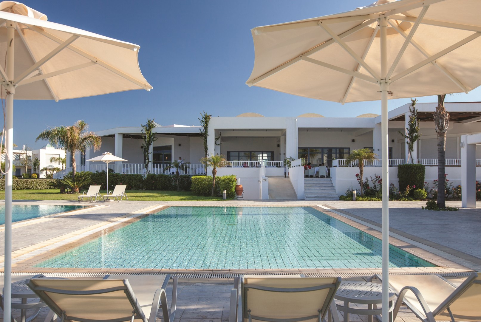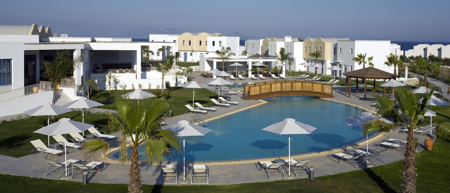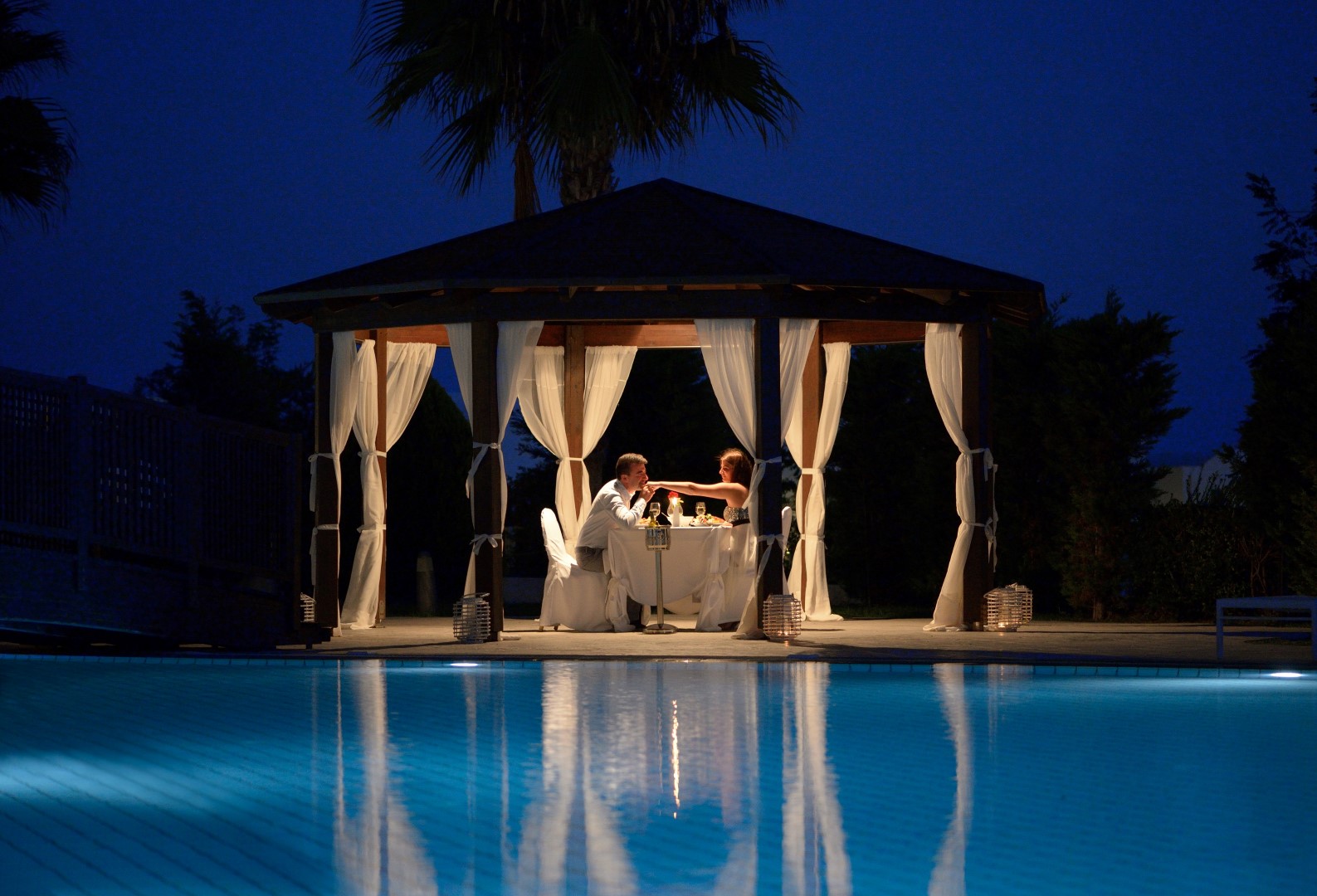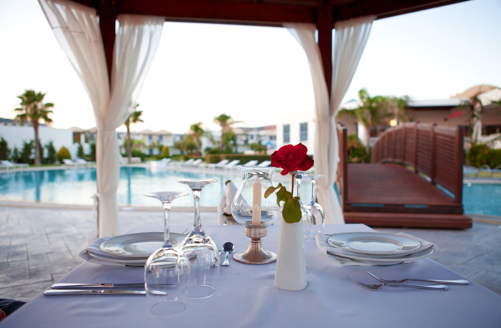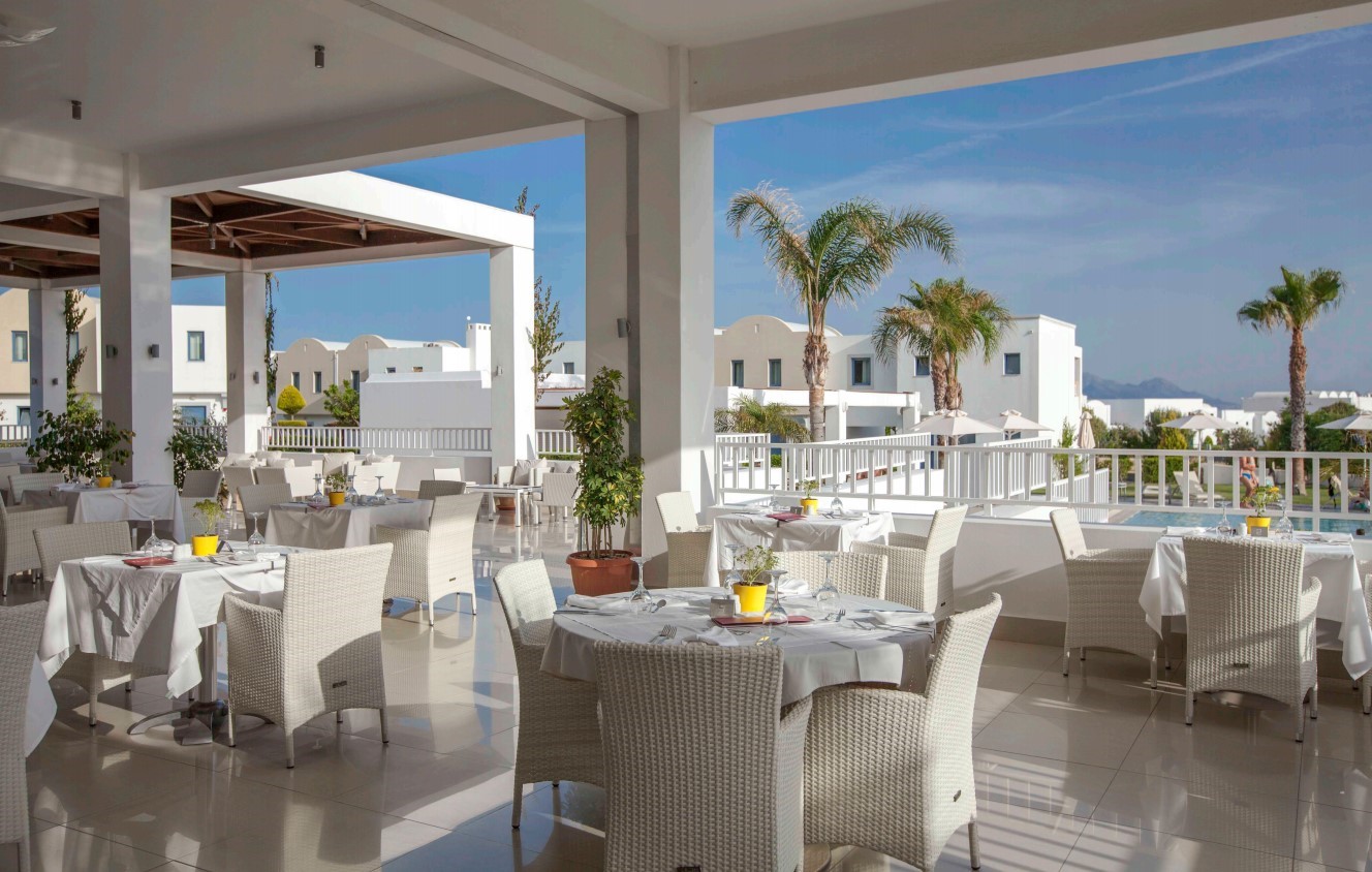 The restaurant of Lakitira Suites serves Greek and international dishes in an outdoor dining area overlooking the pool.