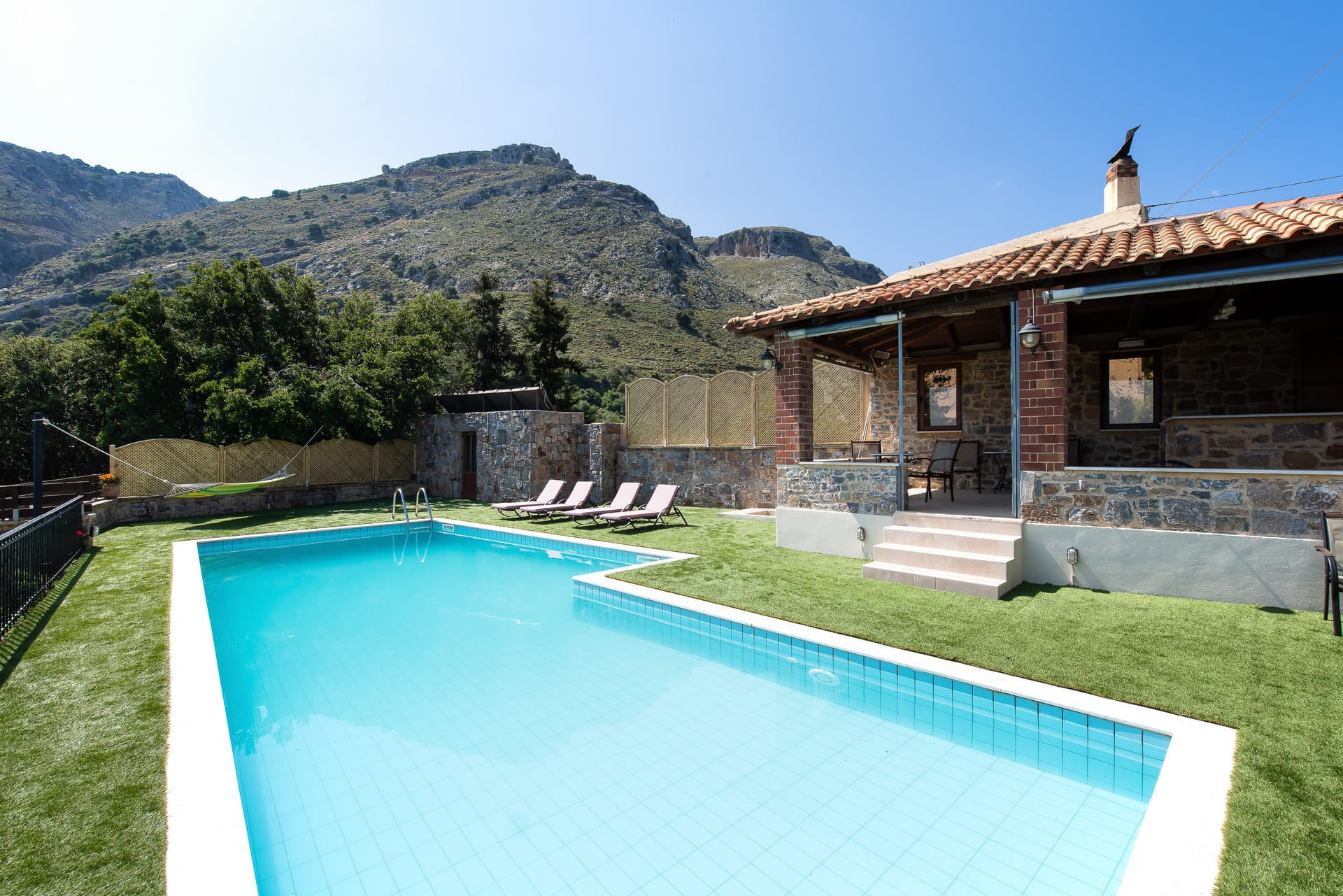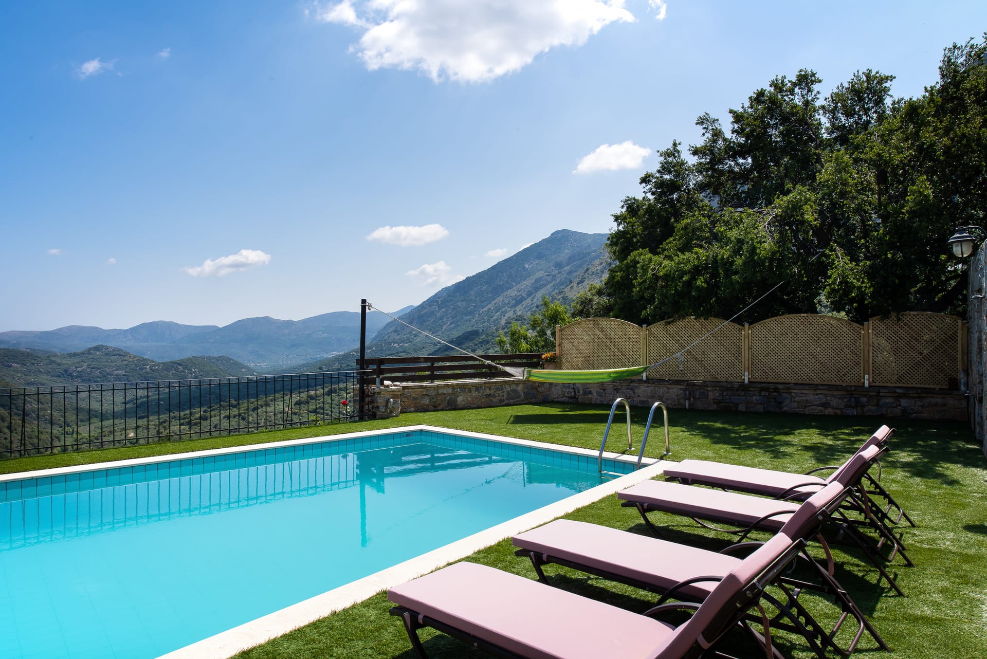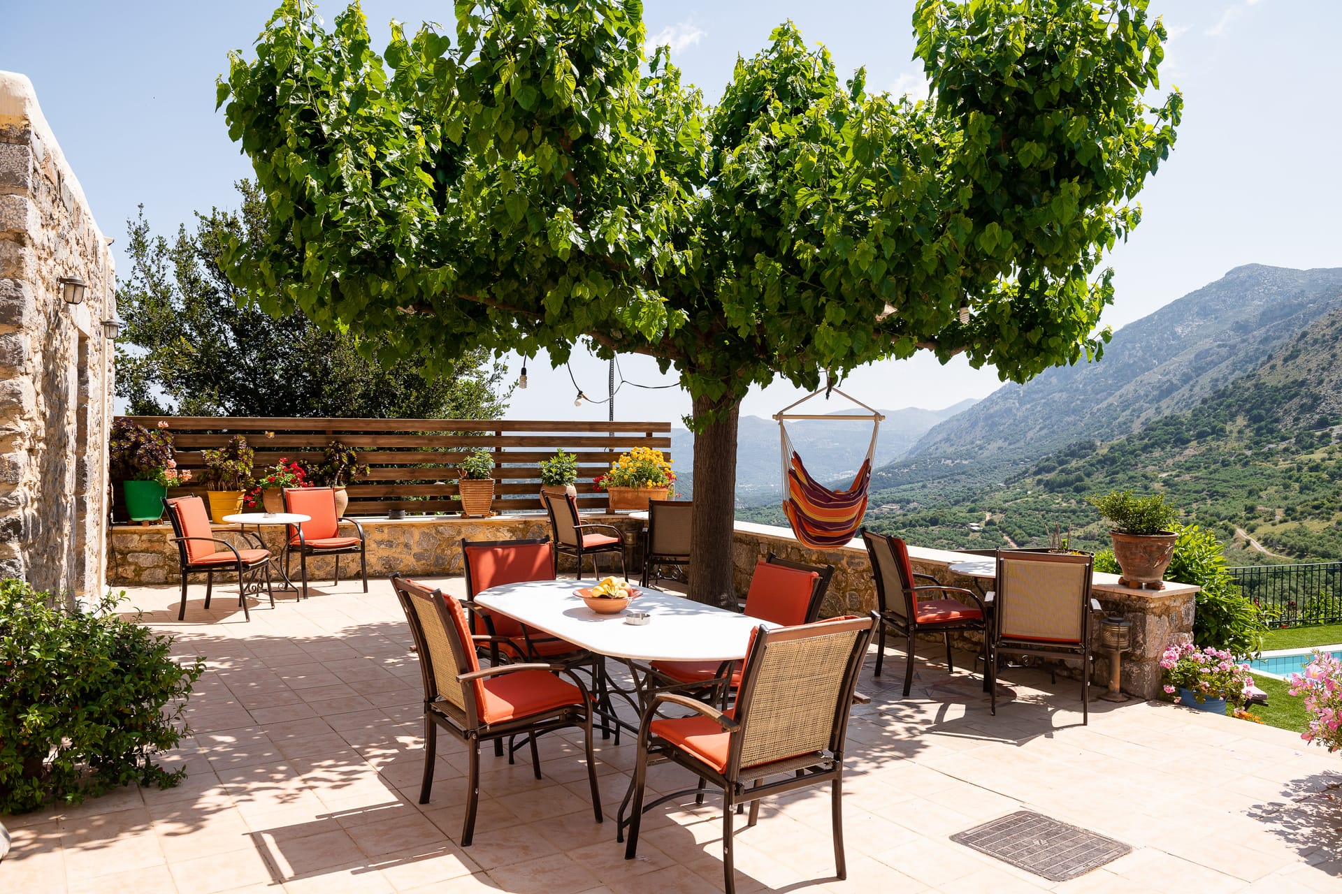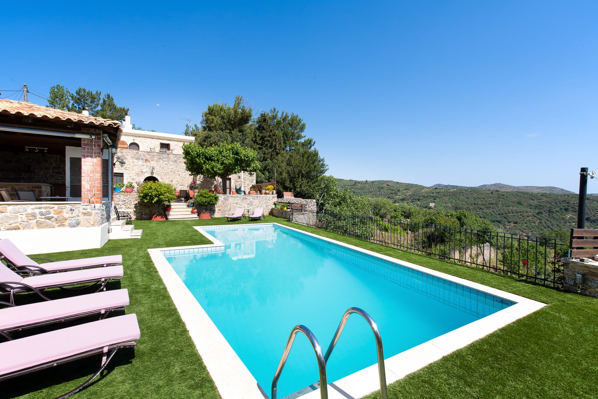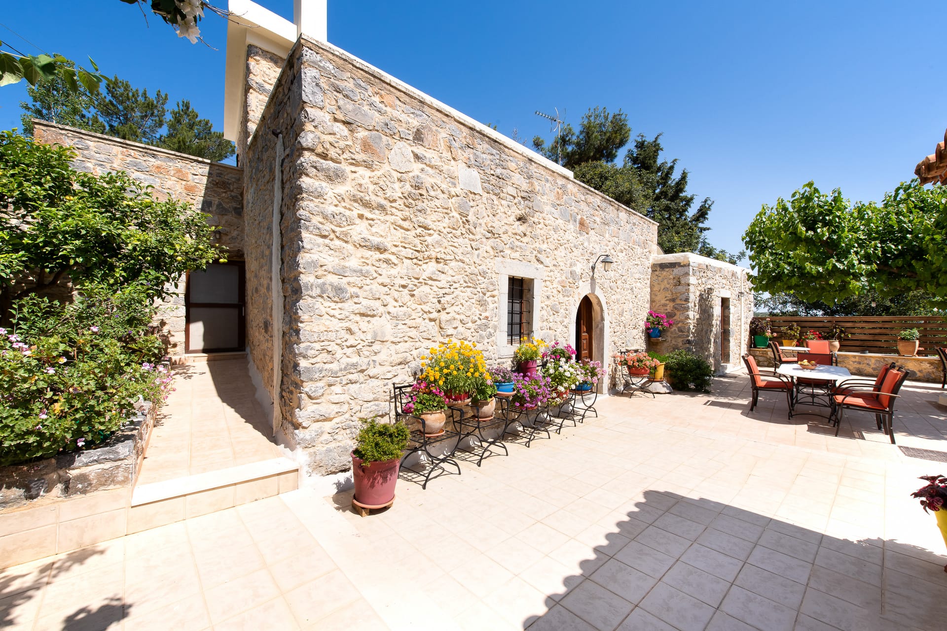 We "gave life" to a traditional 600 years building. All rooms are comfortable and fully equipped covering your every need. The house has 3 bedrooms in total (two of them have a fireplace). Each has independent central heating, air conditioner, living room, plasma TV, bathroom, and refrigerator. The Villa has free WiFi, a central living room with a seating area, a fireplace and dining area, a modern and fully equipped kitchen, toilet. Large outdoor courtyard with views of the surrounding mountains that will fascinate you. Features a traditional wood-fired oven and grill. On another level are the swimming pool, the outdoor bar, toilets, and showers. Quiet and cool mornings in the summer in the flower-filled courtyard under the shadow of the trees. Cool lunchtimes by the pool and relaxing on sun loungers. Beautiful, relaxing, or romantic evenings in the courtyard with friends or family. And the winter enjoys unforgettable evenings around the fireplace, home-cooked food, and treats always well-cooked with traditional Cretan food ingredients in the dining room under the great arch in the central lounge.