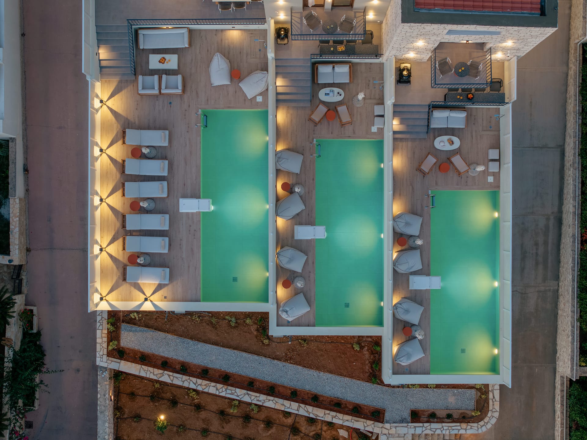 Mirroring the spacious design of Villa Quercus, Villa Platanus also welcomes up to 8 guests in four bedrooms across three levels. On the first floor are a queen-size bedroom and a twin bedroom, while the loft features a bright and airy queen-size room. The basement provides an additional twin bedroom, ensuring privacy for all guests. With a thoughtfully designed living space, full amenities, and direct access to its pool and garden area, Villa Platanus is perfect for groups who value both style and space.