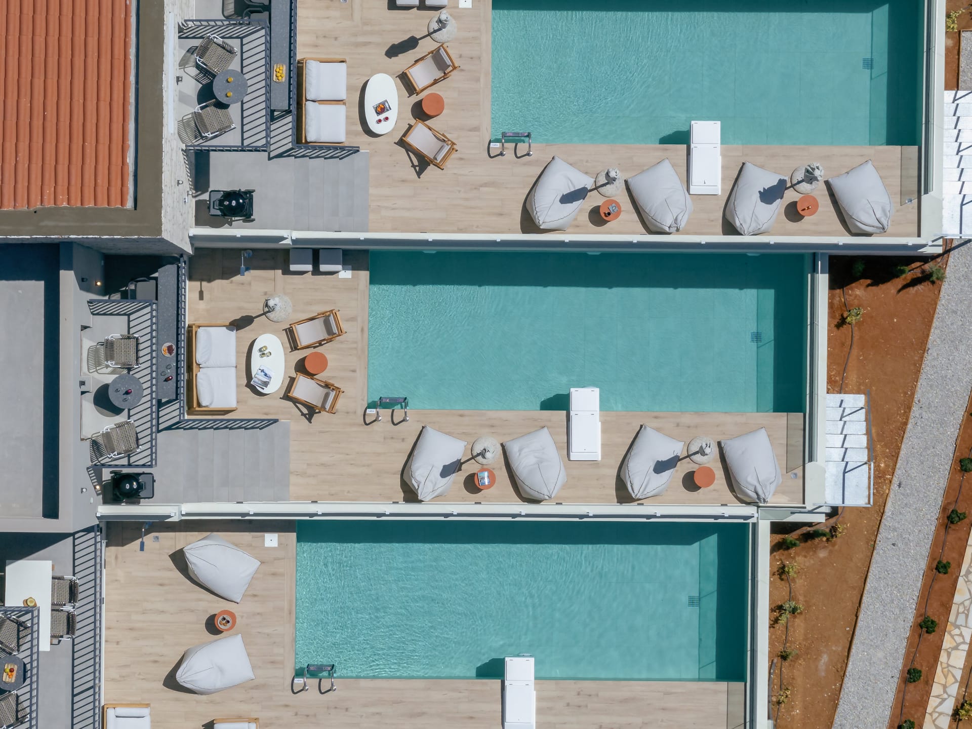 Inside, all three villas feature stylishly furnished living rooms, flat-screen TVs, high-speed Wi-Fi, and air conditioning throughout. Guests will enjoy fully equipped kitchens with high-end appliances, and everything needed to prepare meals with ease, whether dining indoors or beneath the stars.