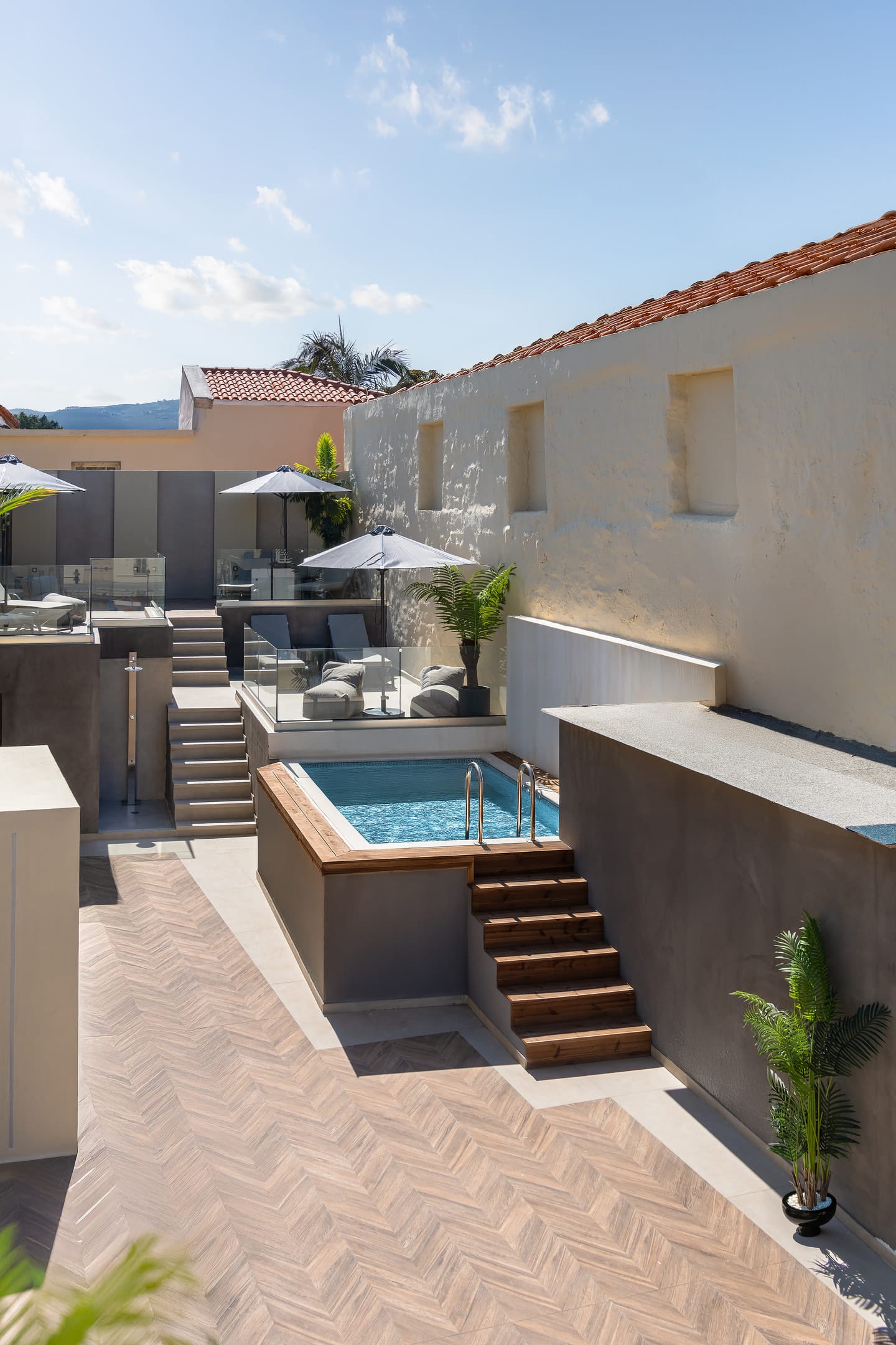 All suites feature private indoor jacuzzis, inviting you to unwind in absolute comfort, while one exclusive suite offers the ultimate indulgence — a private courtyard with its own pool, where tranquility meets intimacy beneath the Cretan sun.