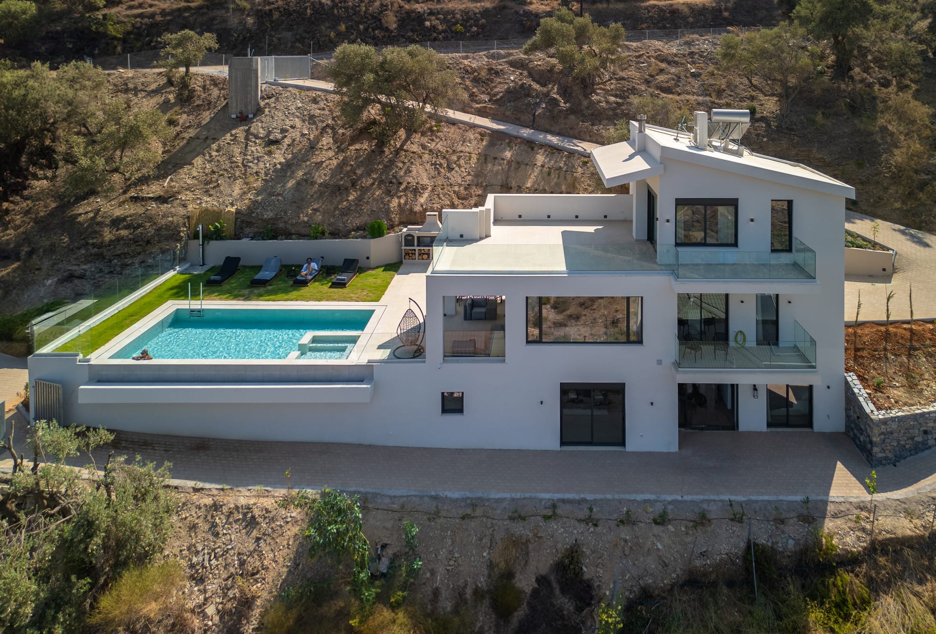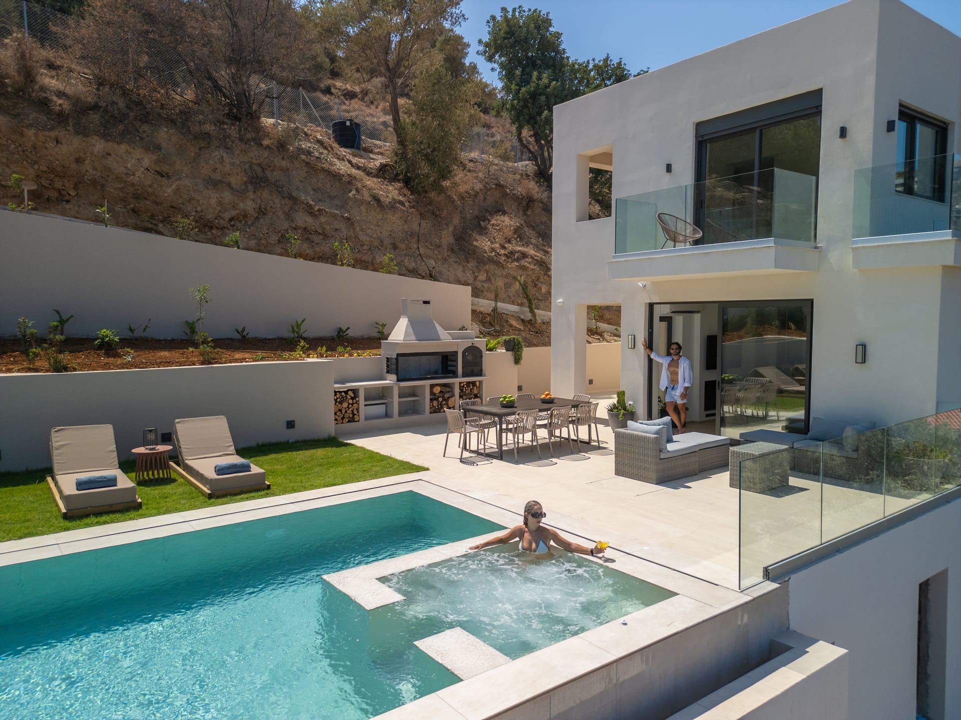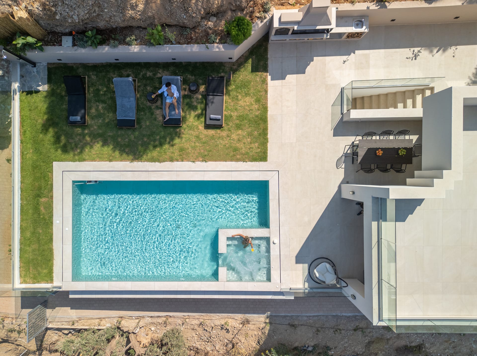 Villa Vie Spanning 200 square meters, Villa Vie boasts 4 elegant bedrooms, each with its own ensuite bathroom, providing ample space and privacy for all guests. The villa features a spacious open-plan living area with a fully equipped kitchen, a cozy fireplace, and floor-to-ceiling windows showcasing breathtaking sea views. Step outside to the expansive terrace, where you’ll find an infinity pool with hydromassage, an outdoor BBQ area, and plenty of space for sunbathing or al fresco dining under the stars. High-end amenities such as a home cinema, office space, mini bars, and a KNX smart home system ensure you have everything you need for a luxurious and relaxing stay.