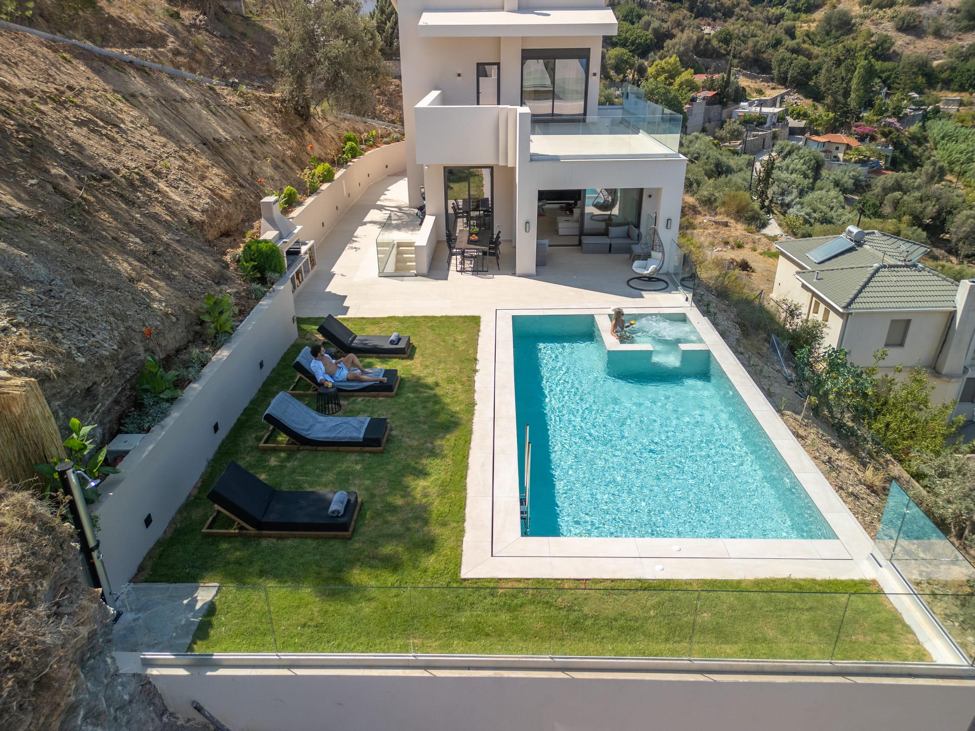 Villa Verde Slightly larger at 205 square meters, Villa Verde mirrors the elegance and luxury of Villa Vie, with 4 beautifully appointed bedrooms, all featuring ensuite bathrooms. The villa’s modern design seamlessly blends indoor and outdoor living, with expansive windows and a 64 square meter terrace offering panoramic views of the Aegean Sea. Like Villa Vie, Villa Verde comes with a private infinity pool, hydromassage feature, and an outdoor BBQ area for memorable evenings with loved ones. Inside, you’ll enjoy state-of-the-art facilities, including a home cinema, office area, walk-in closets, and a fully equipped kitchen. The villa’s smart home technology, private parking, and advanced security system ensure a safe and comfortable stay.