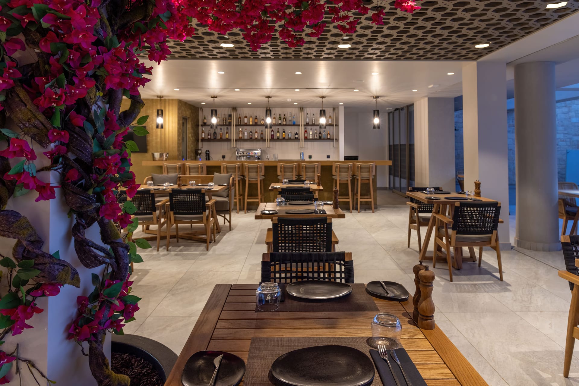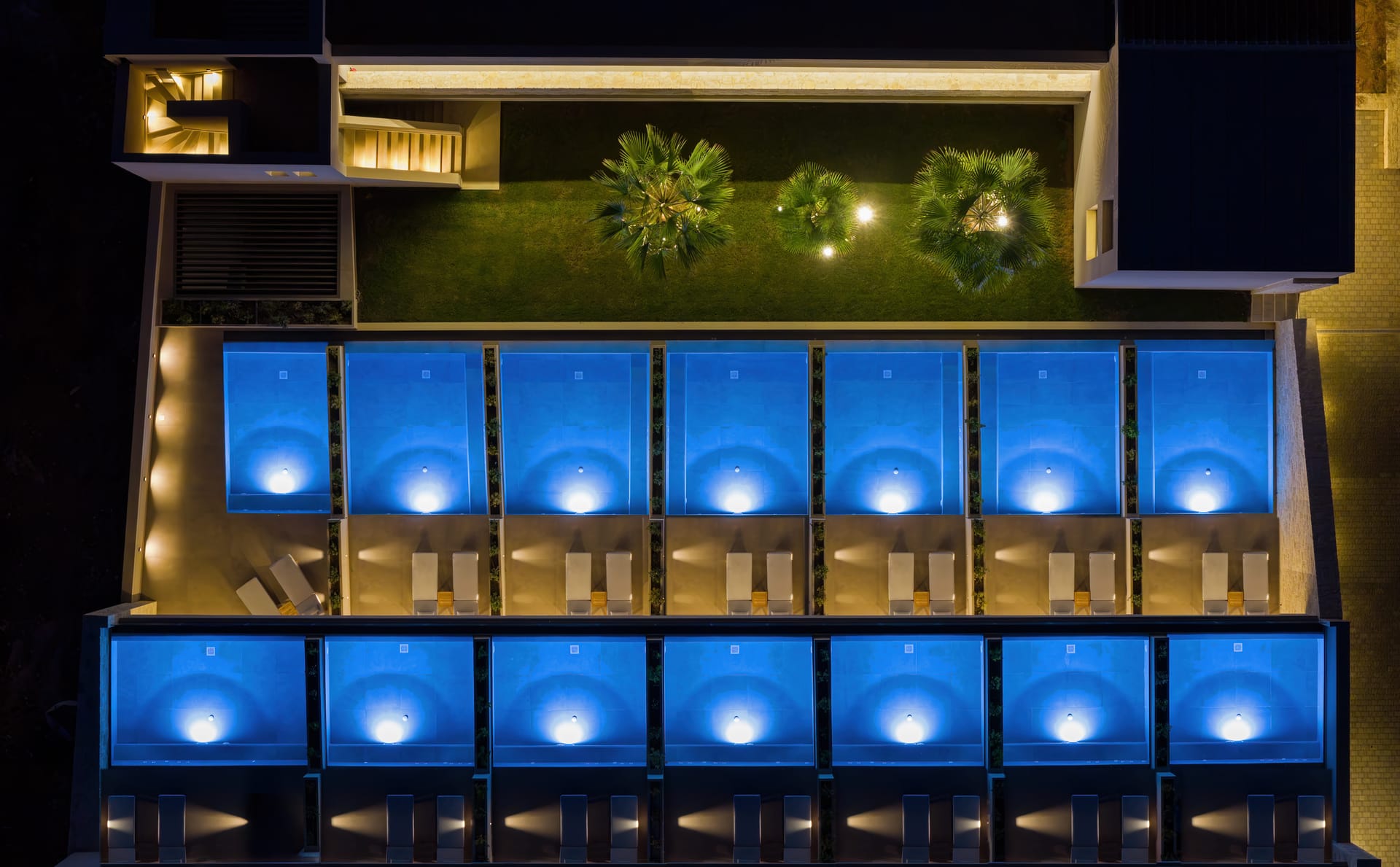 The hotel is decorated with art deco details and features gold elements in various hues to determine each suite’s category. Guests can choose from a range of luxurious accommodation options, including maisonettes with garden views and individual pools, deluxe suites with sea views, and deluxe suites with sea views and individual pools.