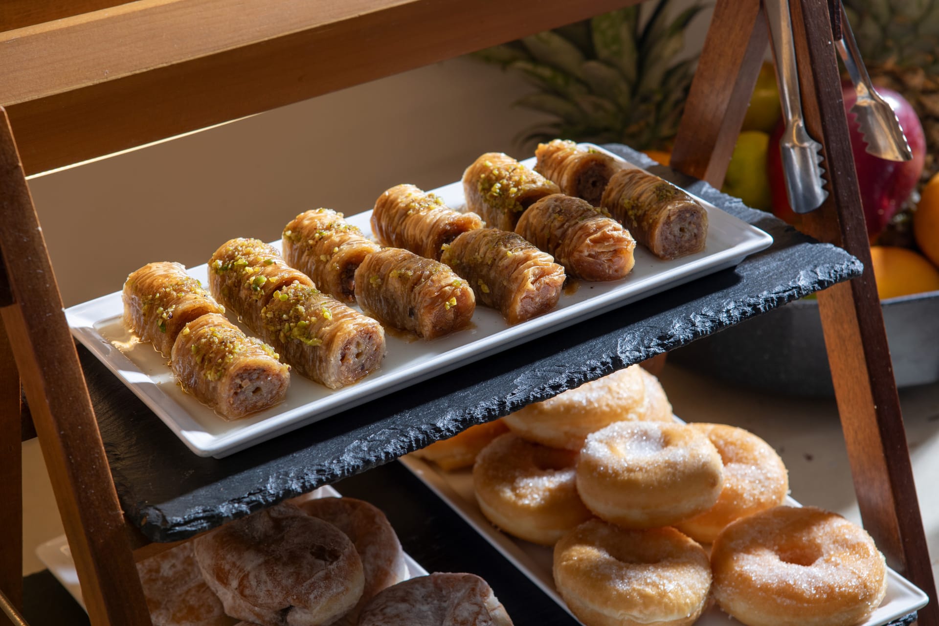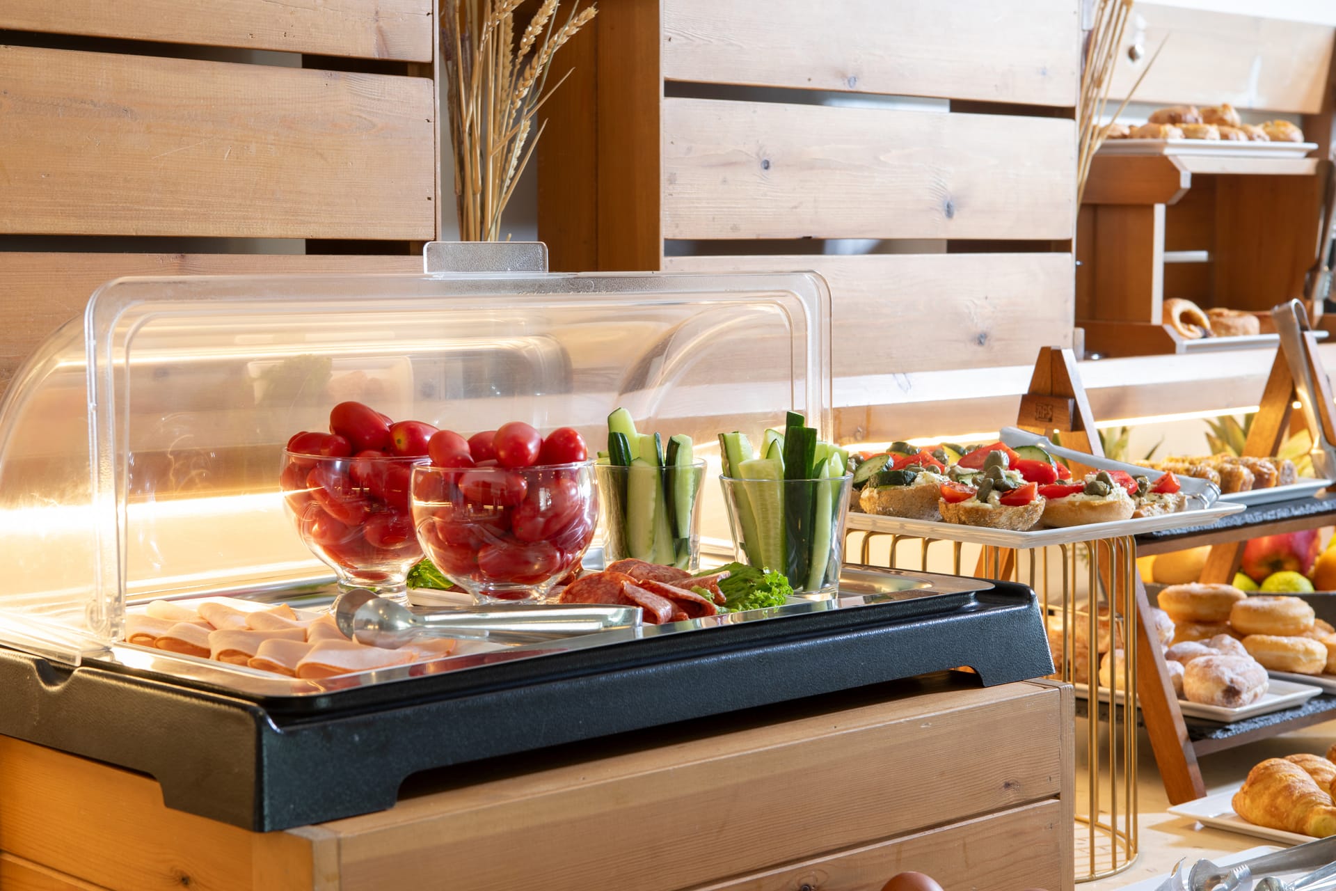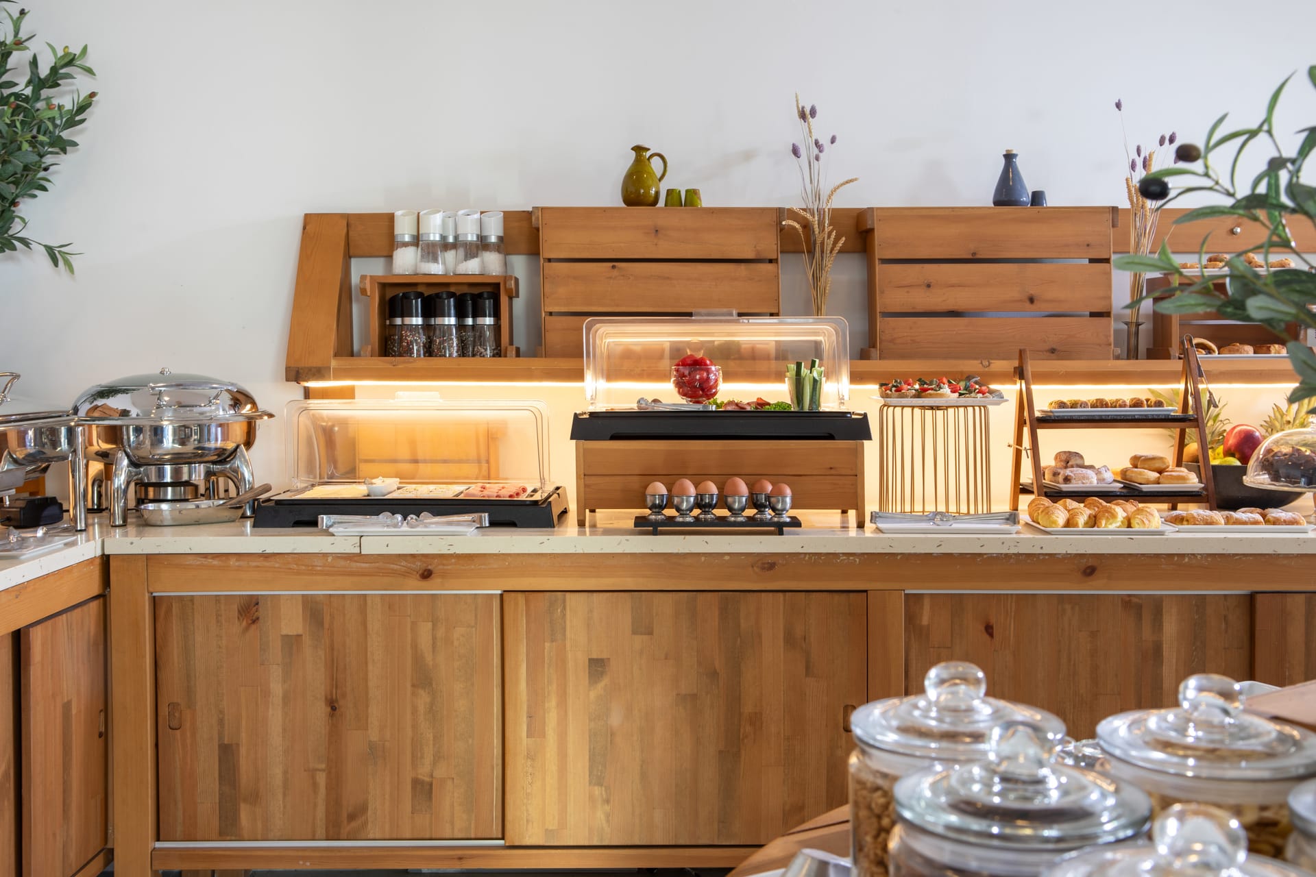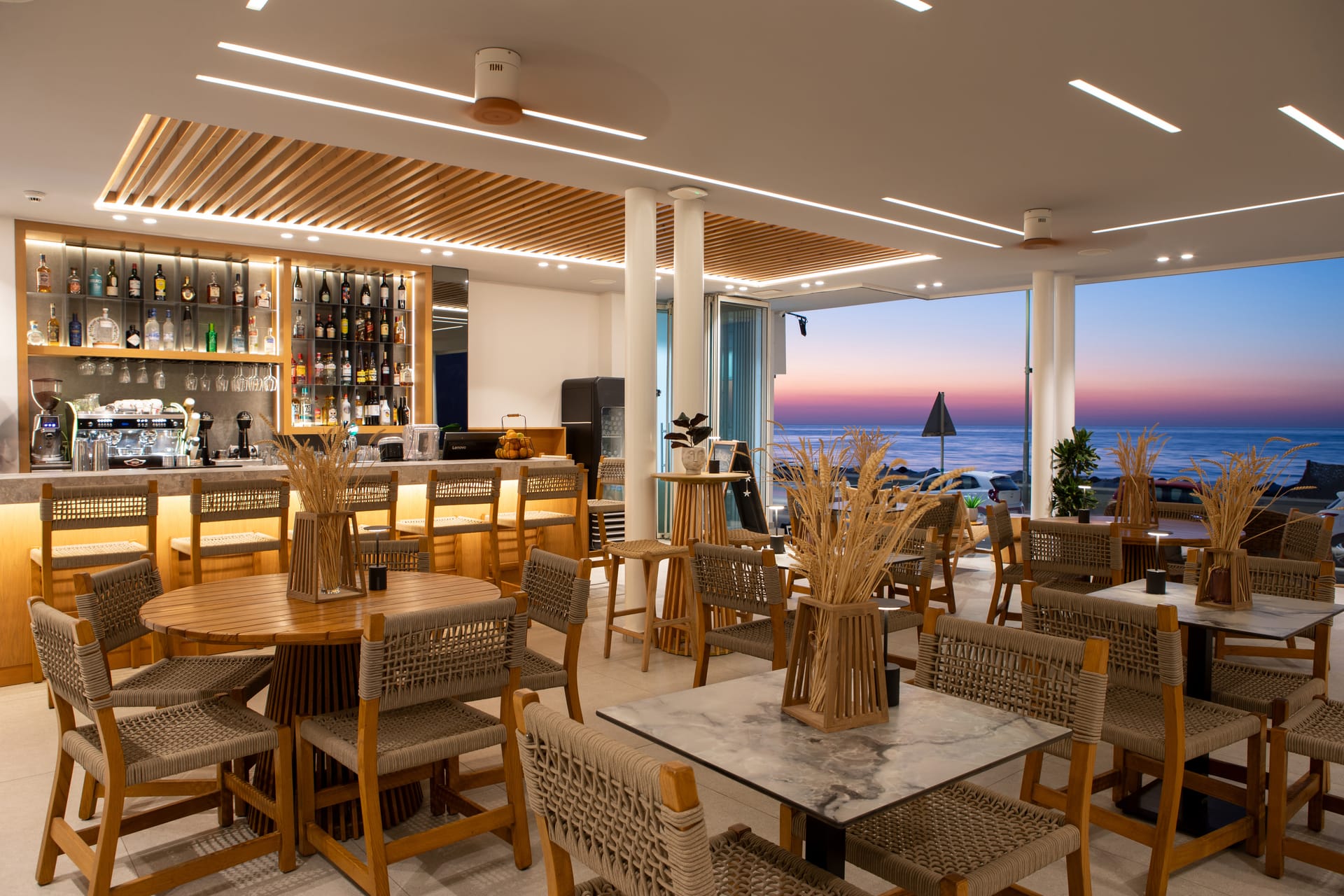 Breakfast buffet with great variety is offered in a beautiful restaurant, overlooking the sea ocean.