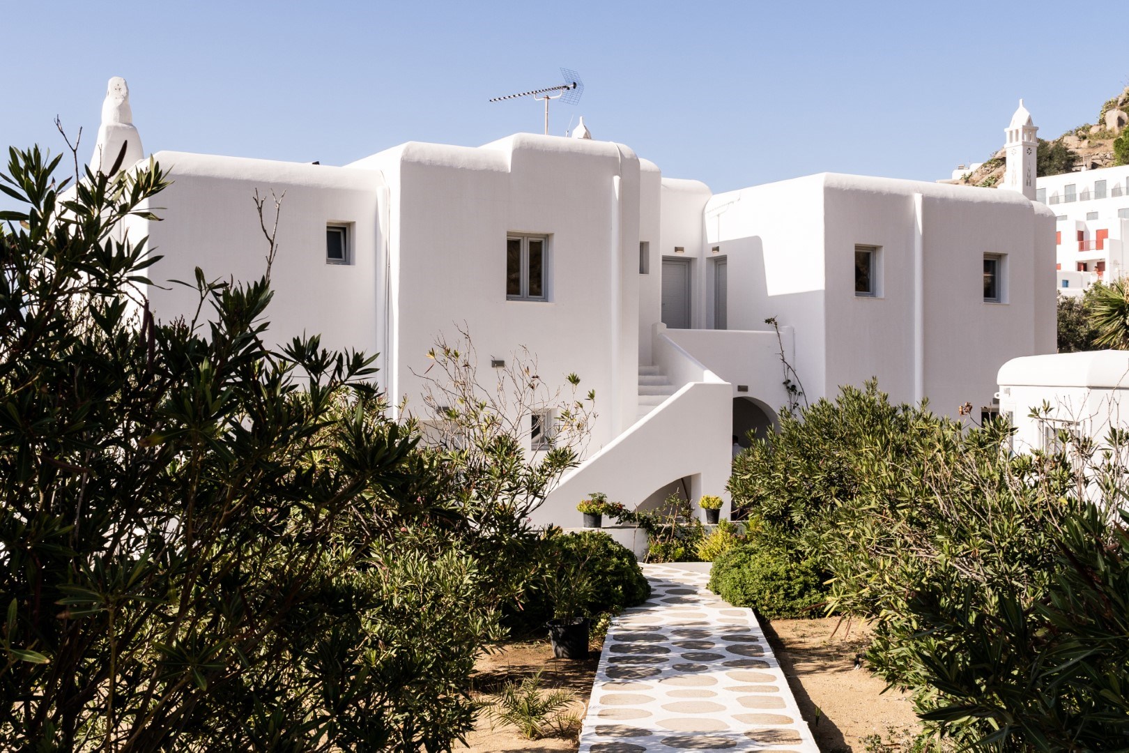 Tagoo Studios is situated on the outskirts of Mykonos Town, just a short 15-minute walk from the Town center. Our property is conveniently located close to both of the island’s two ports, and is just meters away from the nearest beach and local bus stop. It’s only 100 meters from the new Mykonos main road, from which all of the island’s famous beaches can be reached in less than 15 minutes’ driving time.