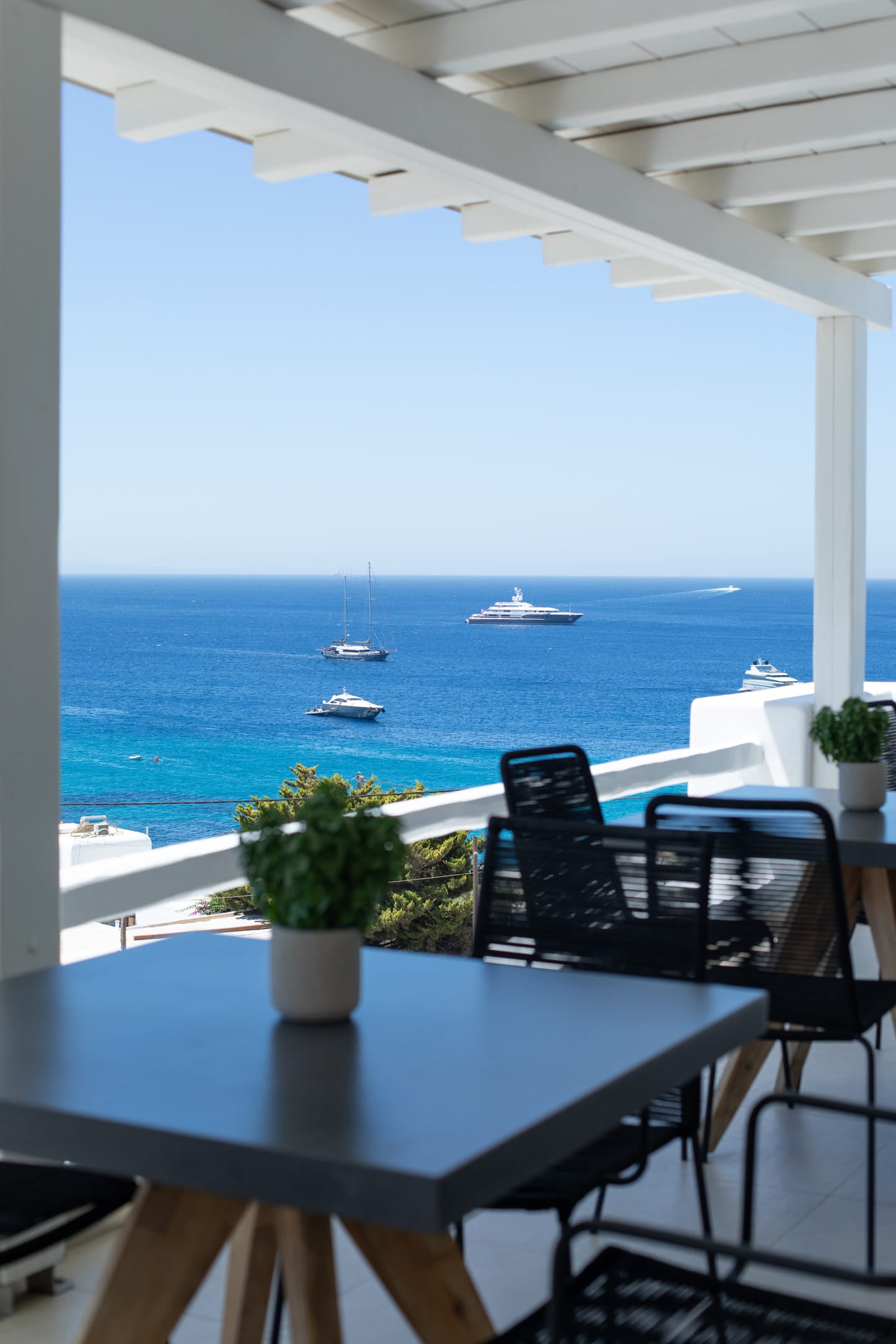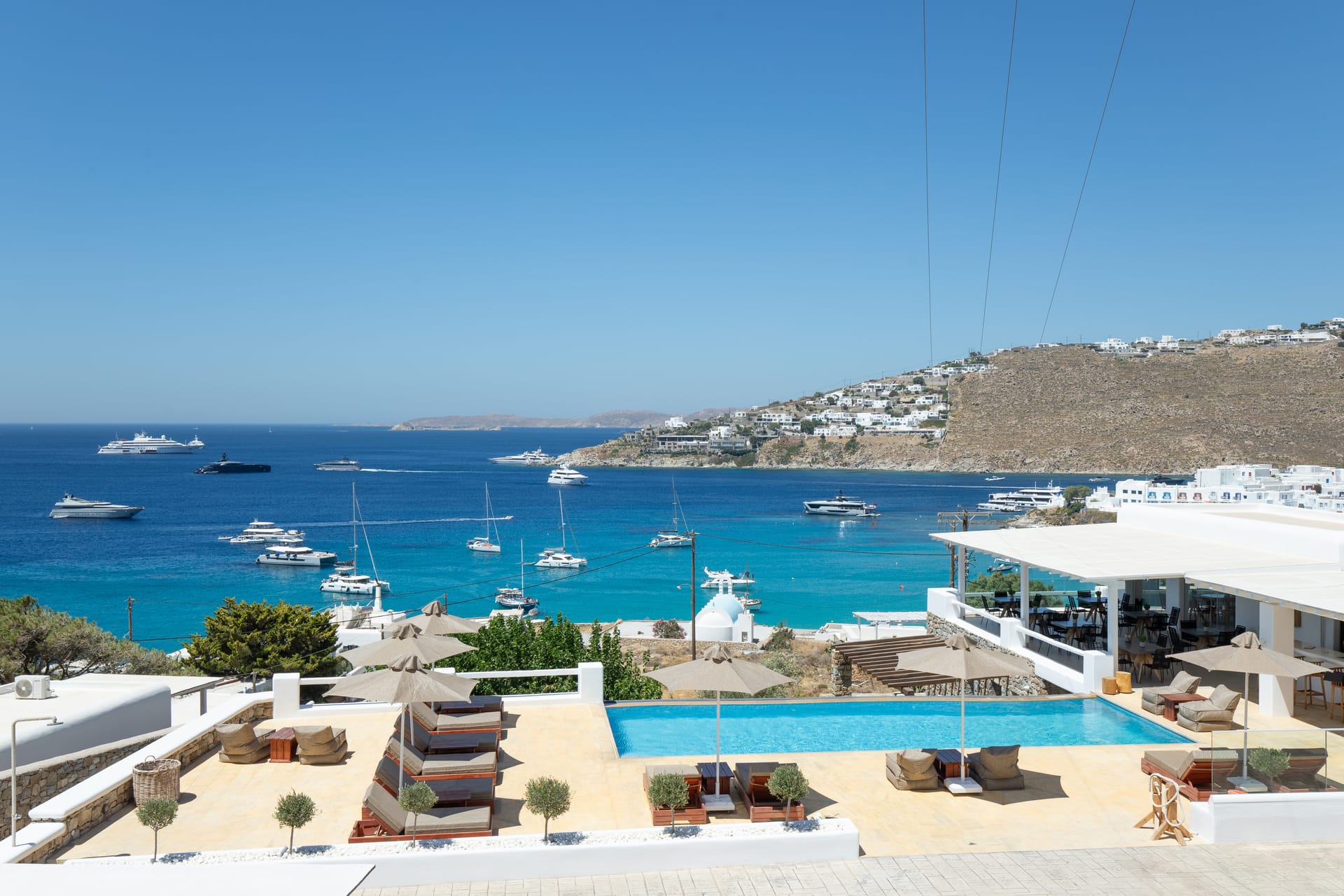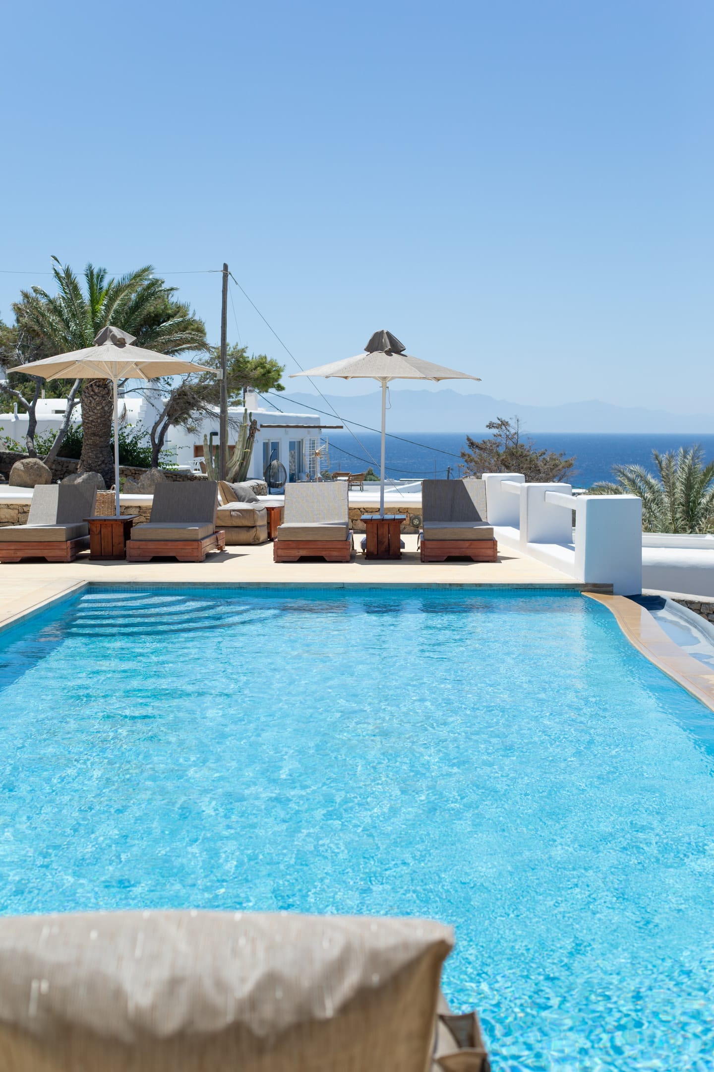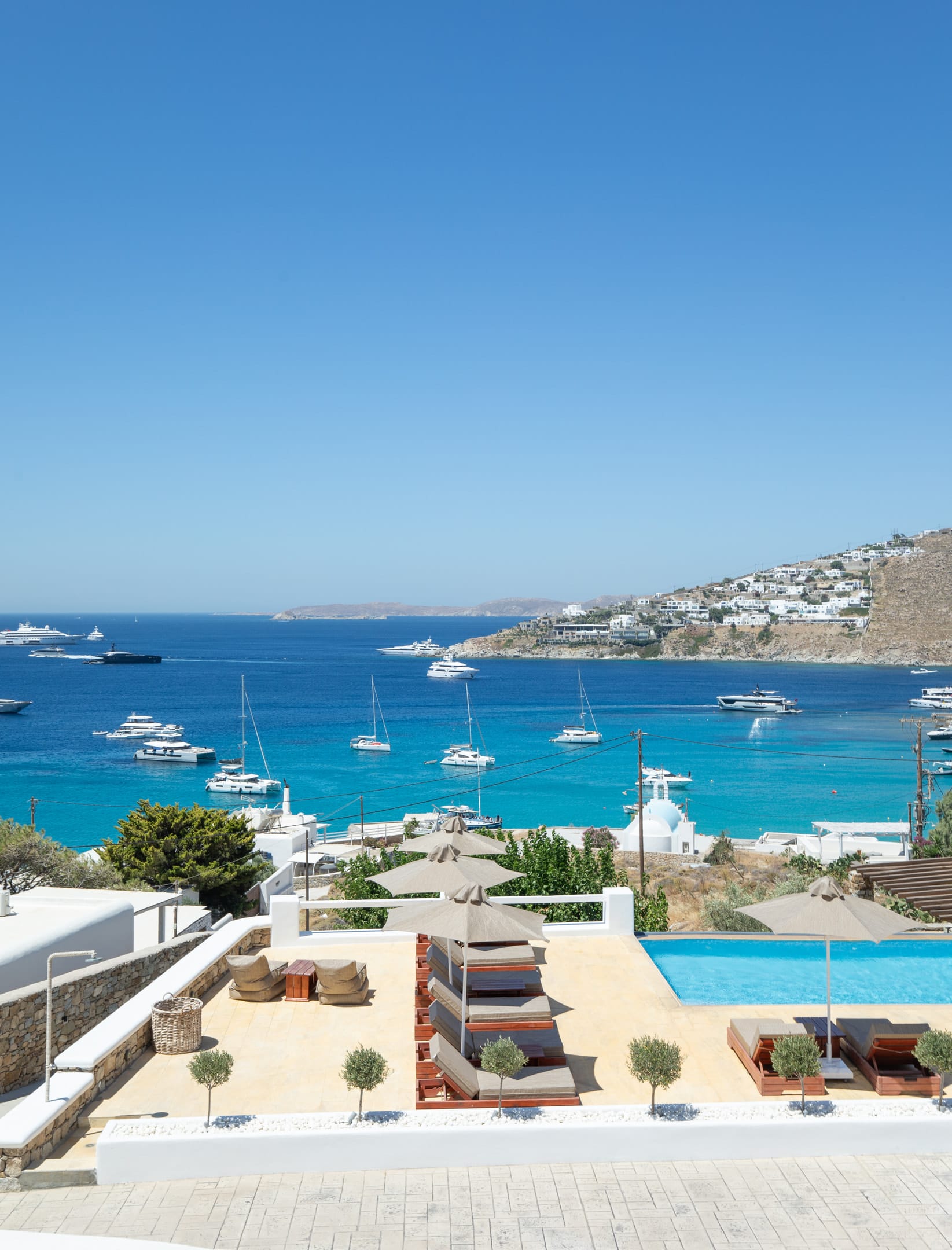 Unique and minimalist Cycladic architecture has been used in the decoration. The entire hotel areas are decorated with natural colors, stone and wood, combining elegance and comfort. The rooms and suites, as well as the swimming pool area offer a breathtaking view. The deep blue waters of the Aegean Sea, the ancient island of Delos and the magnificent neighboring islands are some of the sights enjoyed from either place.