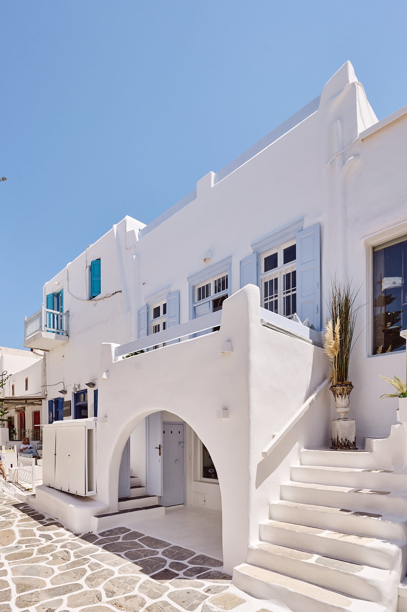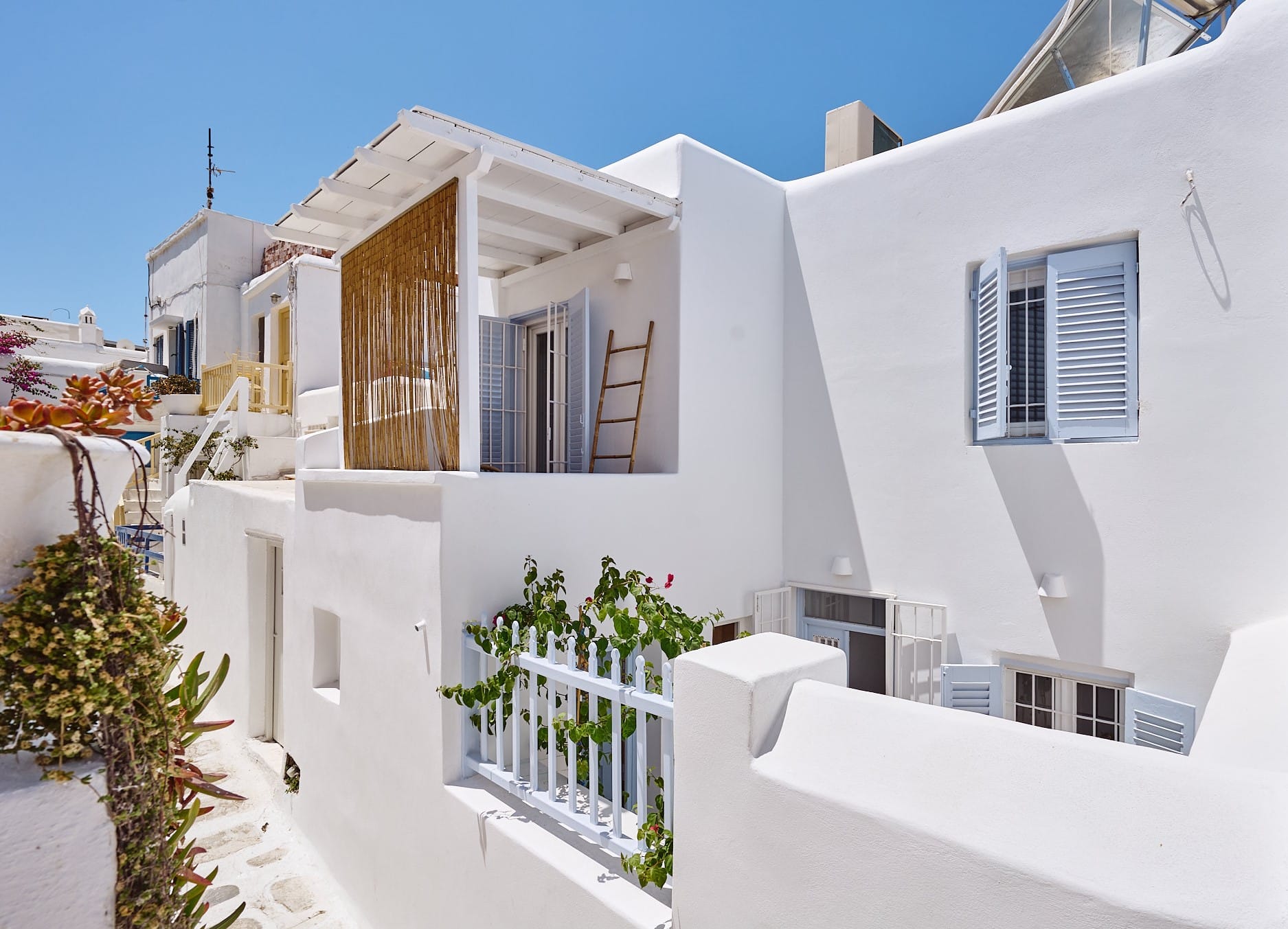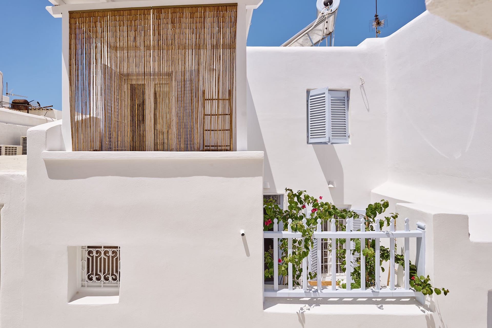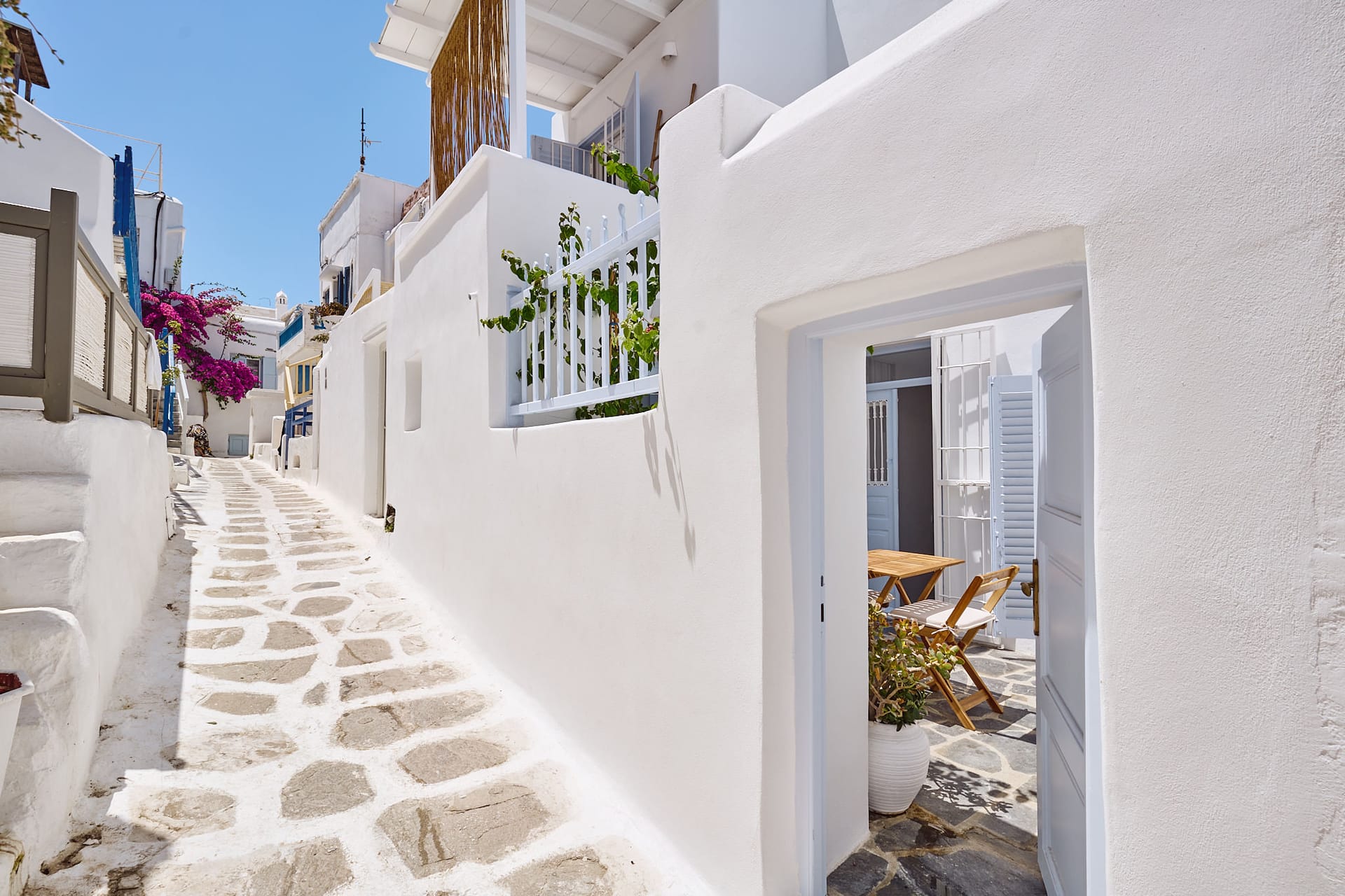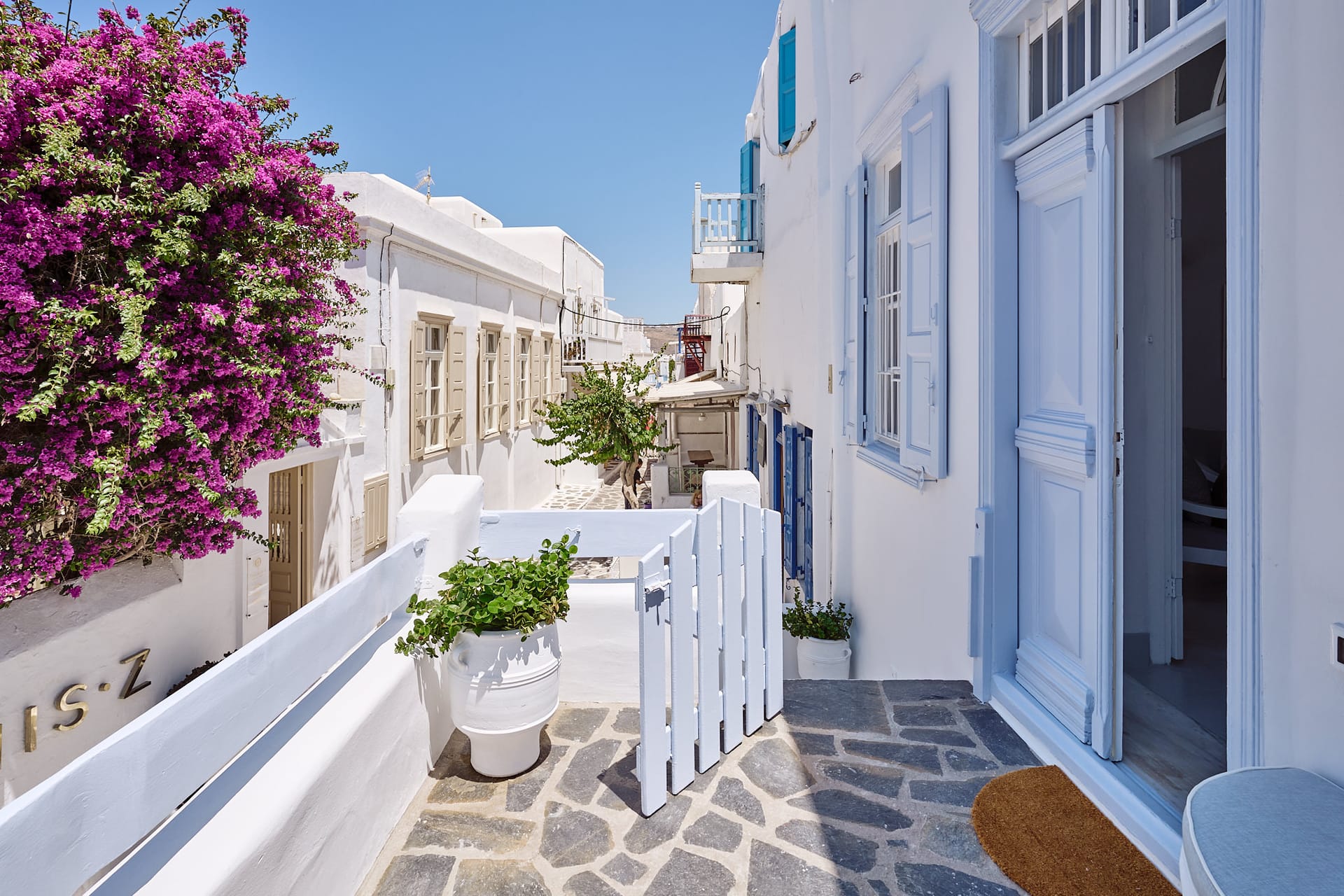 This traditional noble house, built in the late eighteenth century, is the paternal house of our grandmother Alice. Throughout her life she welcomed and entertained important personalities of the political, business and artistic life of the country. The history of the house is long and continues to this day. Today it is a fully renovated house with many elements from the periods that the house has lived. The house is centrally located in the heart of Chora (city of Mykonos), just above the Goumenio Square, in one of the most commercial roads and just seconds away from the famous Matogianni street. The house has the unique privilege of an amazing view , as from its veranda can be seen the roofs of the traditional houses of the country while the sea behind them dominates the delos, tinos, tourlos (new port) as well as the famous island of Bao, where when evening is accompanied by the sunset and its riveting colors. You can also enjoy the view by swimming in the jacuzzi located on the veranda. Keep in mind that it is the best choice if you want to avoid driving to the island as it is 1 minute away from the restaurants, bars, supermarkets, shops, bus stop and taxi rank of Chora. Although located a few meters away from the main attractions of Chora (Windmills, Little Venice), it is in a neighborhood that is little affected by the noise of nightlife. This mansion house is an ideal accommodation for families or groups who want to live in the heart of Mykonos.