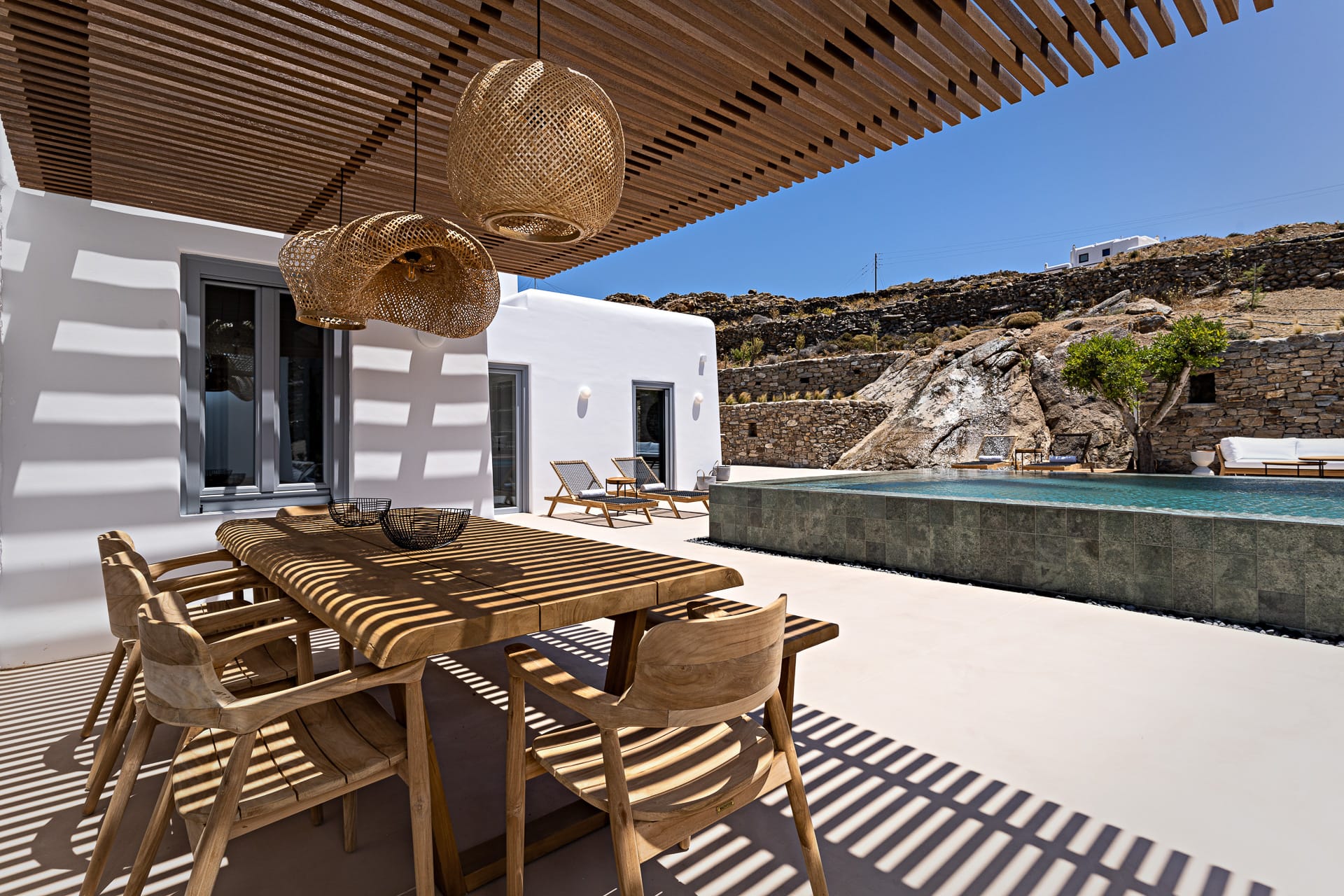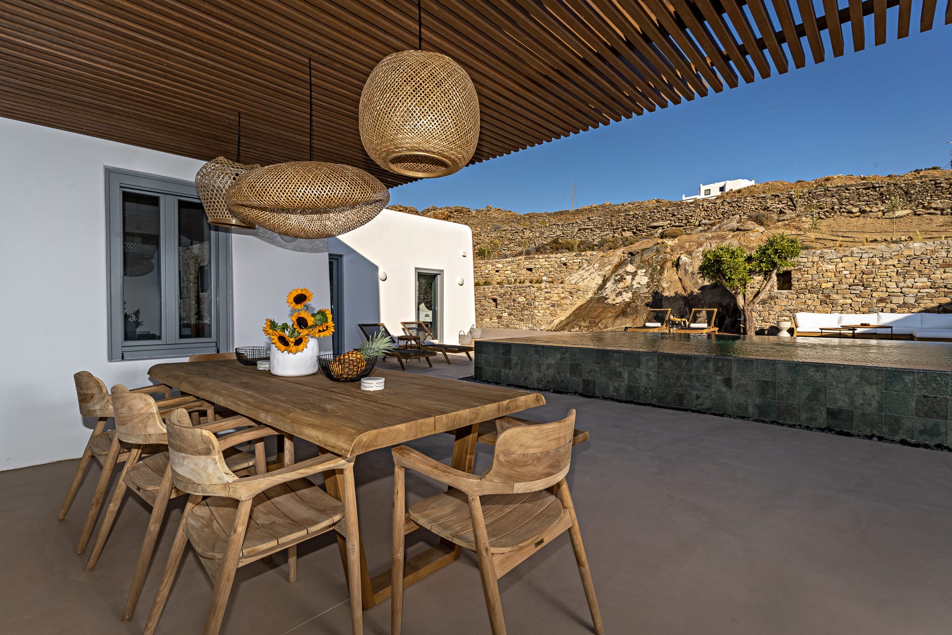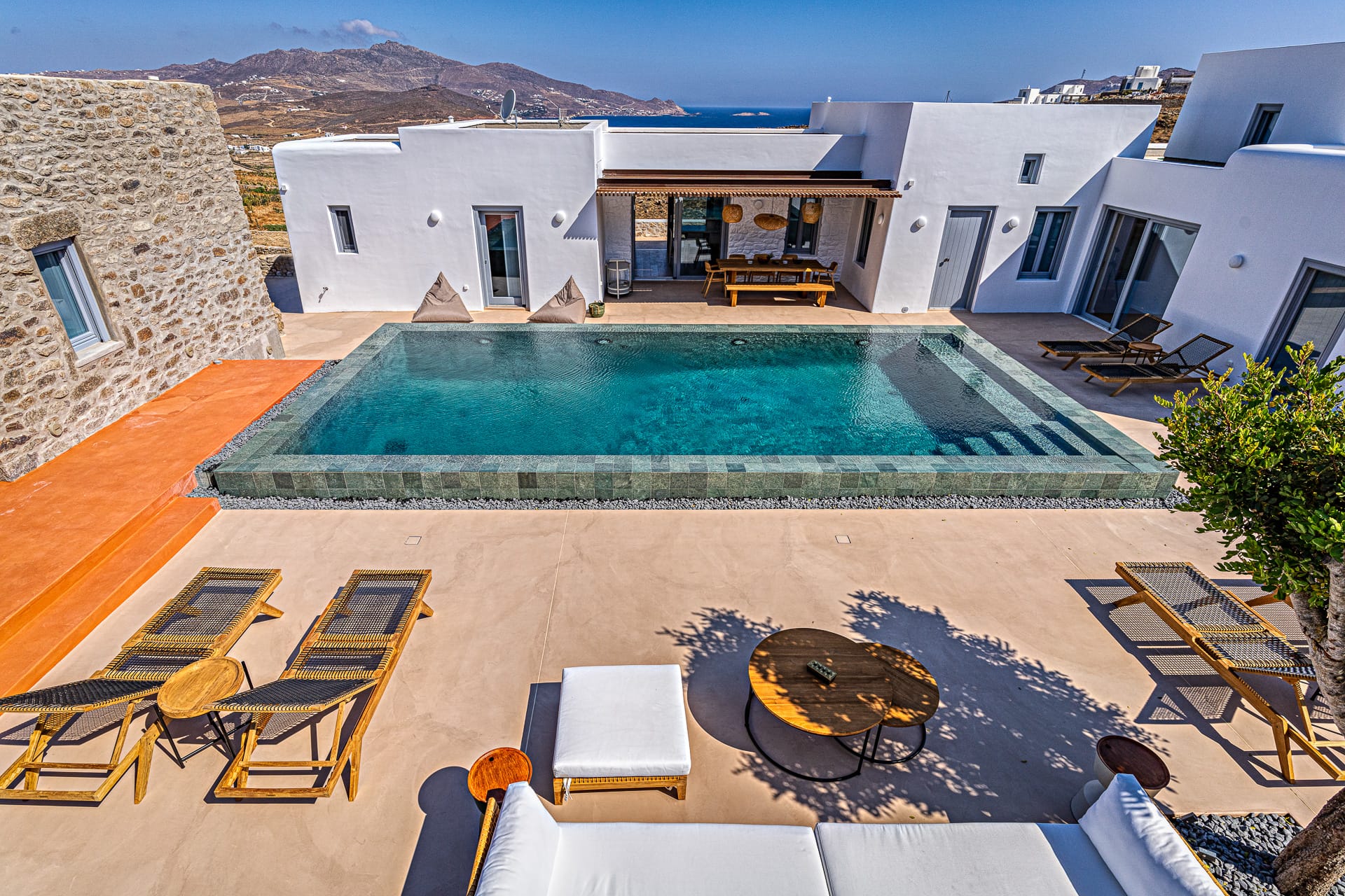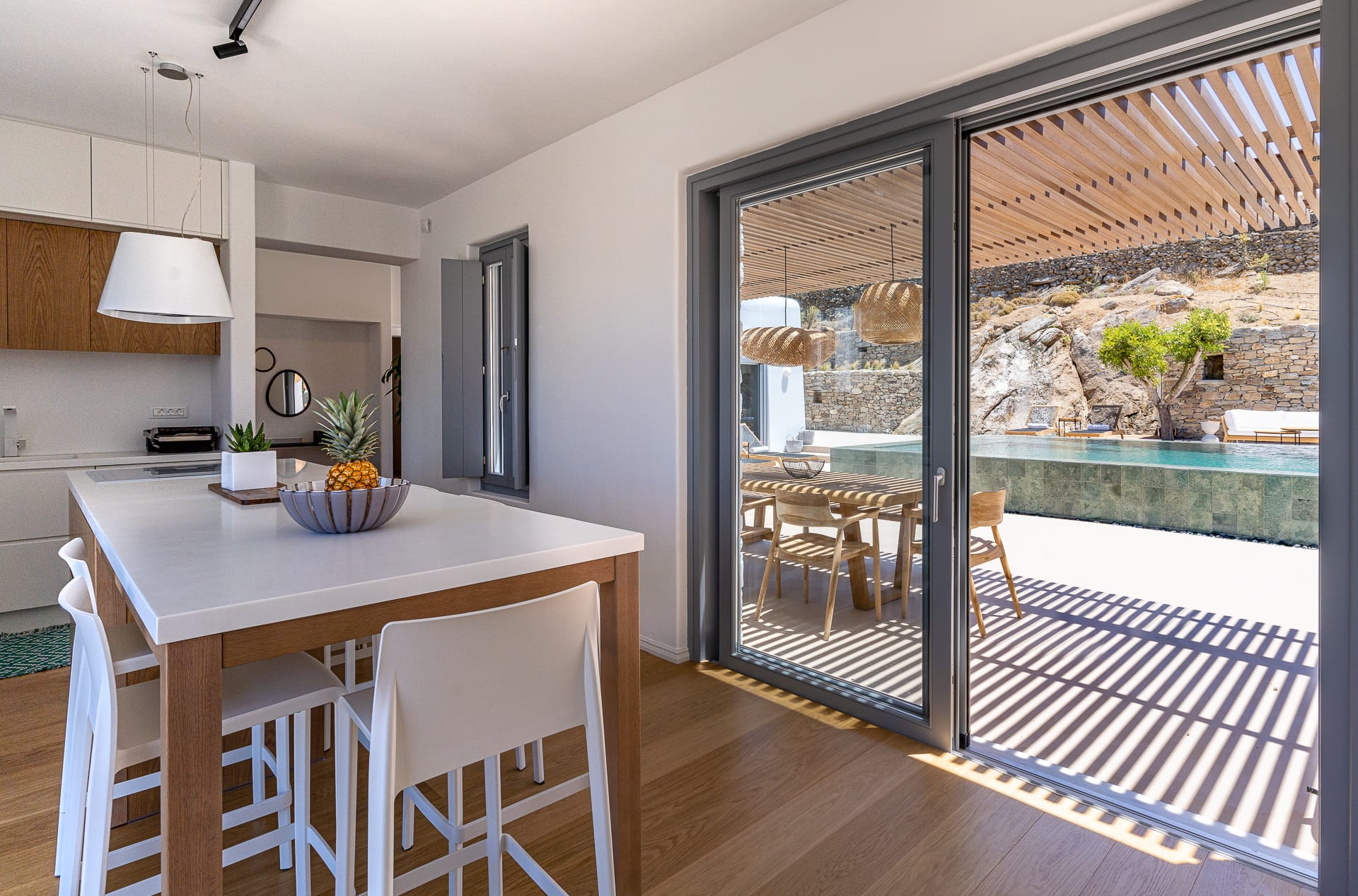 Ftelia, is the most ideal beach for windsurfing, kitesurfing and swimming, but also an excellent spot for quality food, drink and concept beach activities at the beach bar Alemagou. Oozing Mykonian simplicity, this luxurious house offers 3 double bedrooms with 2 en suite bathrooms, and 1 extra bathroom, as well as, an independent, contemporary equipped kitchen, fully interactive with the living room. The kitchen area, is placed in the heart of the residence, so that it can refer to both the south and north sides of the courtyard and the pool area. This everyday space with airy openings, is a “window” to the sea view and the outdoor area.