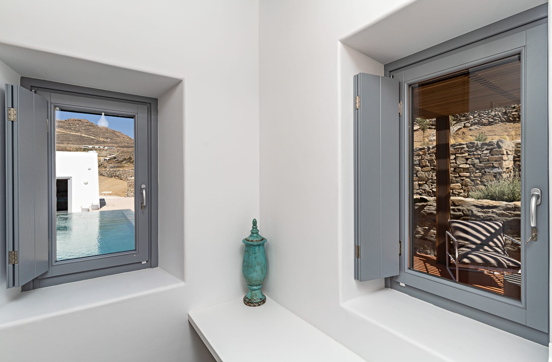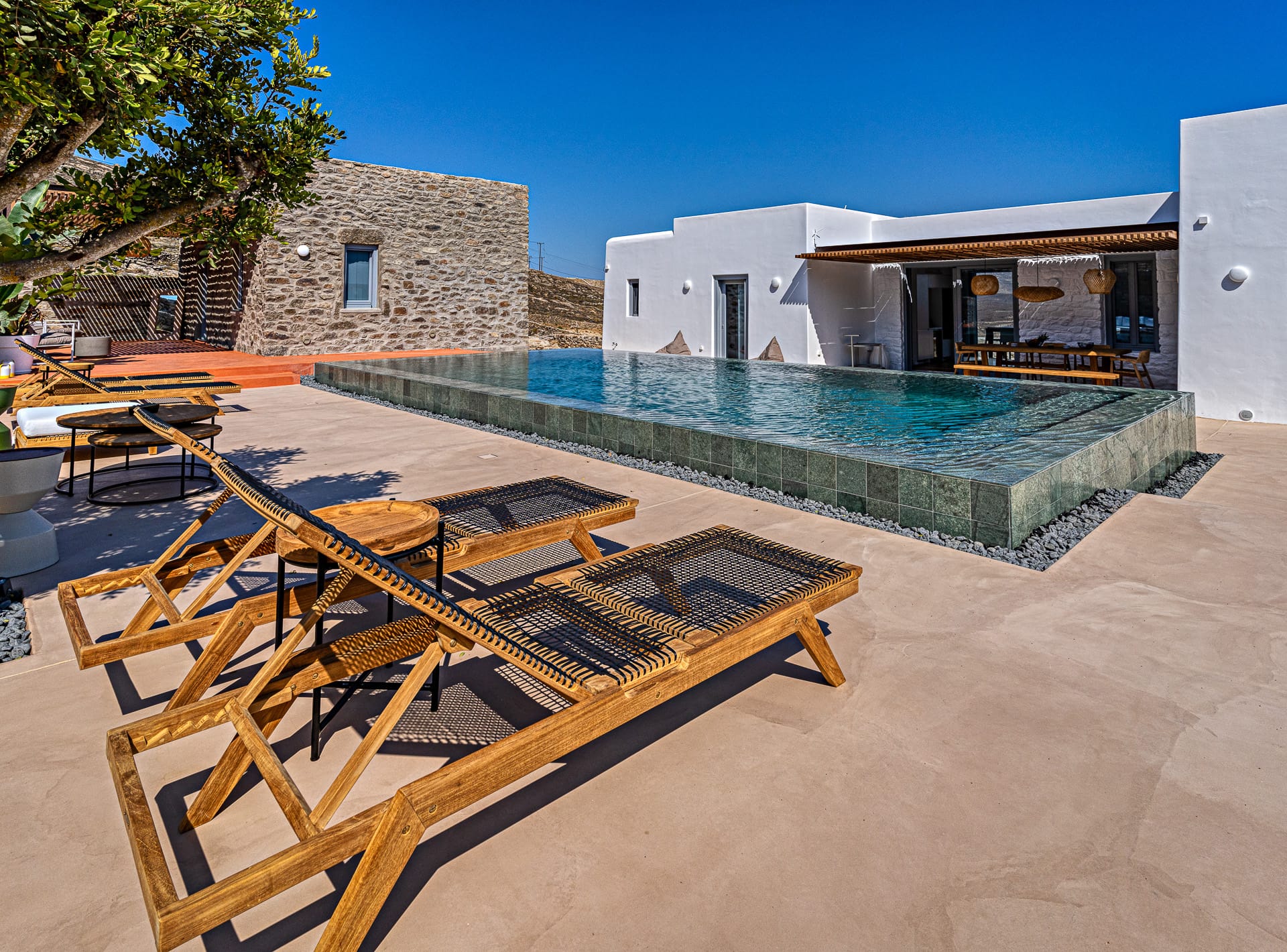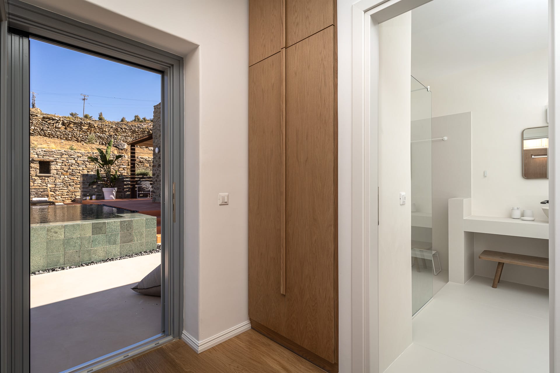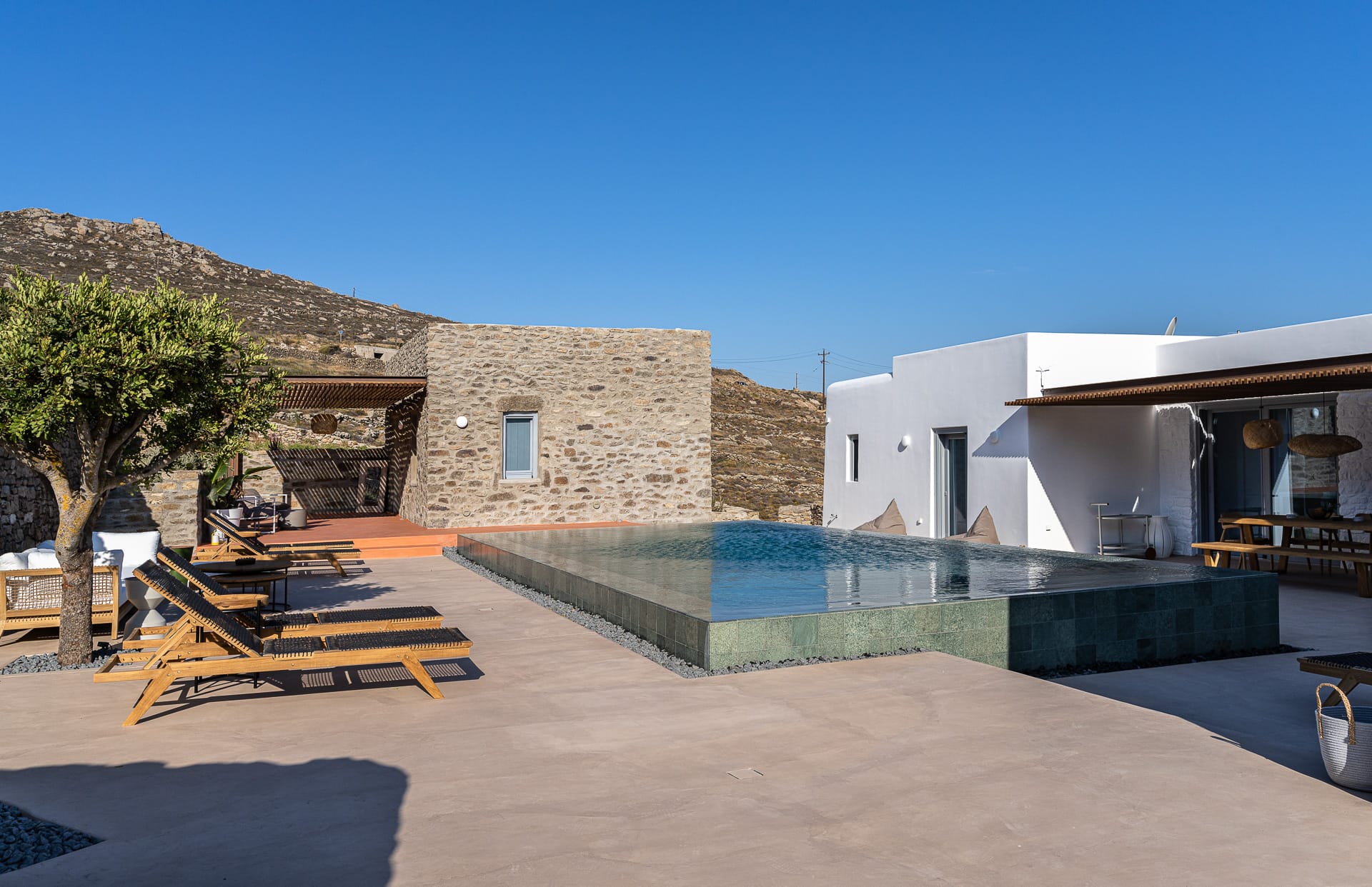 Ftelia, is the most ideal beach for windsurfing, kitesurfing and swimming, but also an excellent spot for quality food, drink and concept beach activities at the beach bar Alemagou. Oozing Mykonian simplicity, this luxurious house offers 3 double bedrooms with 2 en suite bathrooms, and 1 extra bathroom, as well as, an independent, contemporary equipped kitchen, fully interactive with the living room. The kitchen area, is placed in the heart of the residence, so that it can refer to both the south and north sides of the courtyard and the pool area. This everyday space with airy openings, is a “window” to the sea view and the outdoor area.