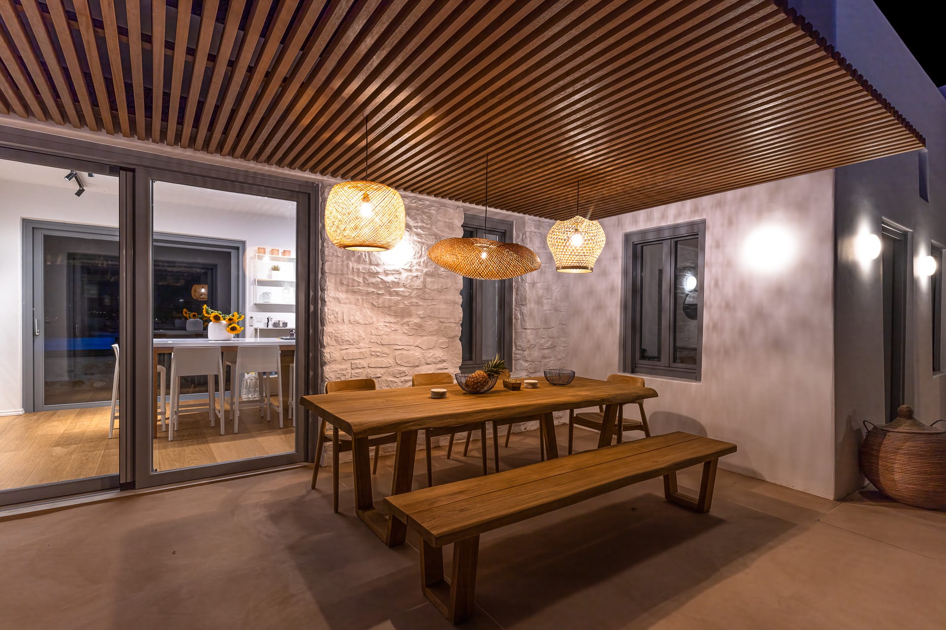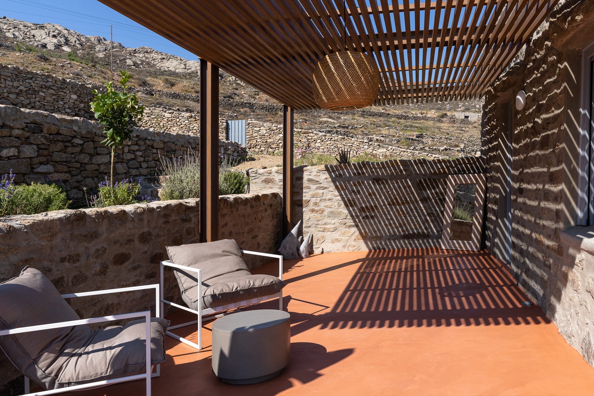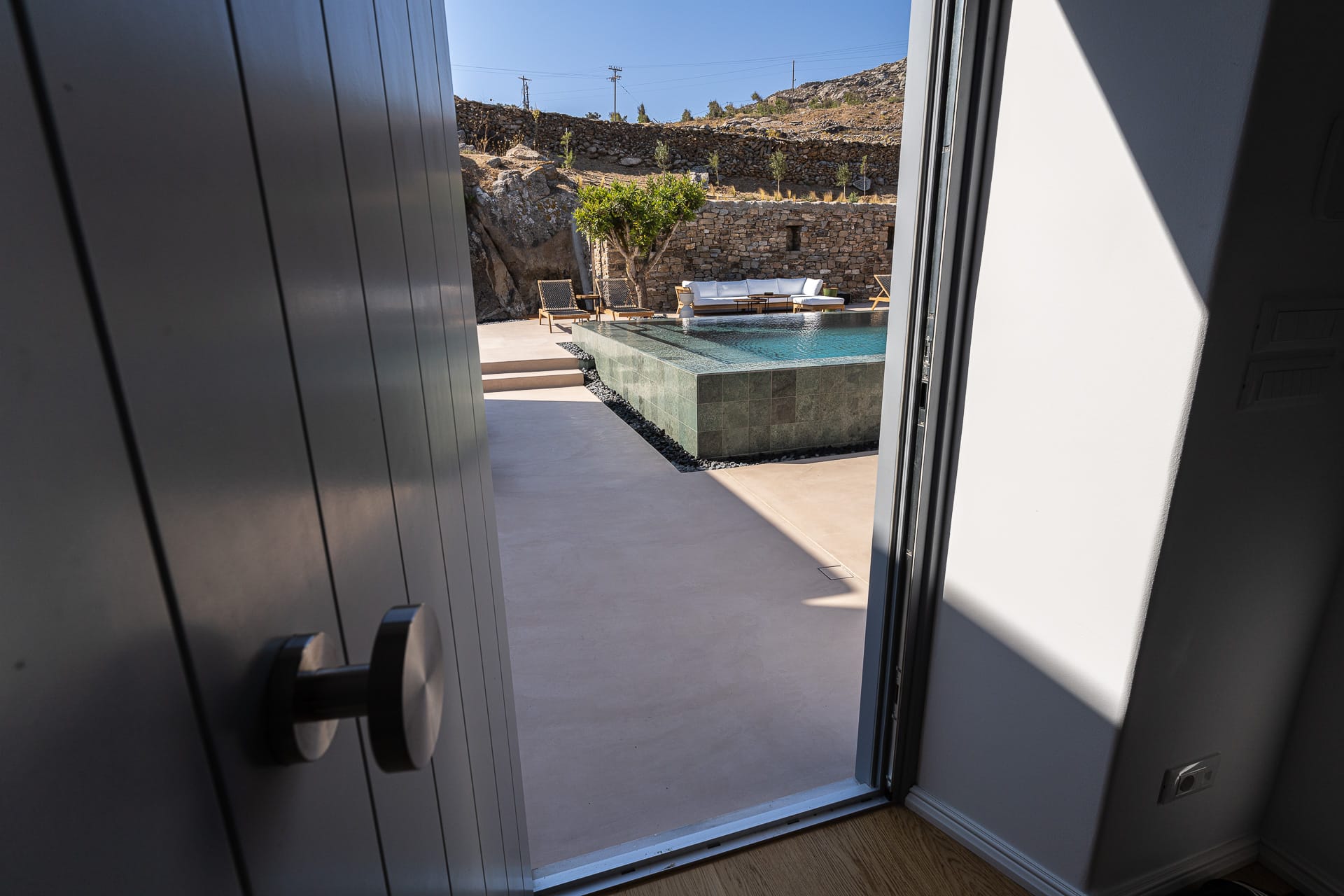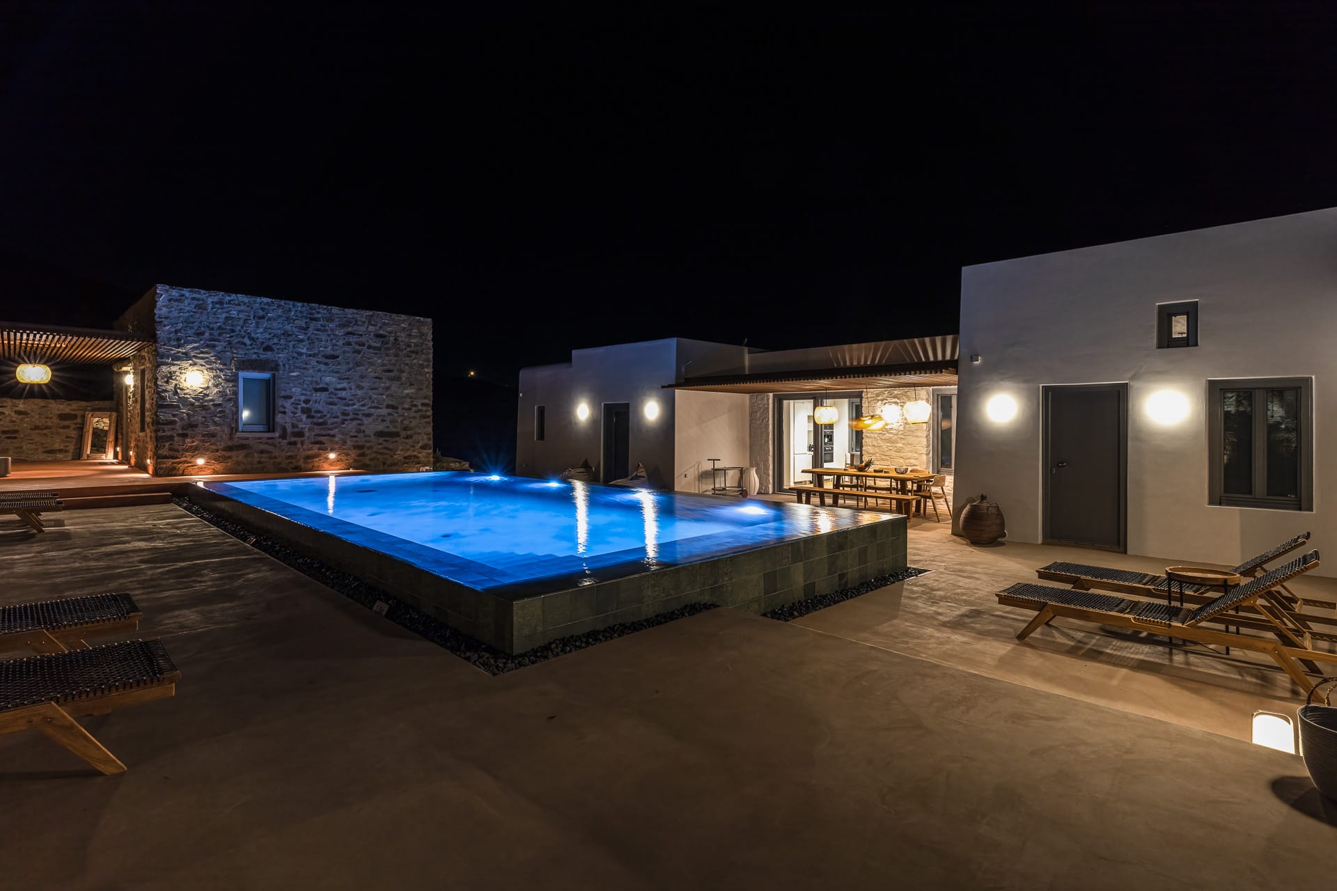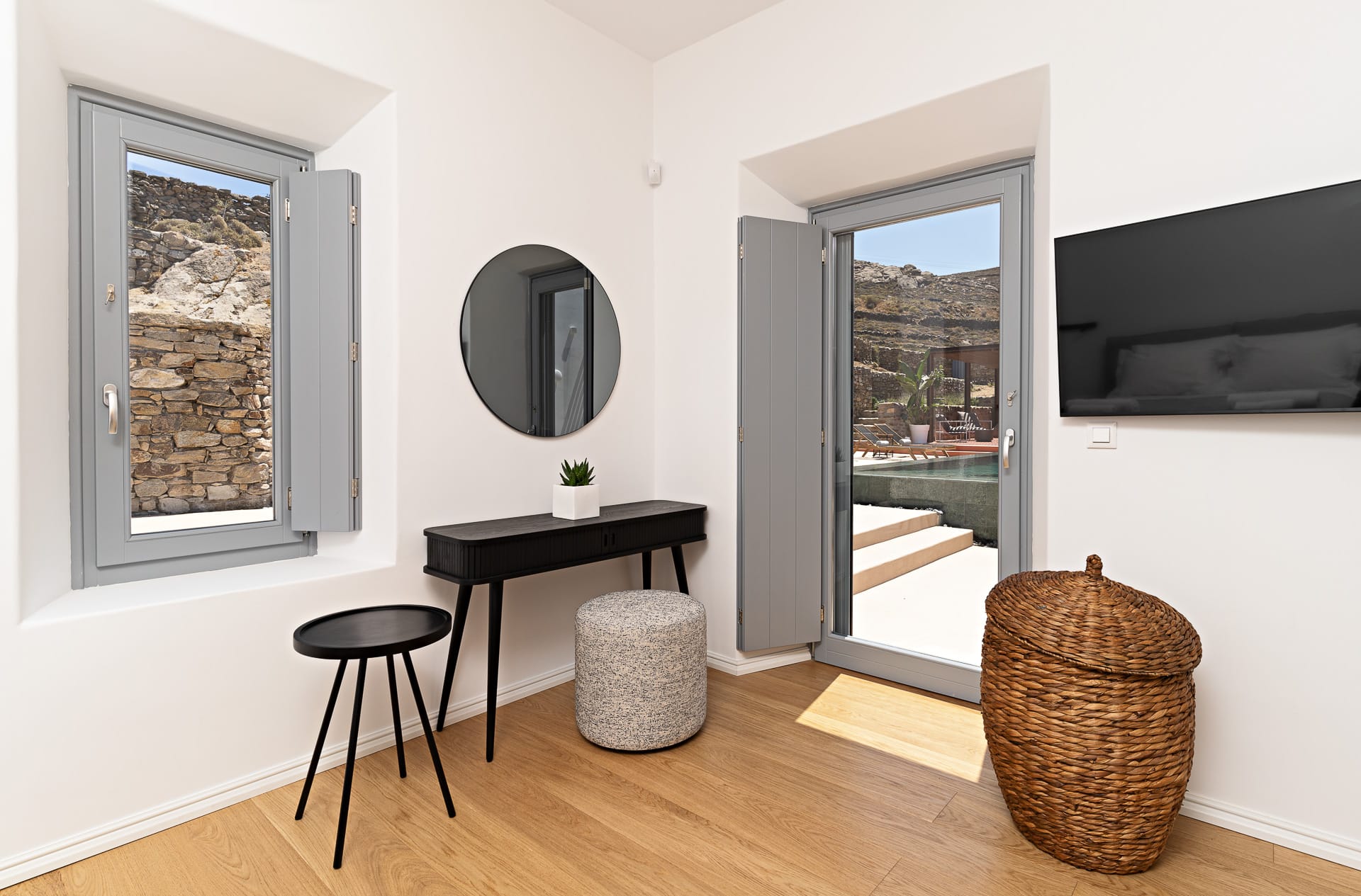 Ftelia, is the most ideal beach for windsurfing, kitesurfing and swimming, but also an excellent spot for quality food, drink and concept beach activities at the beach bar Alemagou. Oozing Mykonian simplicity, this luxurious house offers 3 double bedrooms with 2 en suite bathrooms, and 1 extra bathroom, as well as, an independent, contemporary equipped kitchen, fully interactive with the living room. The kitchen area, is placed in the heart of the residence, so that it can refer to both the south and north sides of the courtyard and the pool area. This everyday space with airy openings, is a “window” to the sea view and the outdoor area.