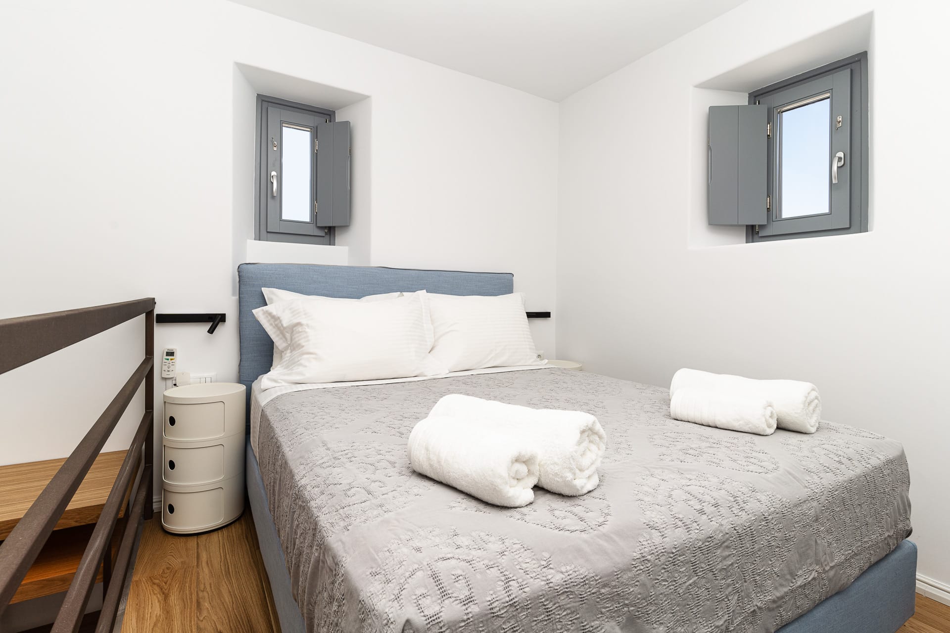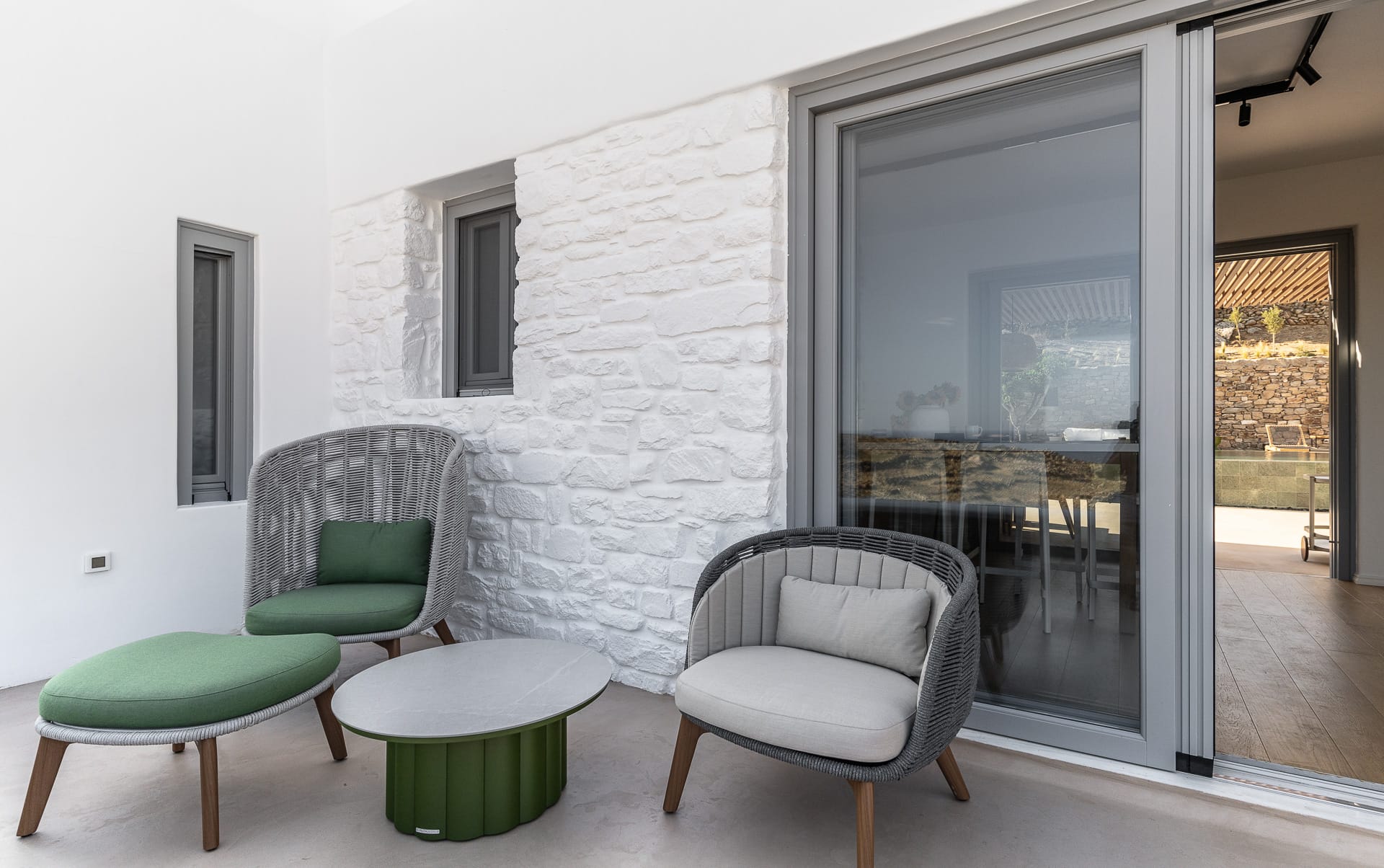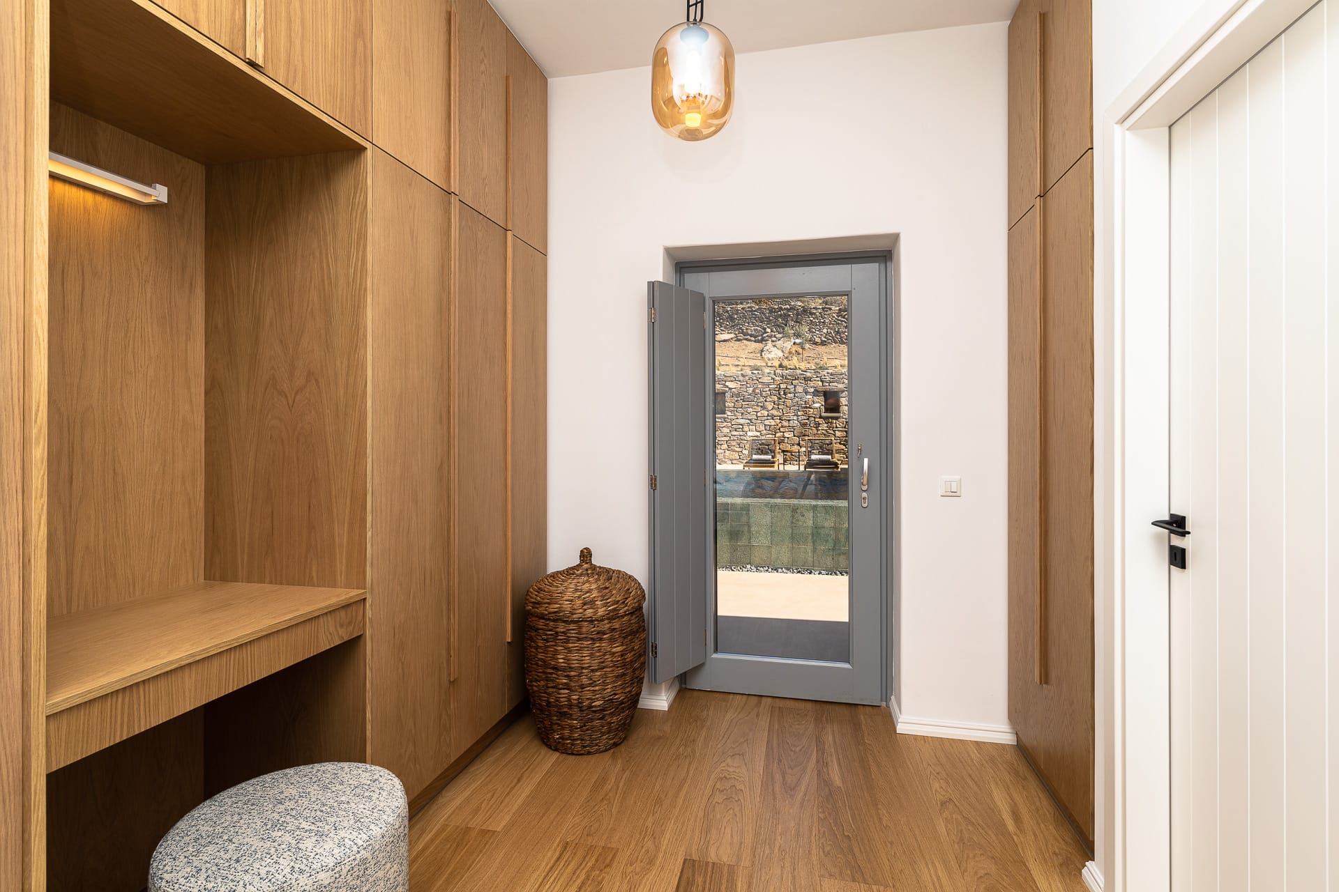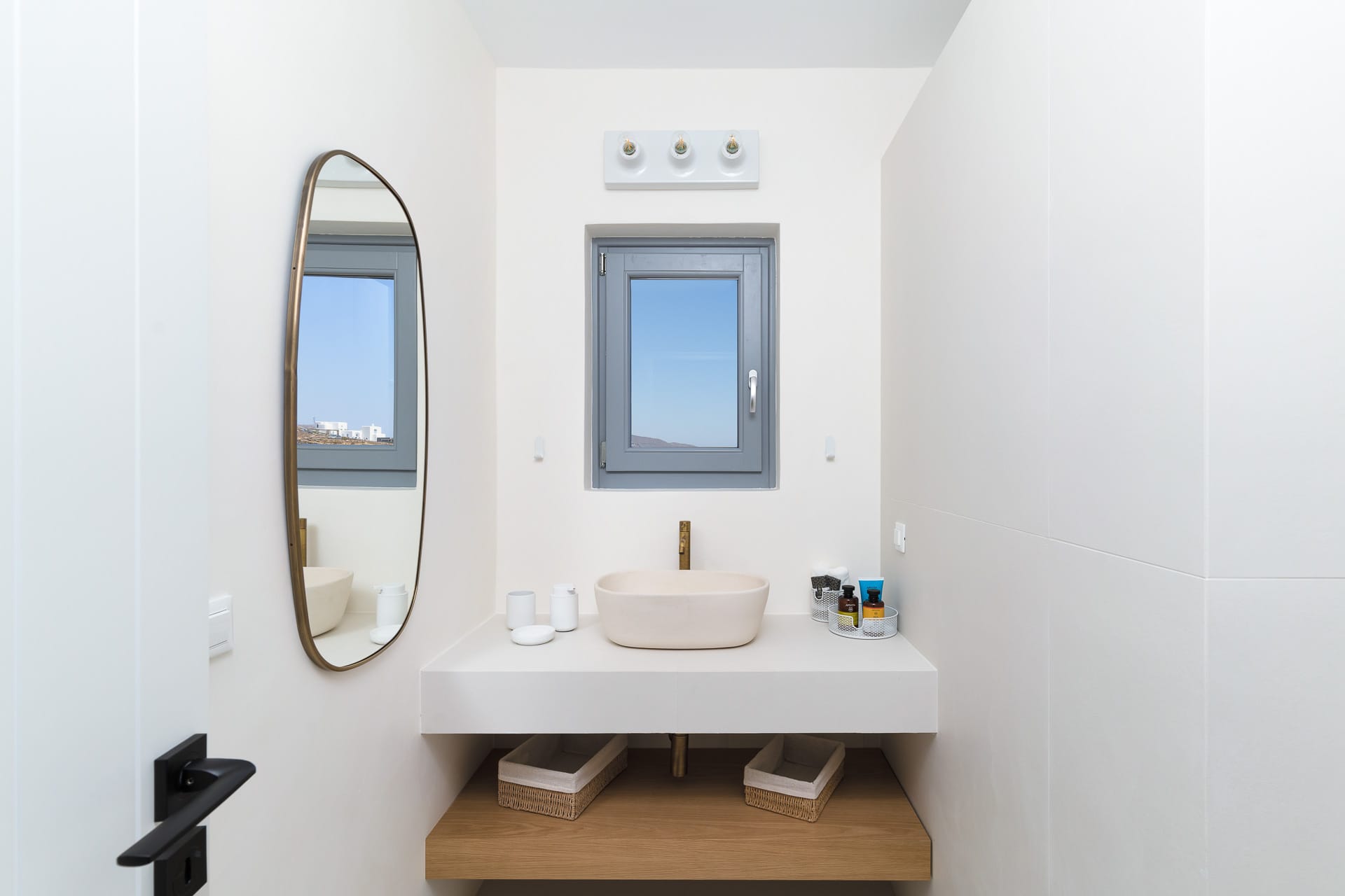Ftelia, is the most ideal beach for windsurfing, kitesurfing and swimming, but also an excellent spot for quality food, drink and concept beach activities at the beach bar Alemagou. Oozing Mykonian simplicity, this luxurious house offers 3 double bedrooms with 2 en suite bathrooms, and 1 extra bathroom, as well as, an independent, contemporary equipped kitchen, fully interactive with the living room. The kitchen area, is placed in the heart of the residence, so that it can refer to both the south and north sides of the courtyard and the pool area. This everyday space with airy openings, is a “window” to the sea view and the outdoor area.