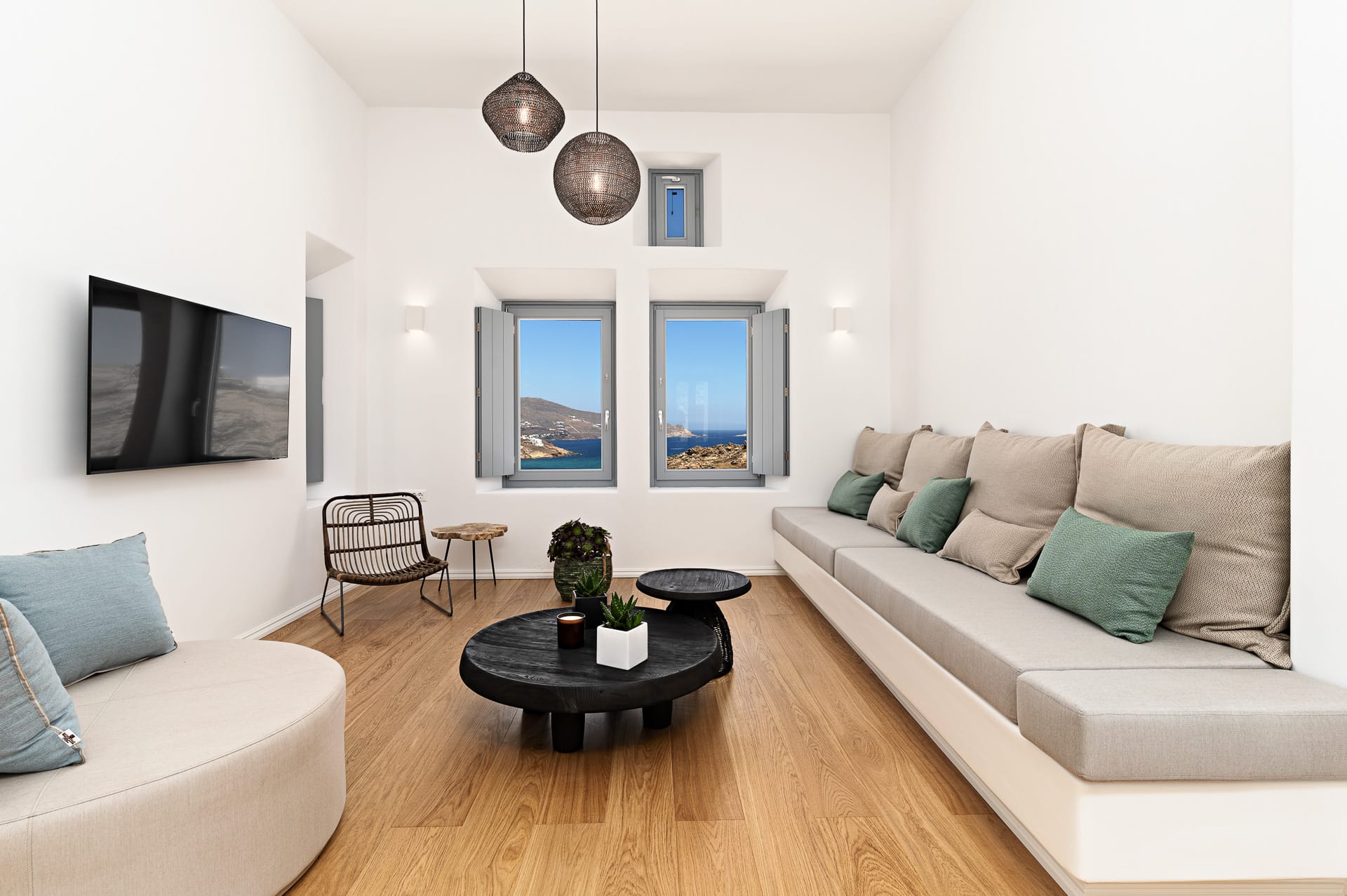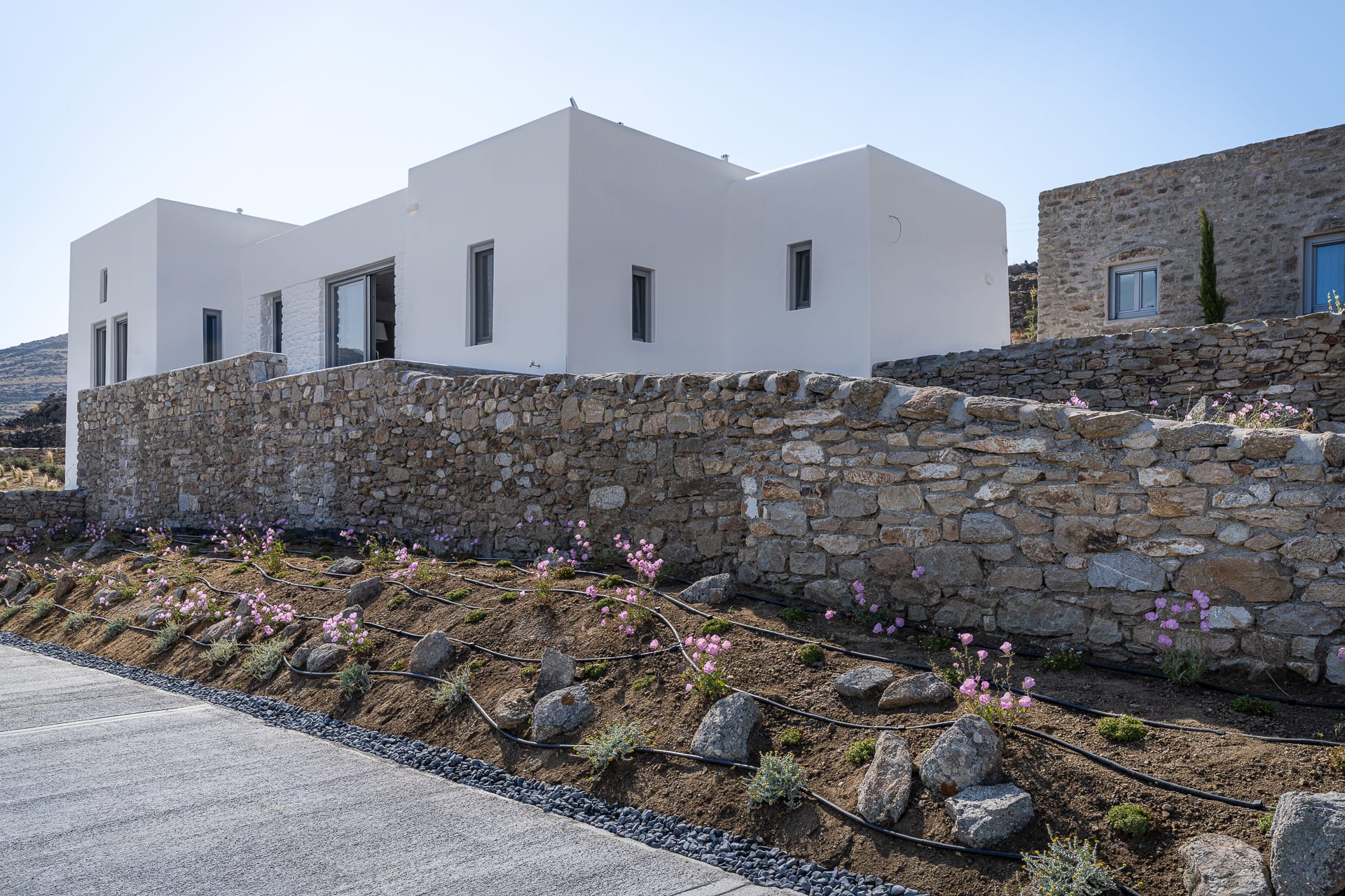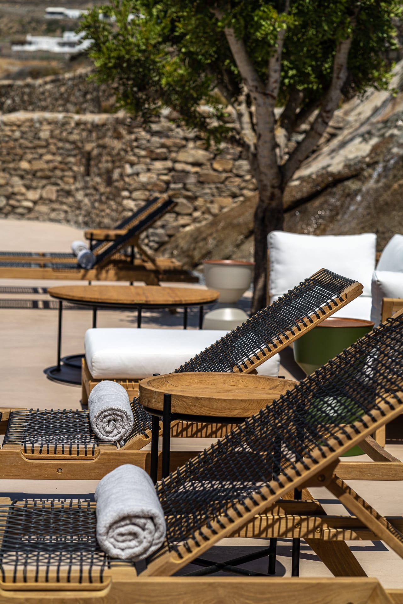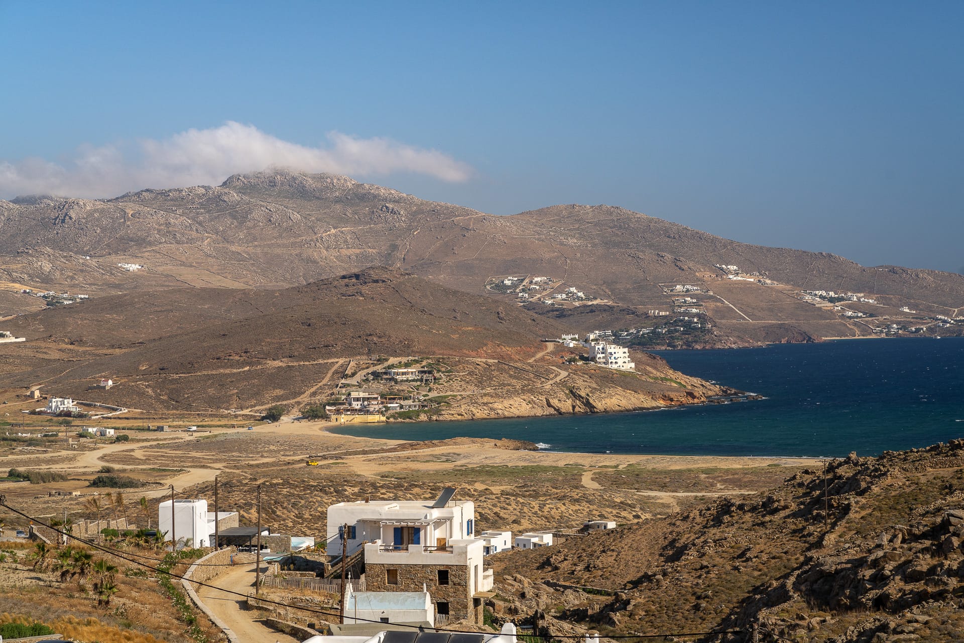 It is built amphitheatrically overlooking the sea and specifically on the north beach, in the bay of Panormos, with the amazingly crystal waters and long sandy beach. Due to the size of the beach and its boho hype, one has the unique advantage, to be isolated, if desired, which is almost impossible on other beaches of the island.