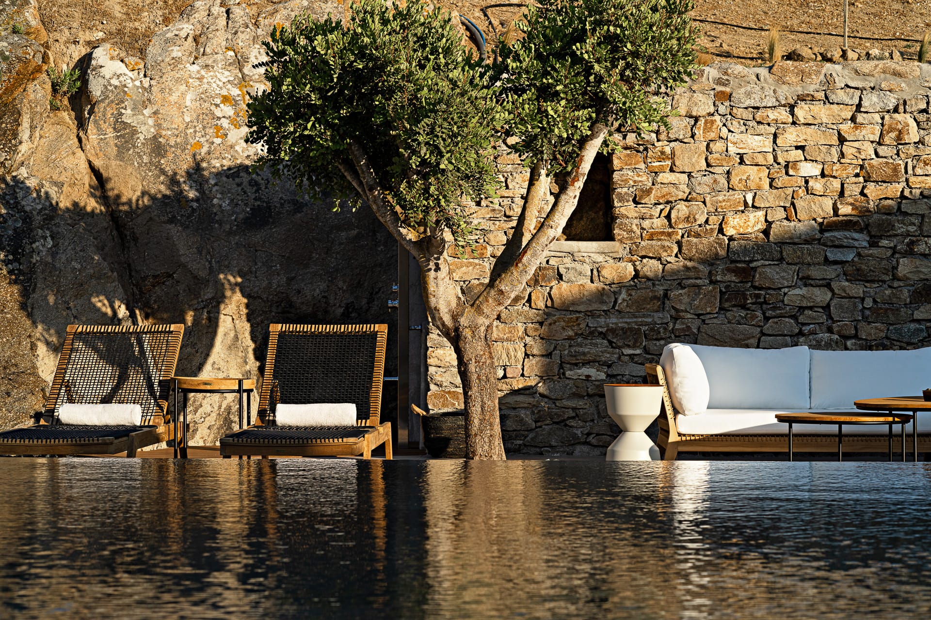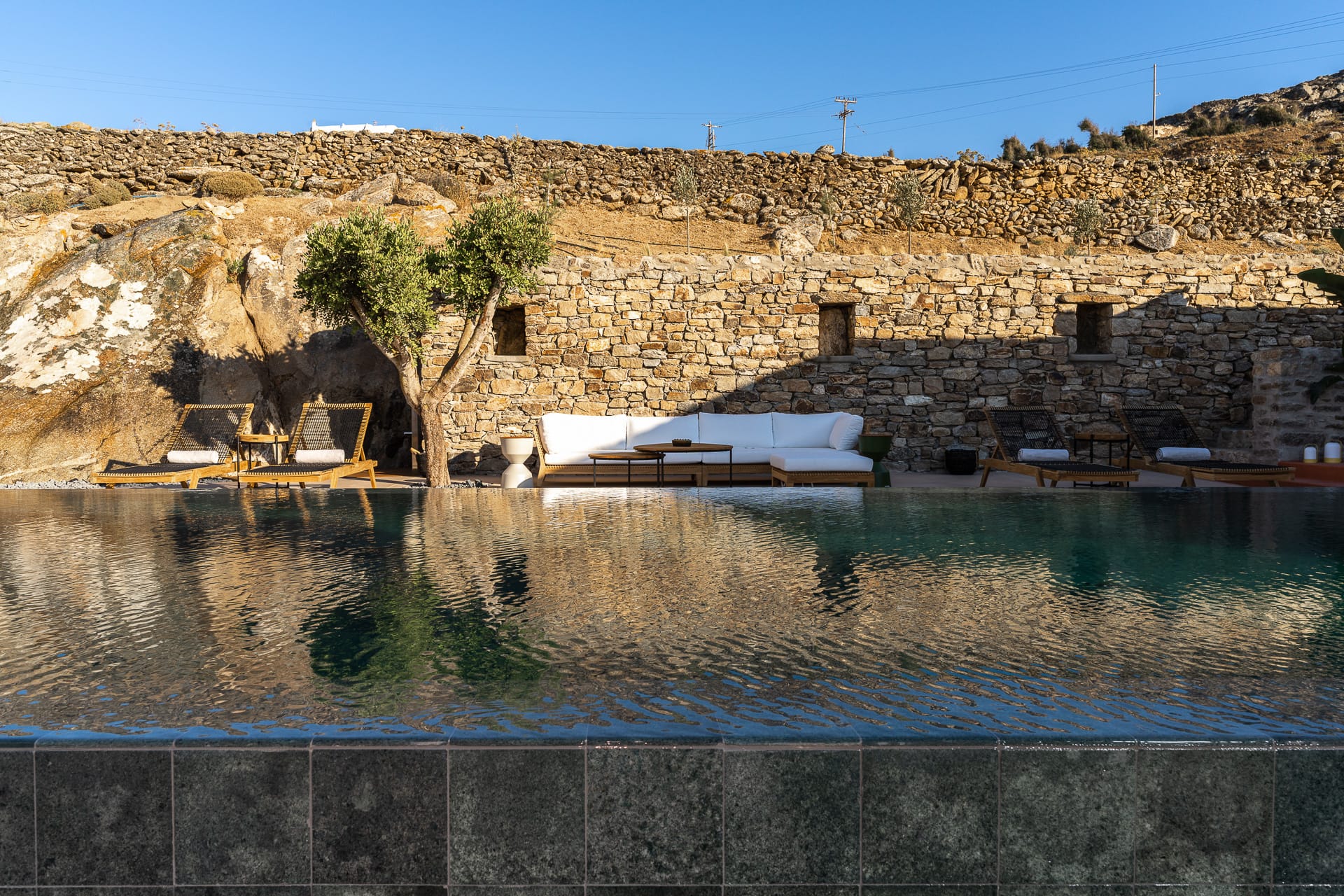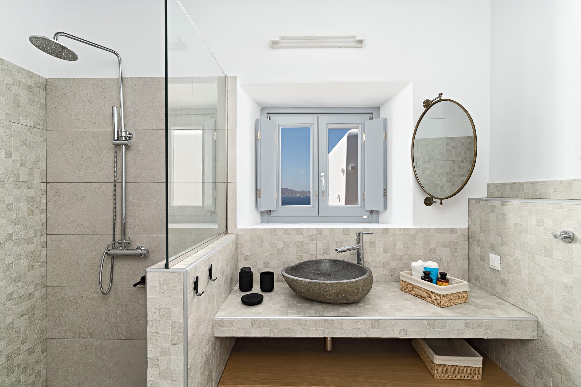 It is built amphitheatrically overlooking the sea and specifically on the north beach, in the bay of Panormos, with the amazingly crystal waters and long sandy beach. Due to the size of the beach and its boho hype, one has the unique advantage, to be isolated, if desired, which is almost impossible on other beaches of the island.