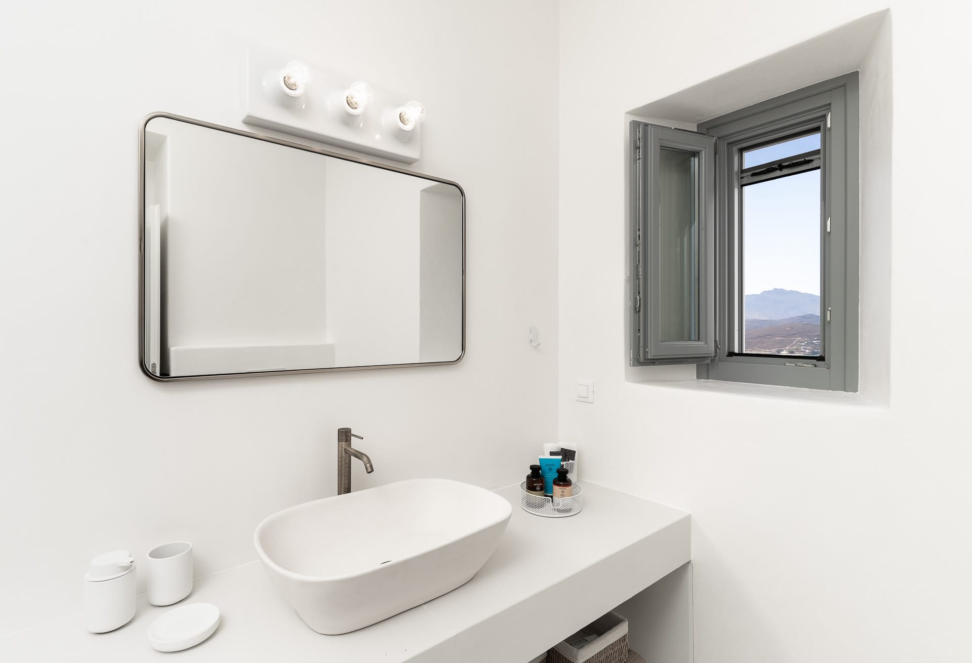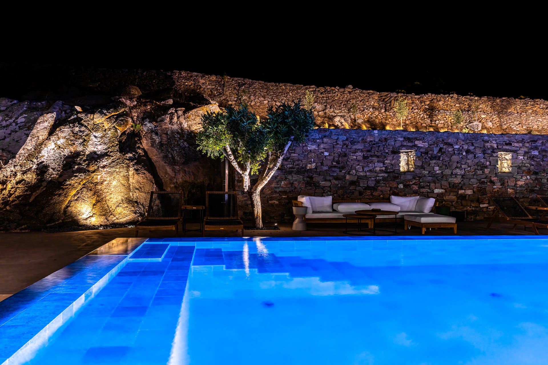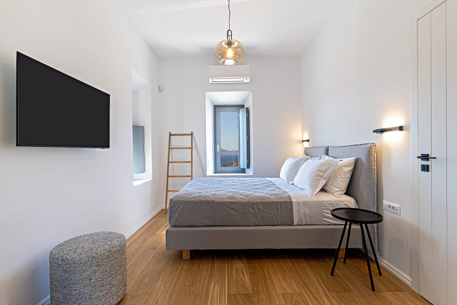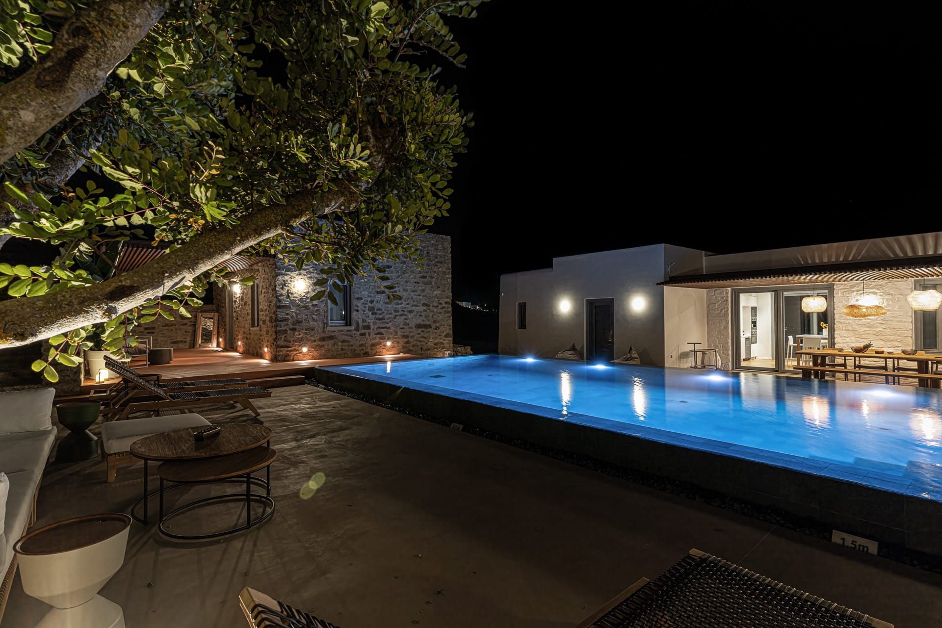 It is built amphitheatrically overlooking the sea and specifically on the north beach, in the bay of Panormos, with the amazingly crystal waters and long sandy beach. Due to the size of the beach and its boho hype, one has the unique advantage, to be isolated, if desired, which is almost impossible on other beaches of the island.