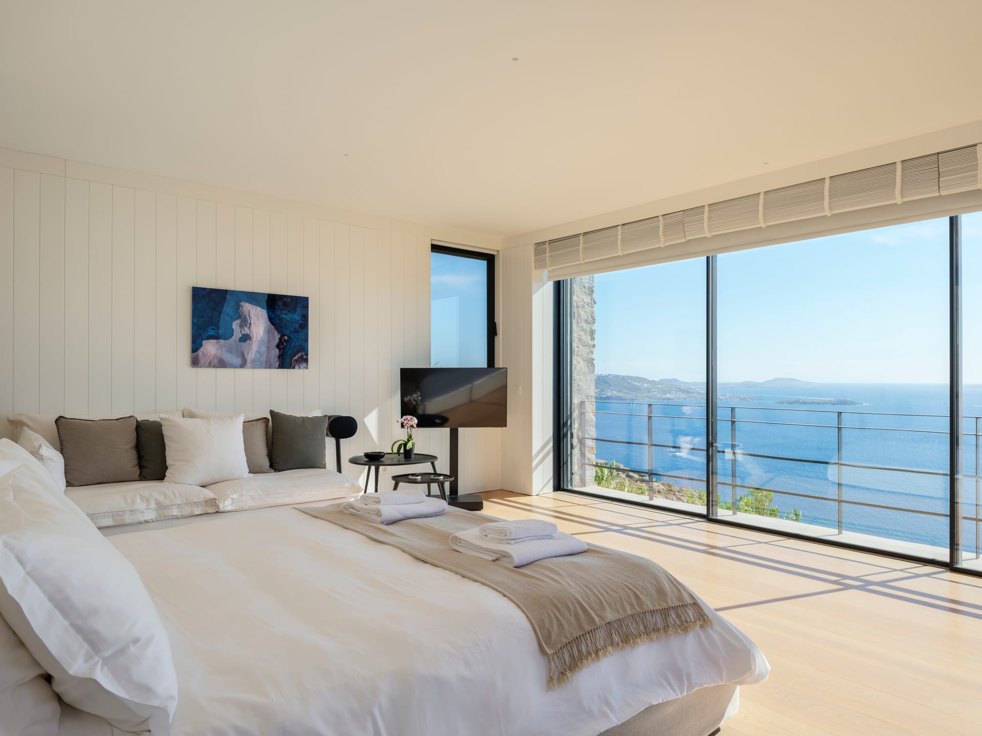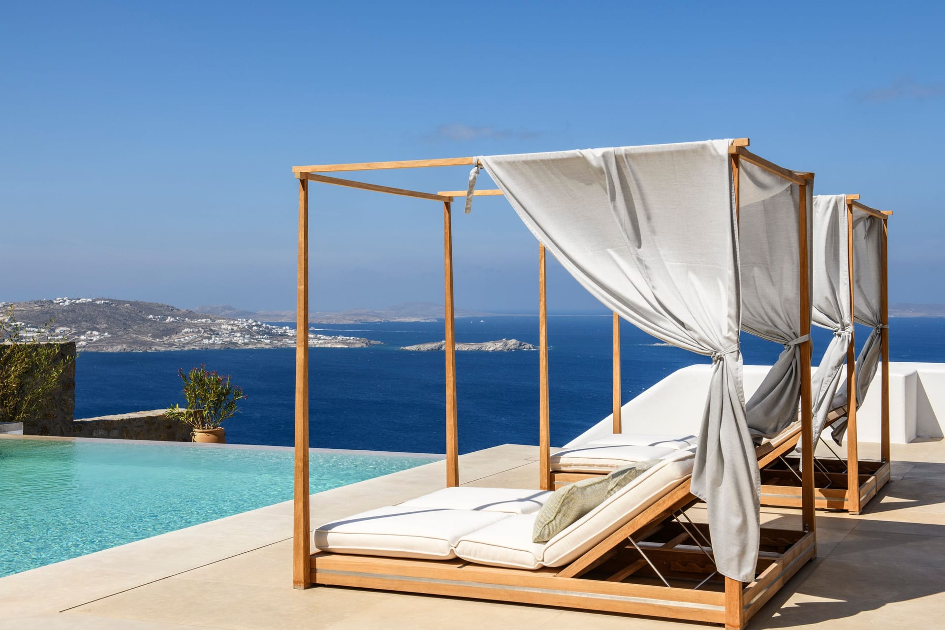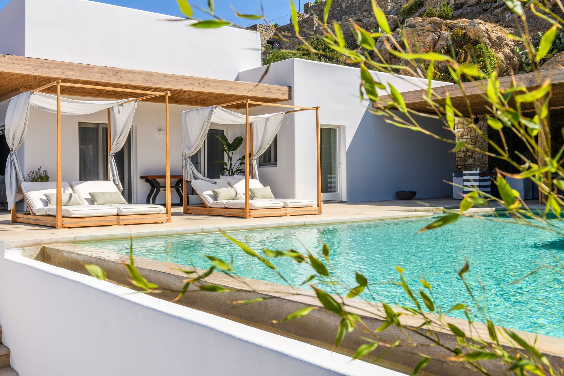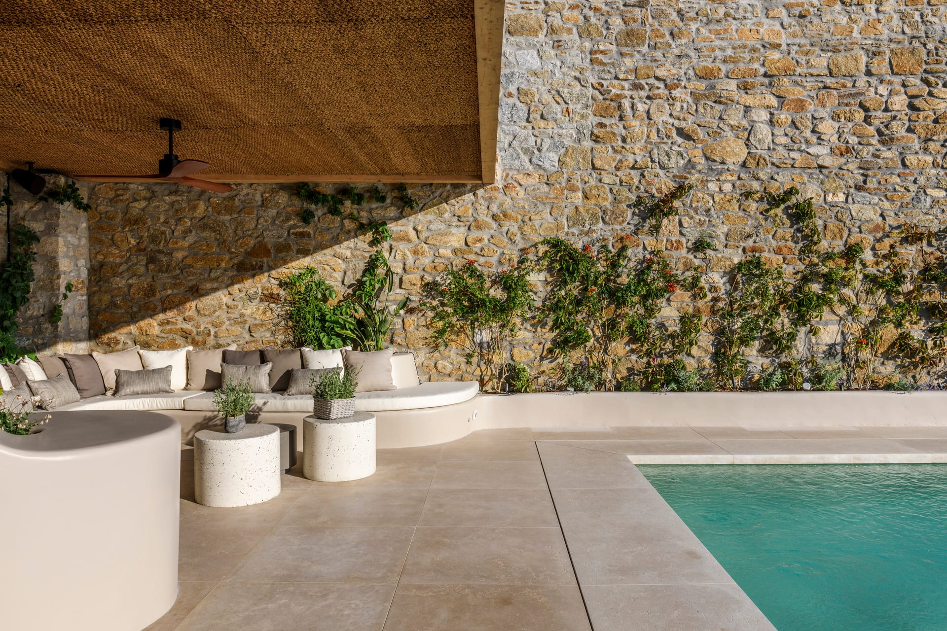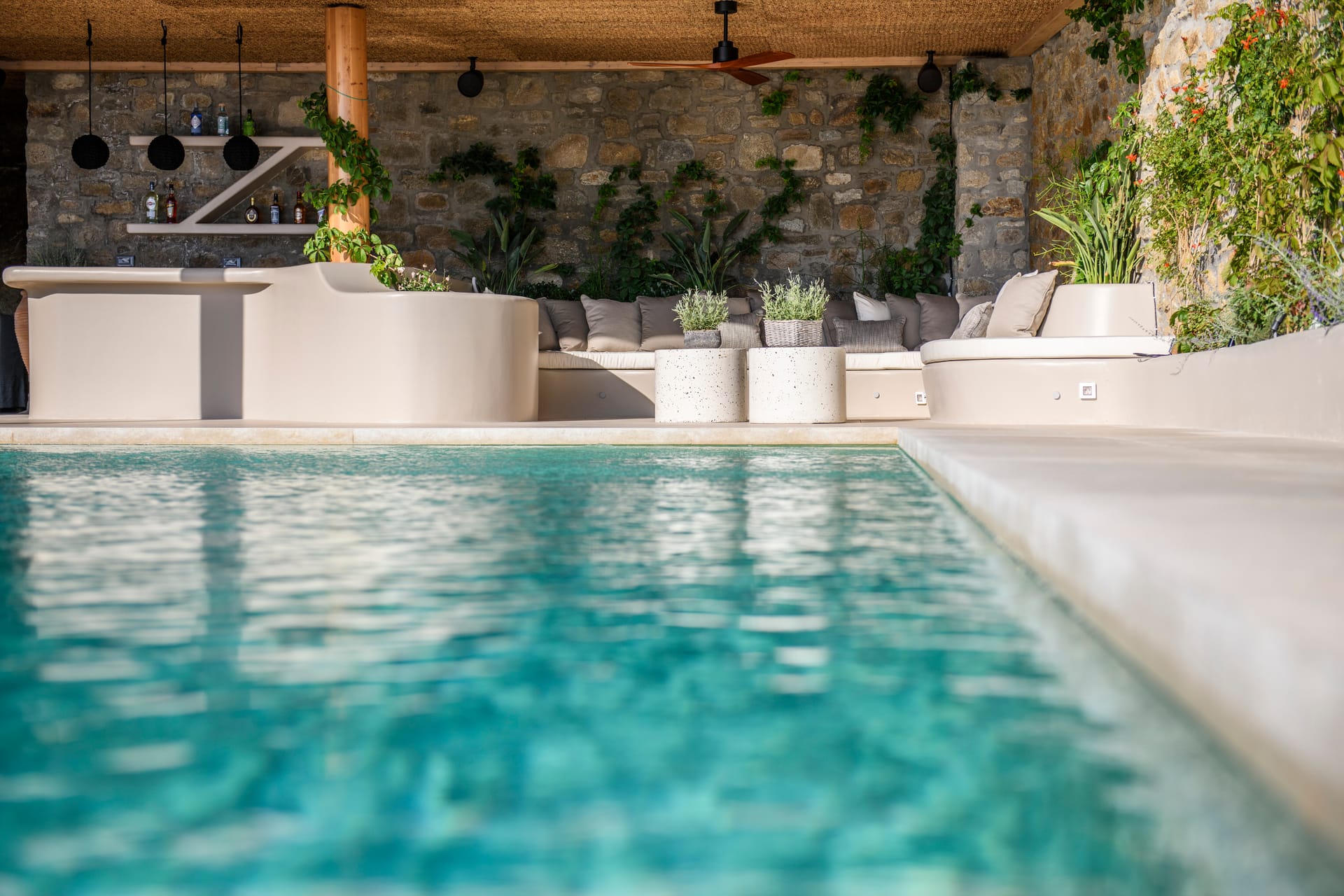 The design team has interwoven Cycladic architectural elements into Silver Breeze's DNA, creating a tasteful mélange that stands as a homage to Mykonos' unique natural landscape. The villa's walls, painted in pristine white, are contrasted perfectly with warm natural tones, forming an intimate, luxurious Mykonian setting. The color palette resonates with the natural landscape, featuring hues of earth and sea, harmonizing the indoors with the outdoors, and forming an interconnected, organic living experience. Eight elegantly and spacious appointed en-suite bedrooms await at the heart of the villa, each a serene cocoon of tranquility. The contemporary bespoke pieces of furniture provide a touch of modern sophistication, perfectly complementing the timeless ambiance. The rooms are adorned with carefully selected objet d'art, each piece reflecting a keen artistic eye. Their timeless beauty enhances the villa's minimalist aesthetic, embodying the same relaxed elegance that defines Mykonos itself. Soft textures, organic linens, and sculptural shapes complete the scene, adding to the sense of serene luxury that pervades every corner of this extraordinary property.