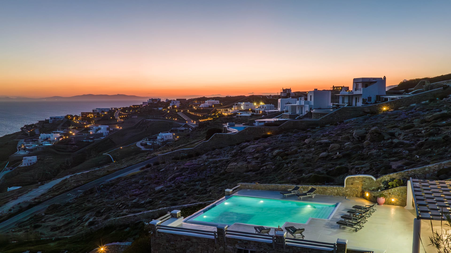 The villa consists of two levels, three bedrooms, a spacious living room and kitchen, and a lovely exterior space with a private pool and unique sunset views.