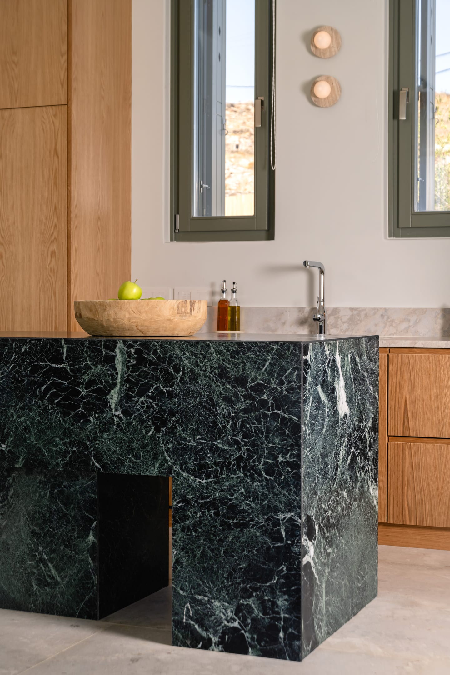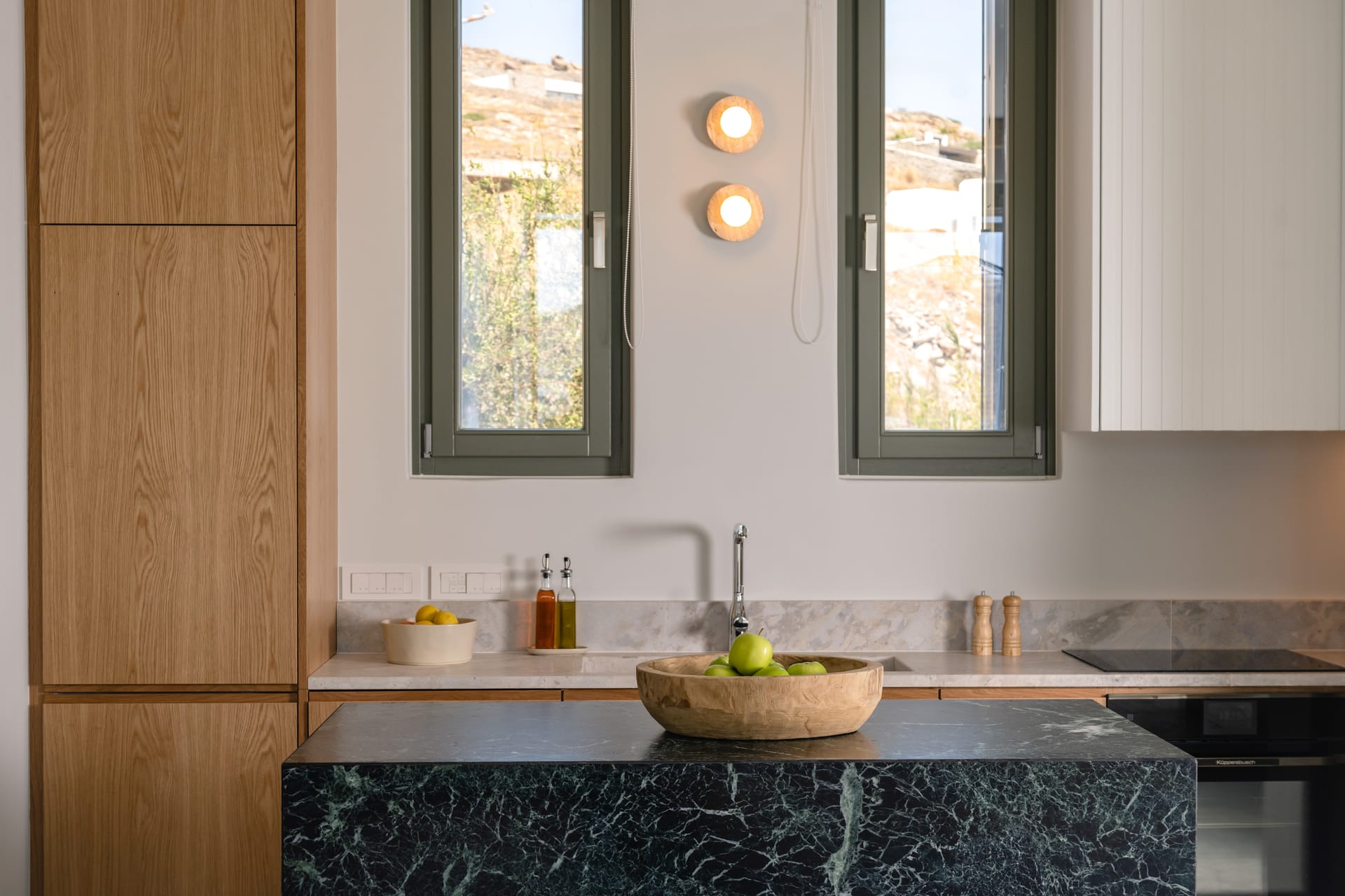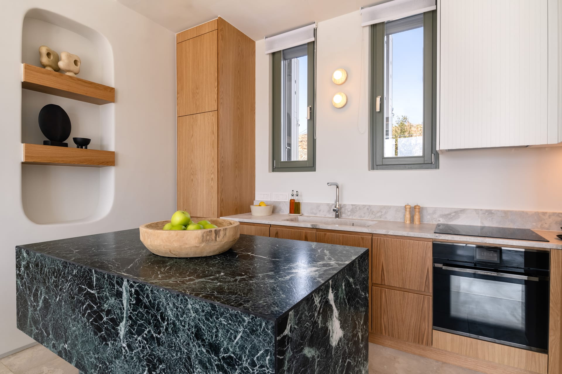 The open plan living and dining area features a lush furniture collection and elegant details.The kitchen boasts wood cabinetry, a striking green stone island, and high-end appliances, seamlessly combining style and functionality.