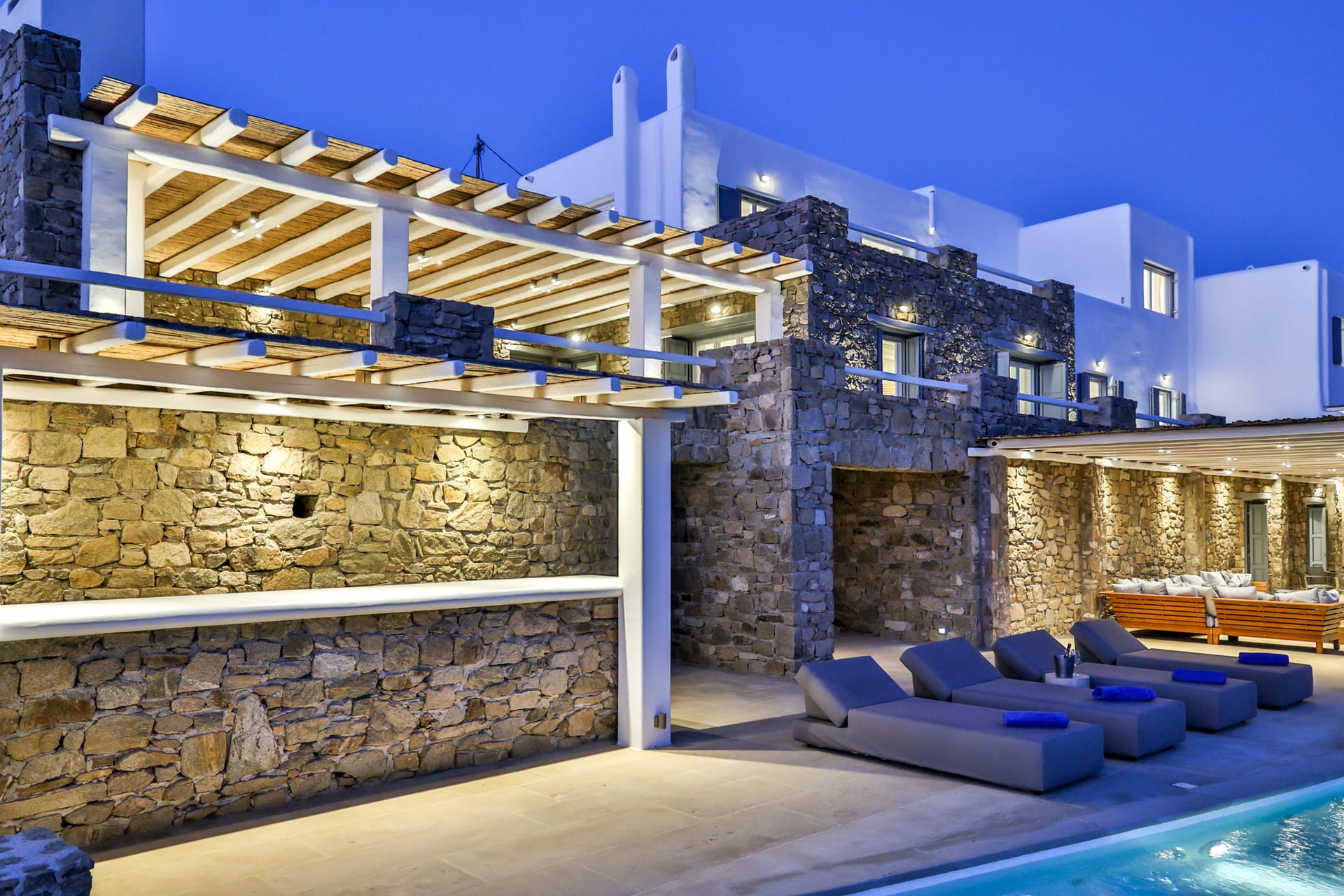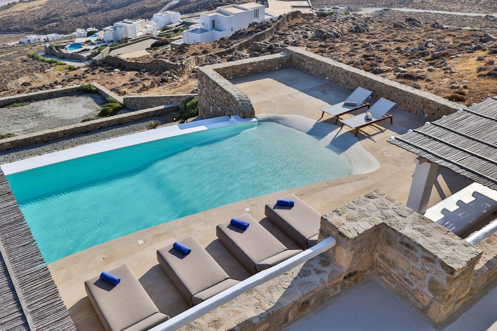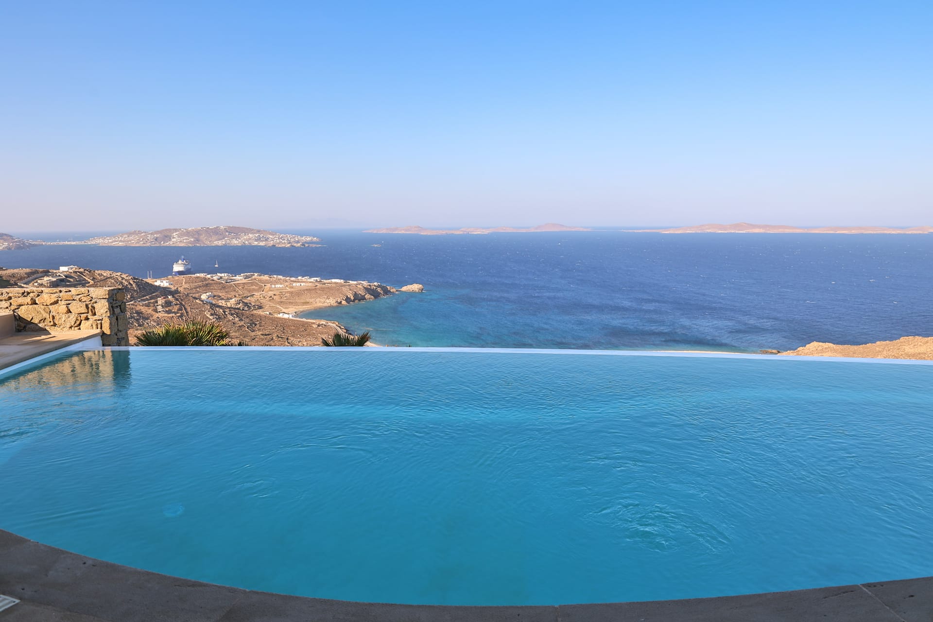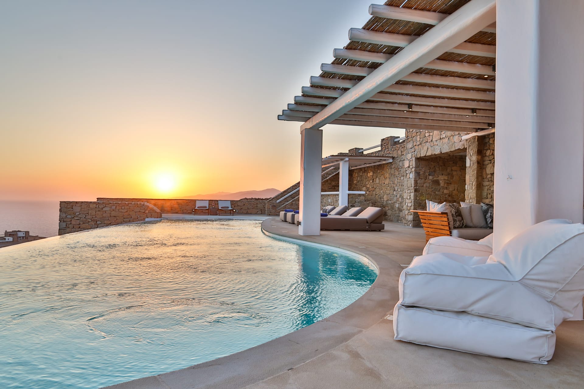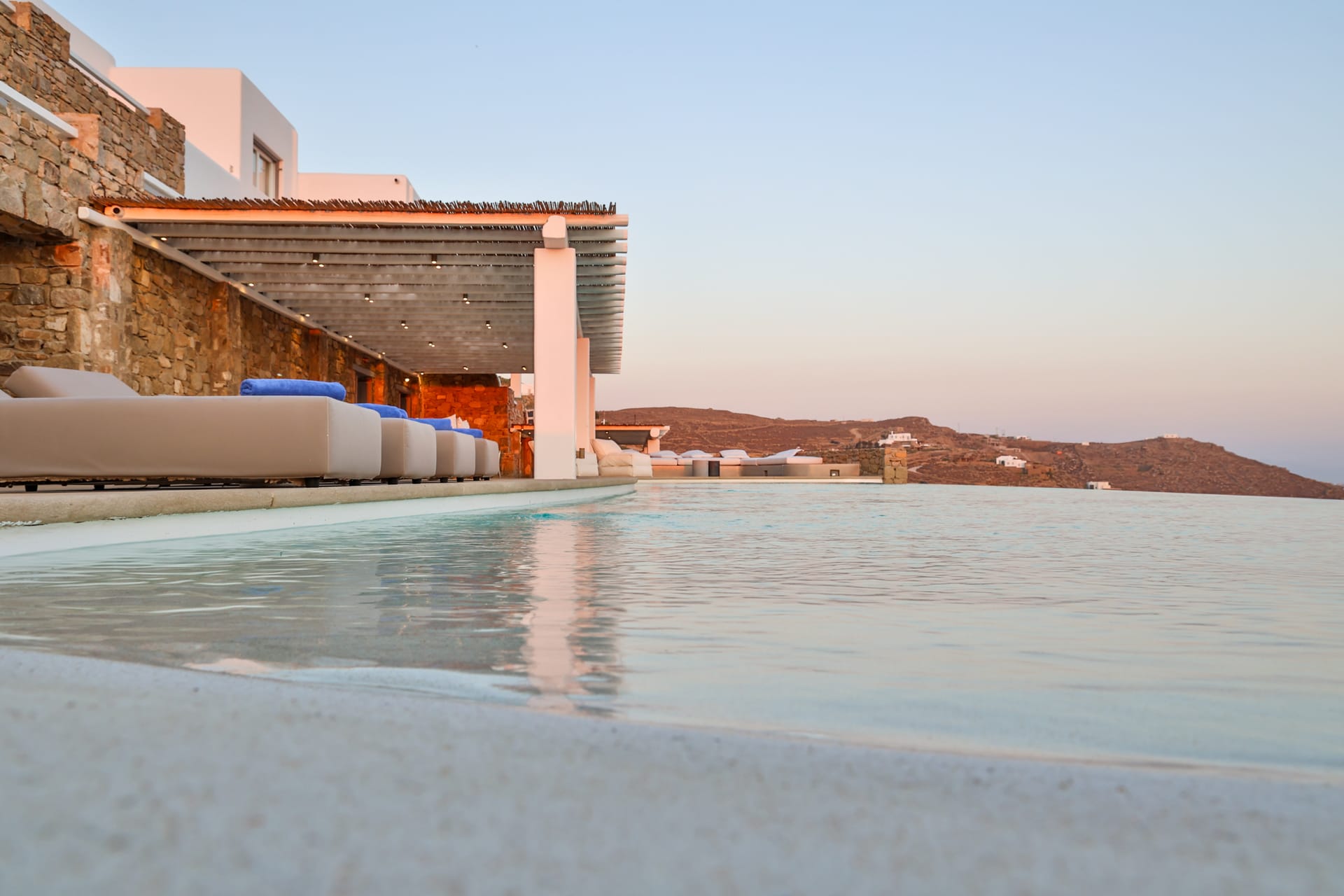 Outside, the crystal-clear heated pool invites you to bask in the Mykonian sun by day or unwind with a sunset swim by night. It’s the perfect centerpiece for lounging, entertaining, or simply soaking in the island’s beauty year-round.