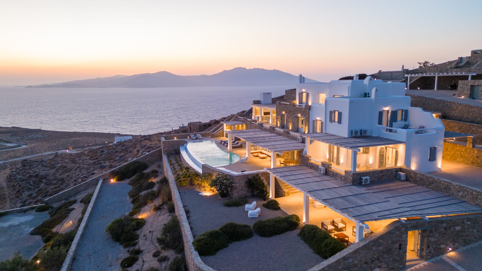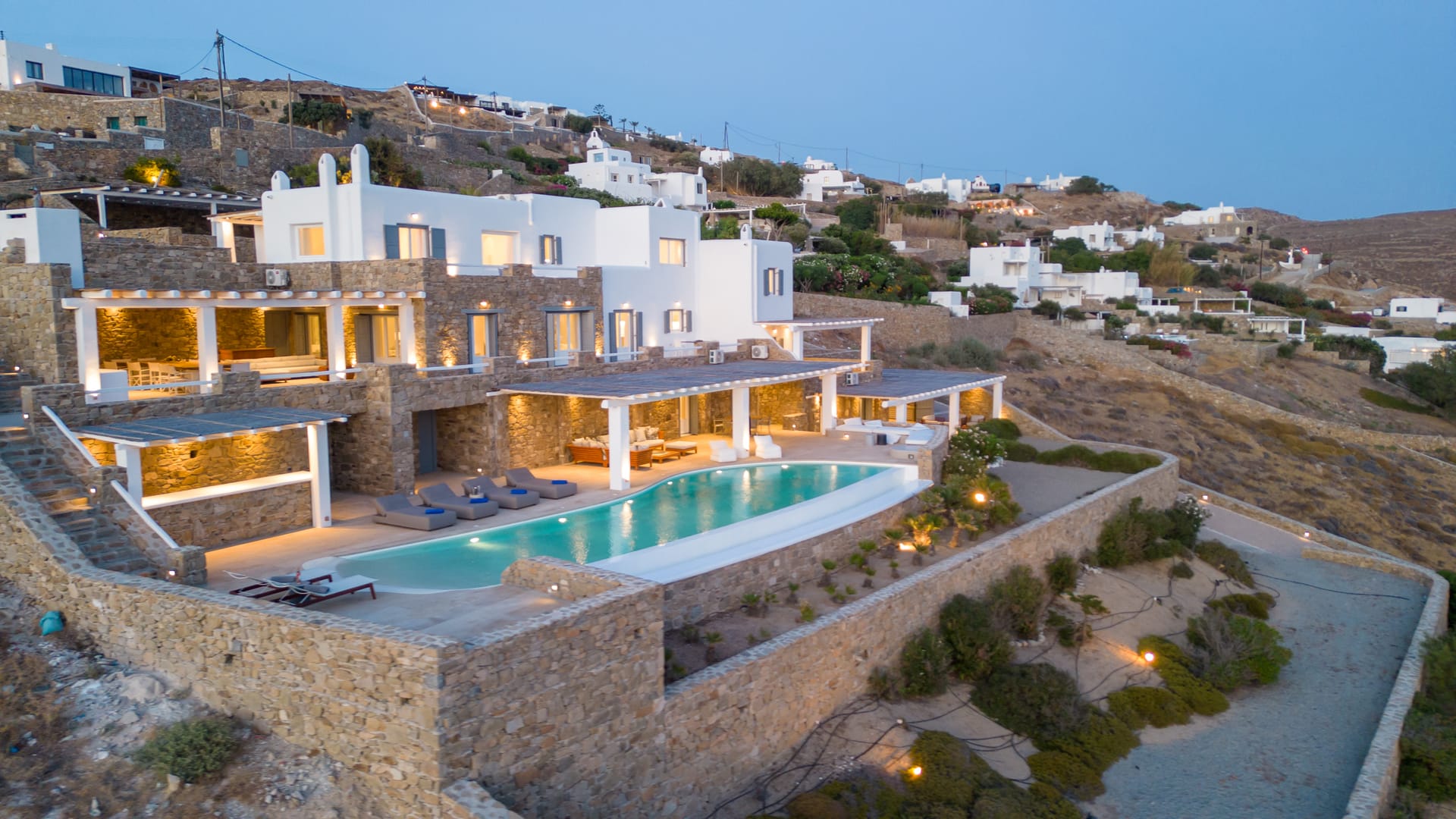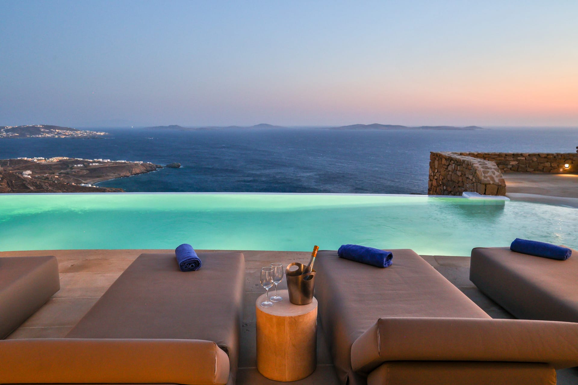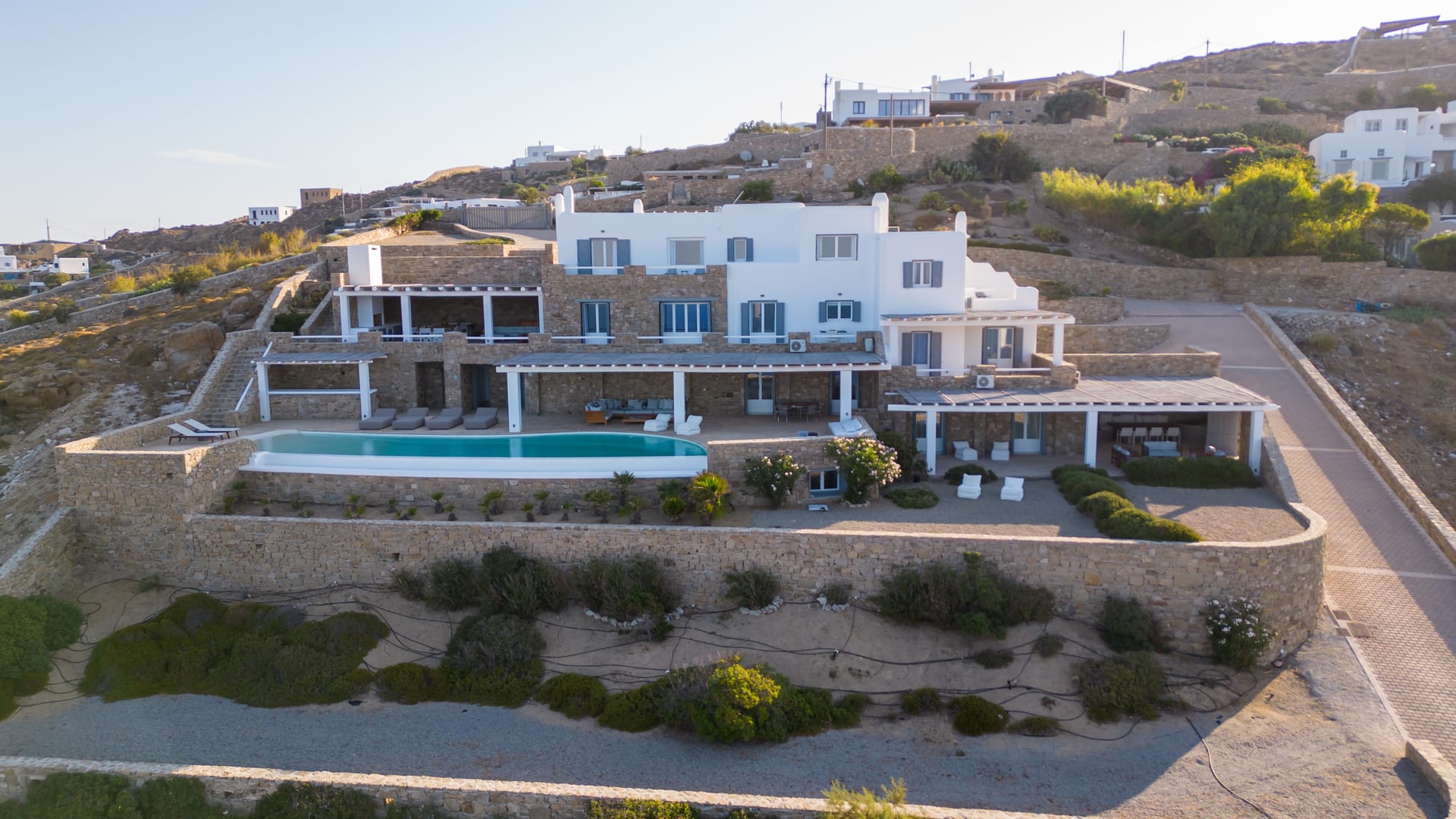 Outside, the crystal-clear heated pool invites you to bask in the Mykonian sun by day or unwind with a sunset swim by night. It’s the perfect centerpiece for lounging, entertaining, or simply soaking in the island’s beauty year-round.