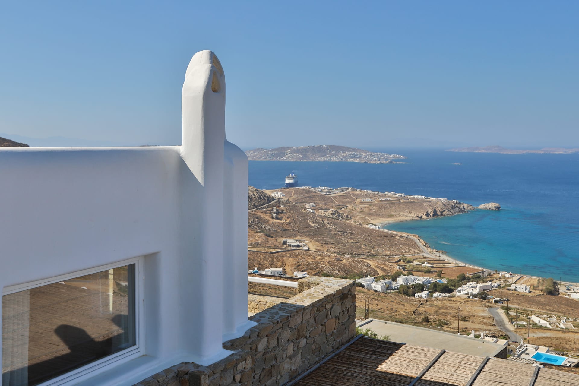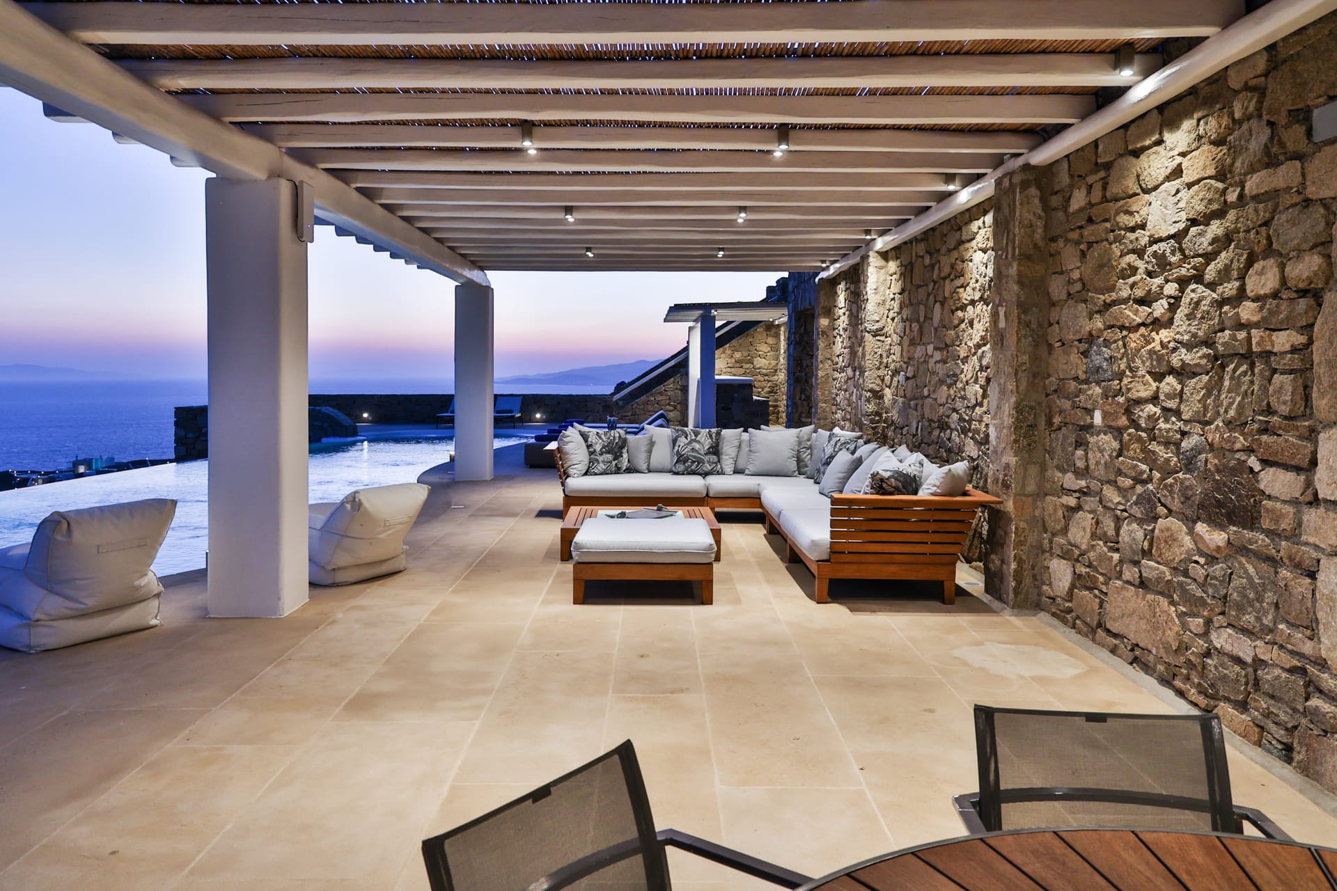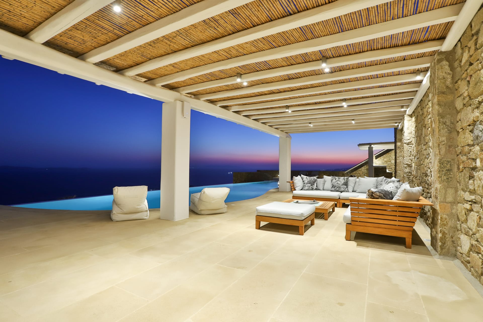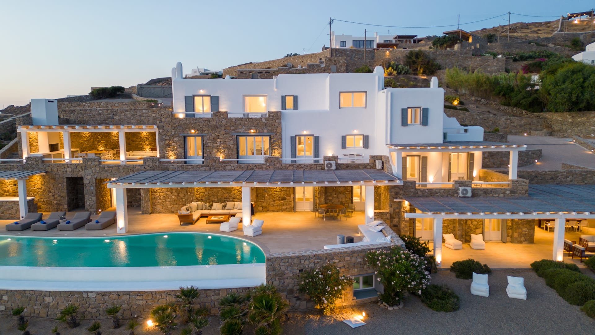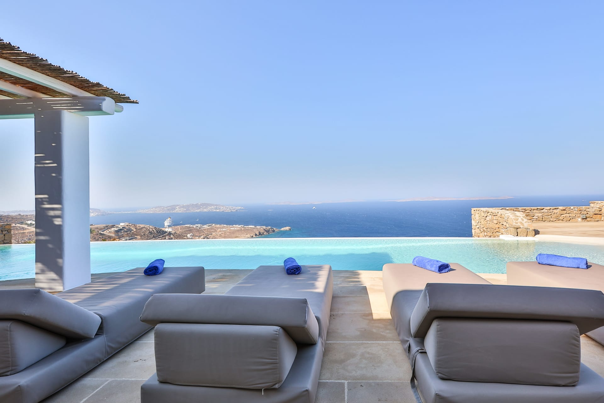 Outside, the crystal-clear heated pool invites you to bask in the Mykonian sun by day or unwind with a sunset swim by night. It’s the perfect centerpiece for lounging, entertaining, or simply soaking in the island’s beauty year-round.