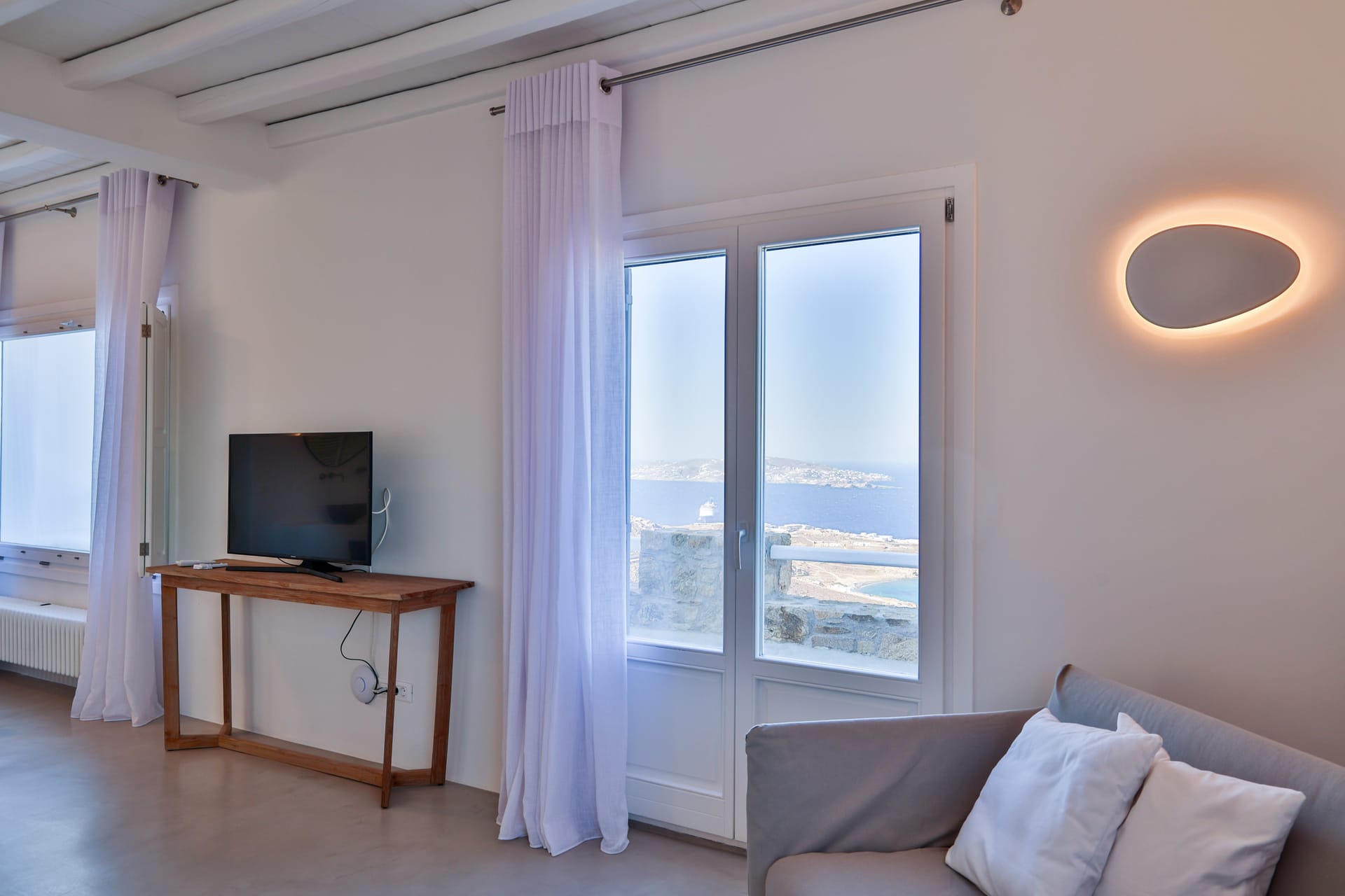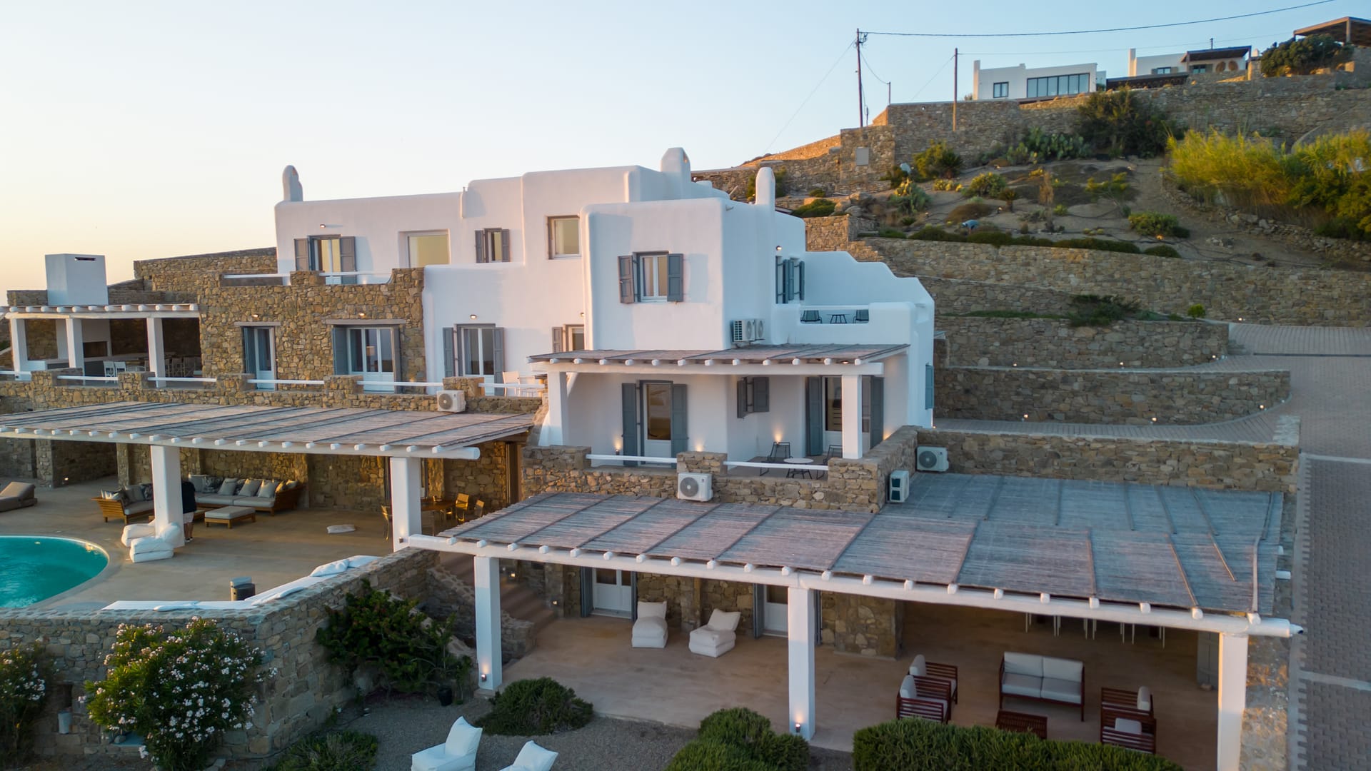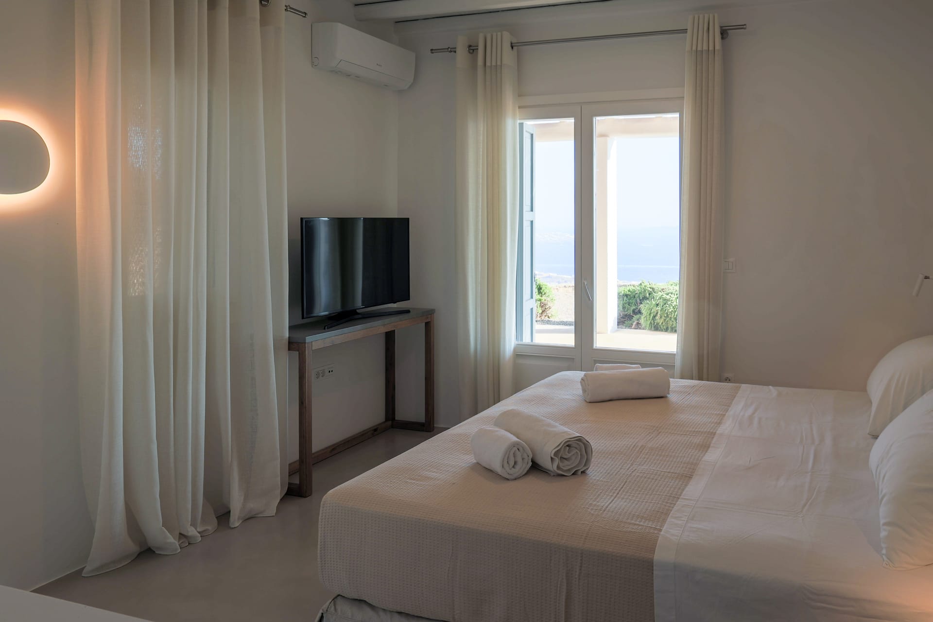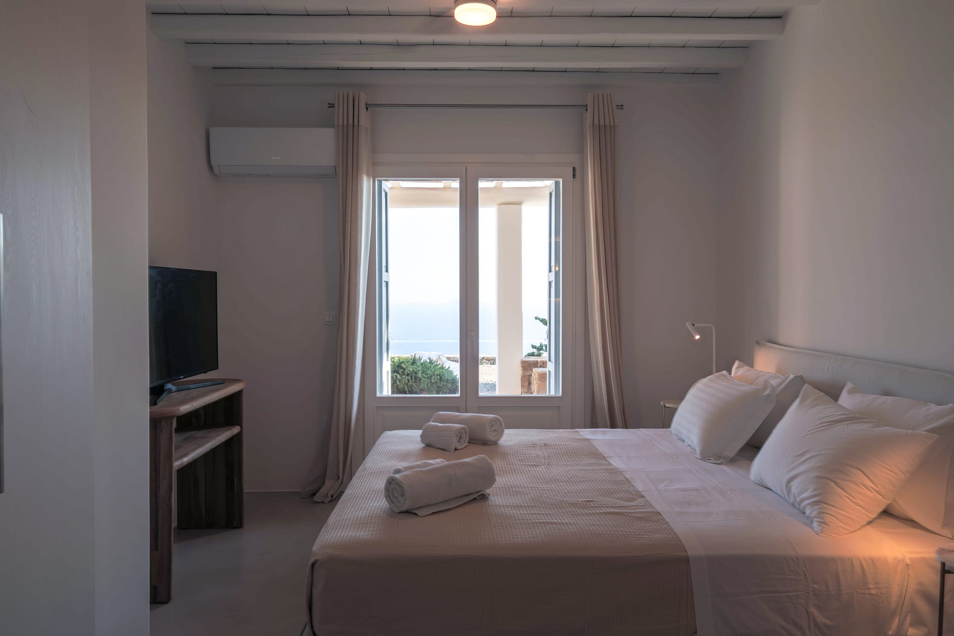 Outside, the crystal-clear heated pool invites you to bask in the Mykonian sun by day or unwind with a sunset swim by night. It’s the perfect centerpiece for lounging, entertaining, or simply soaking in the island’s beauty year-round.