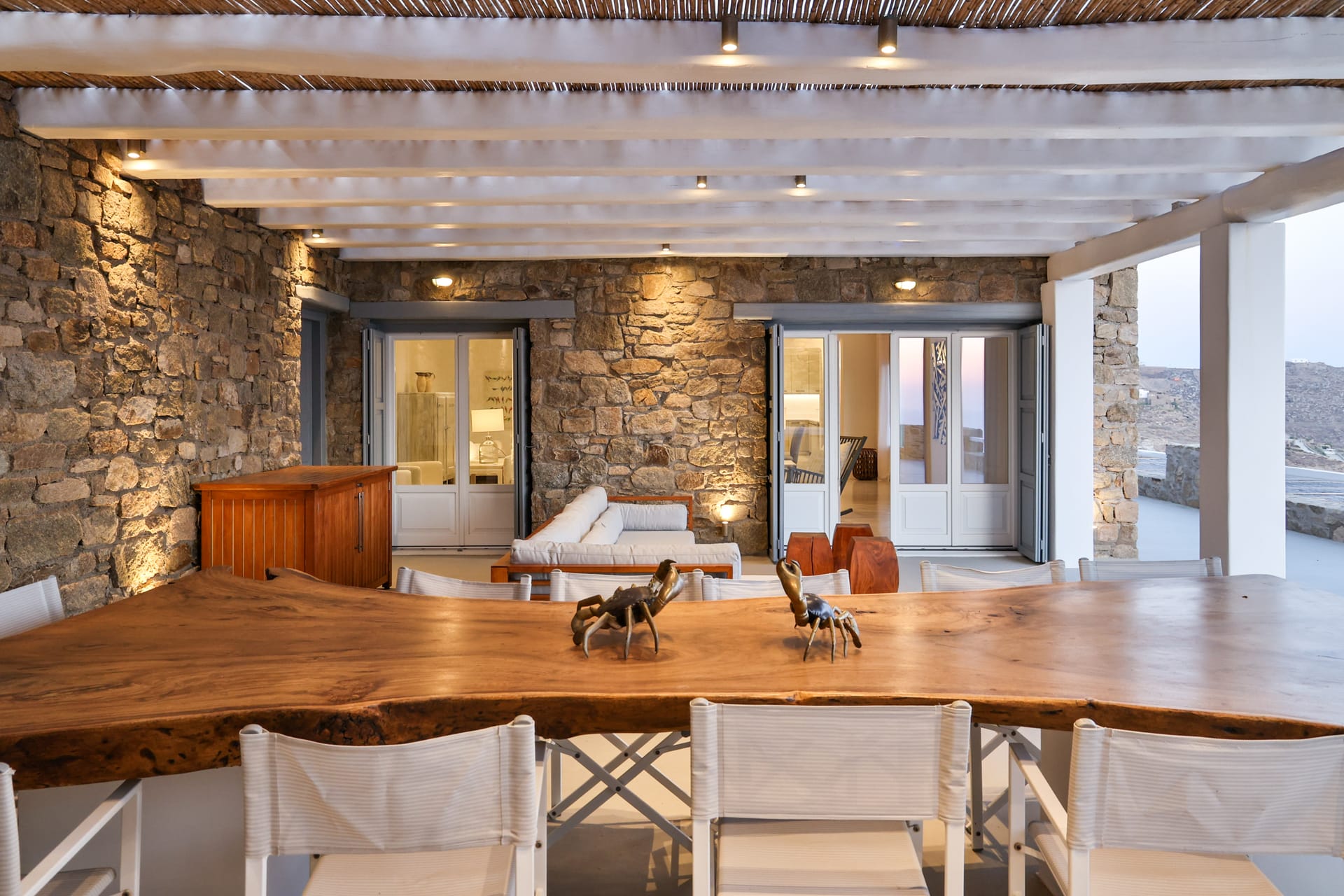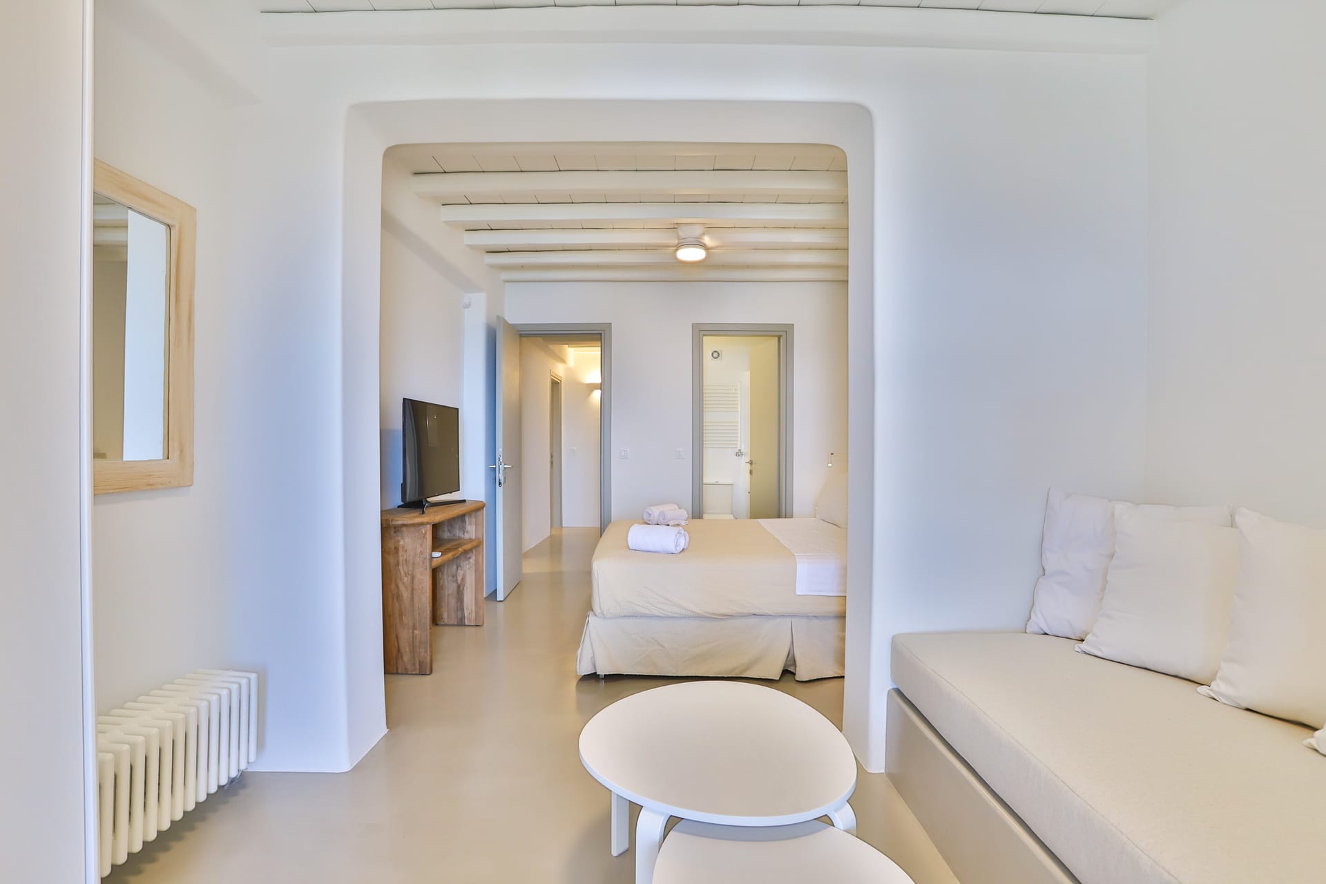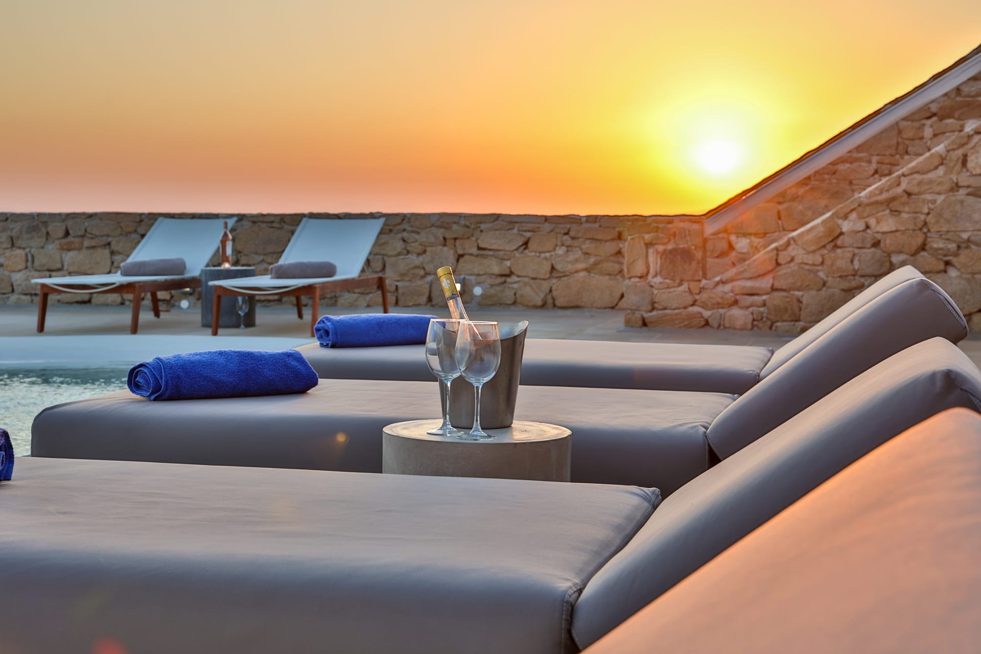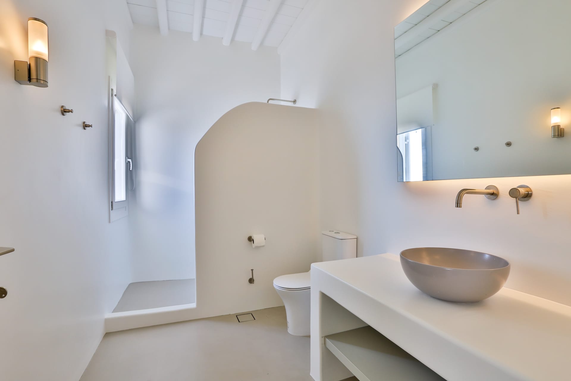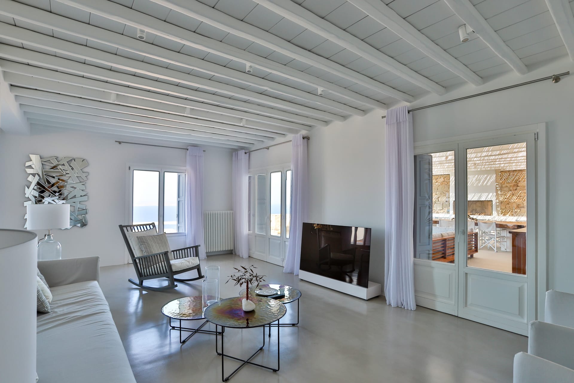 Outside, the crystal-clear heated pool invites you to bask in the Mykonian sun by day or unwind with a sunset swim by night. It’s the perfect centerpiece for lounging, entertaining, or simply soaking in the island’s beauty year-round.