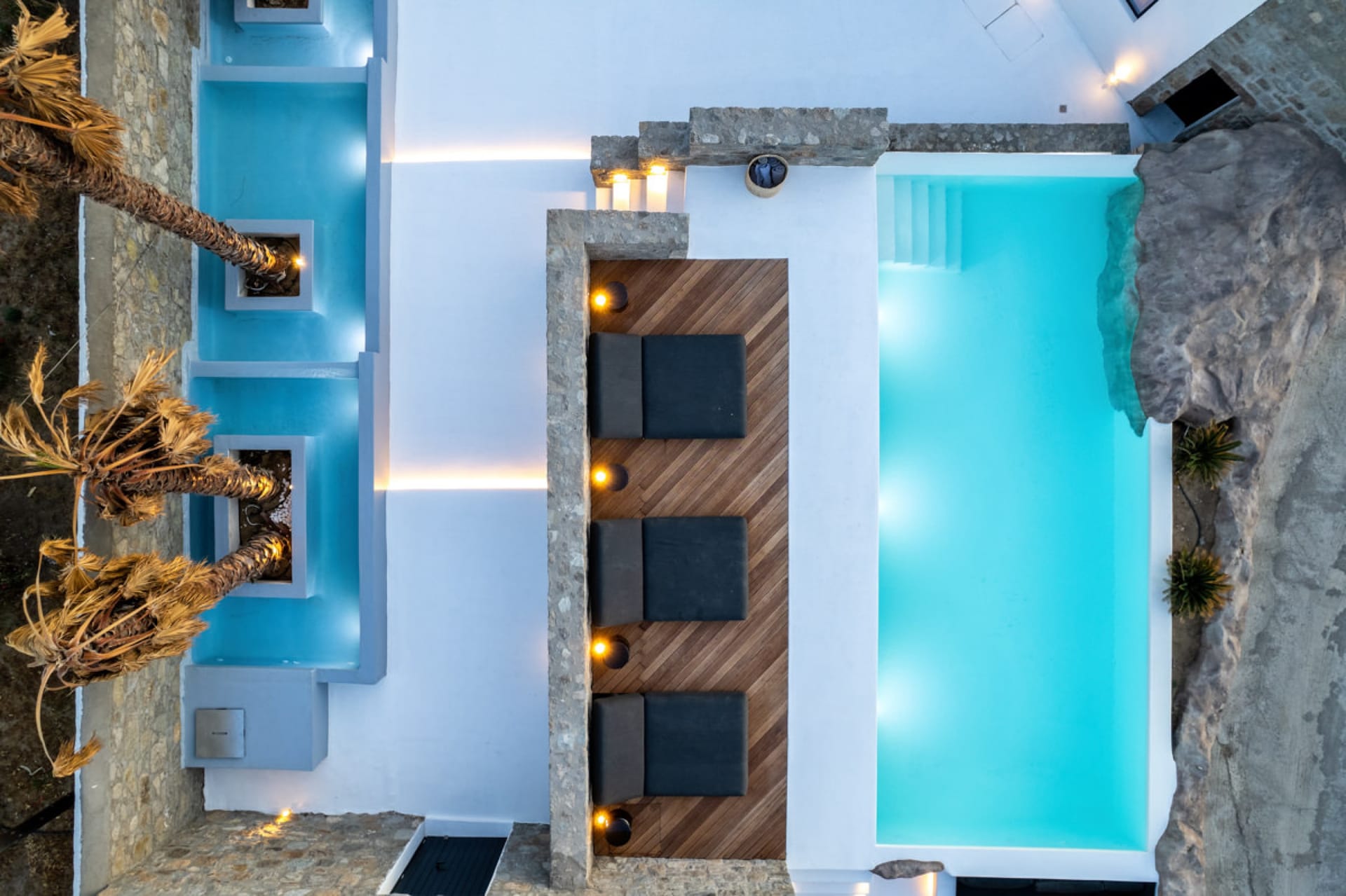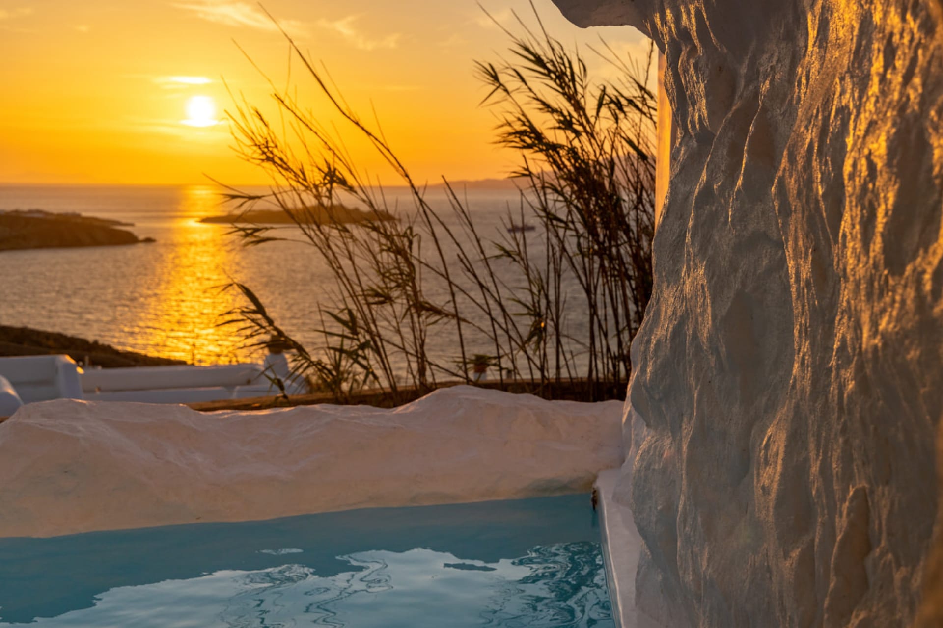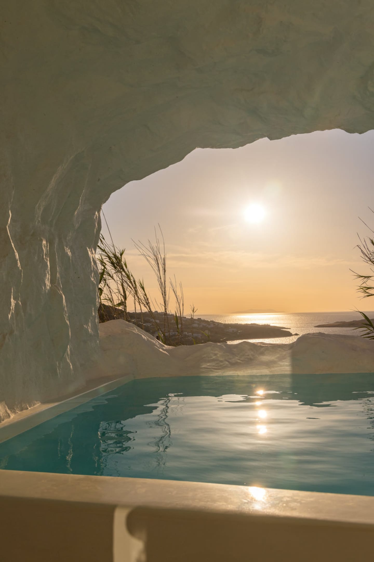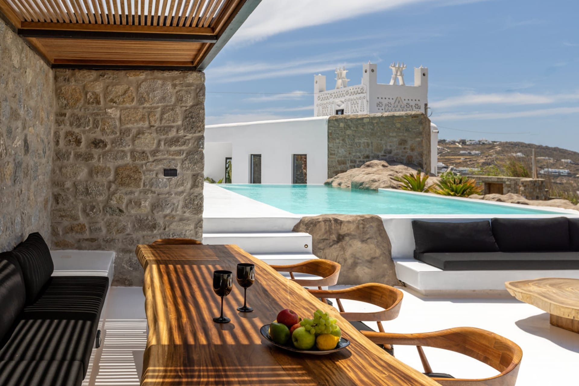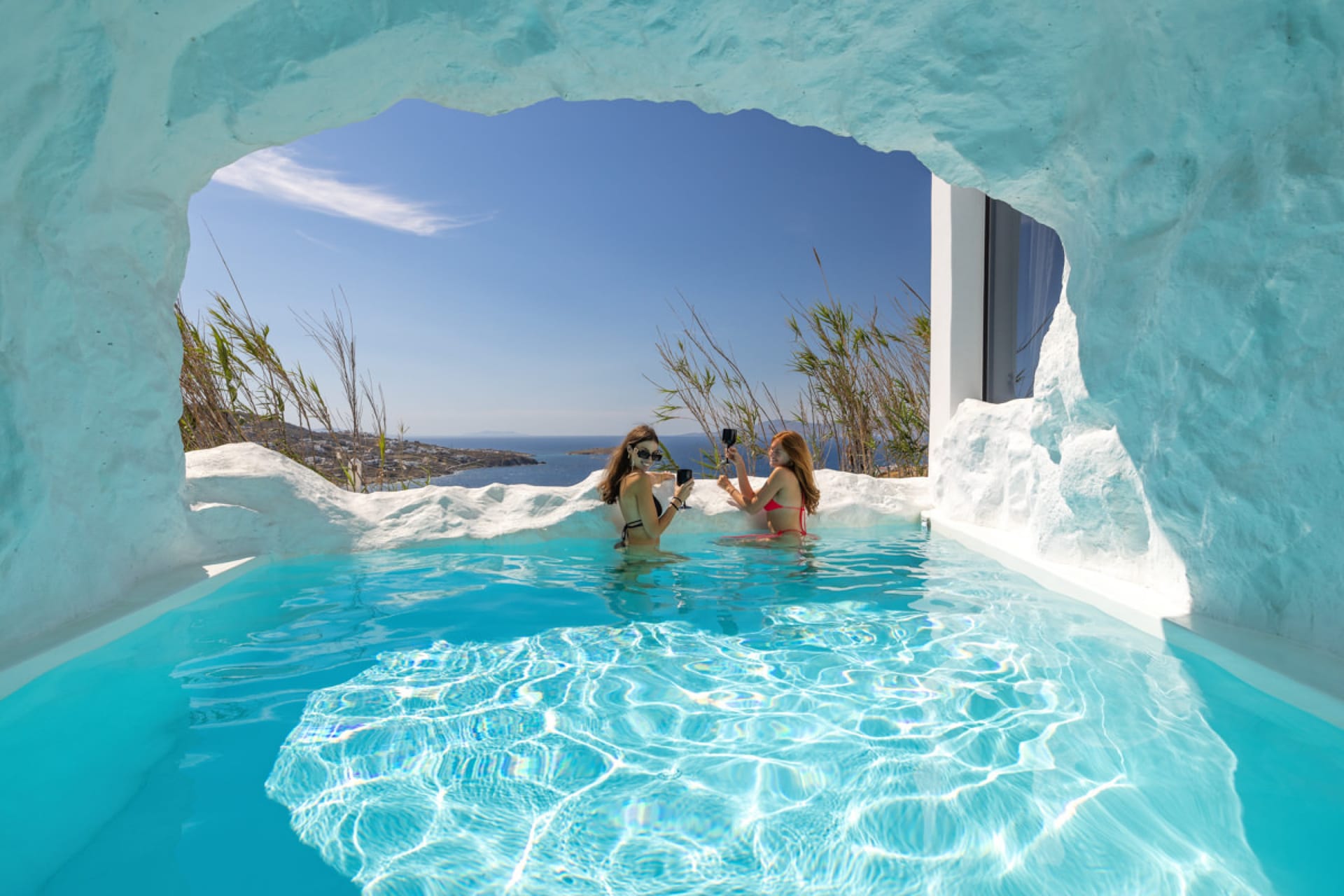 A luxury six-bedroom villa with en suite bathrooms, featuring an infinity pool, outdoor Jacuzzi, and heated cave pool. Designed for tranquility and style, it offers stunning sea views, elegant alfresco dining, and lounge areas.