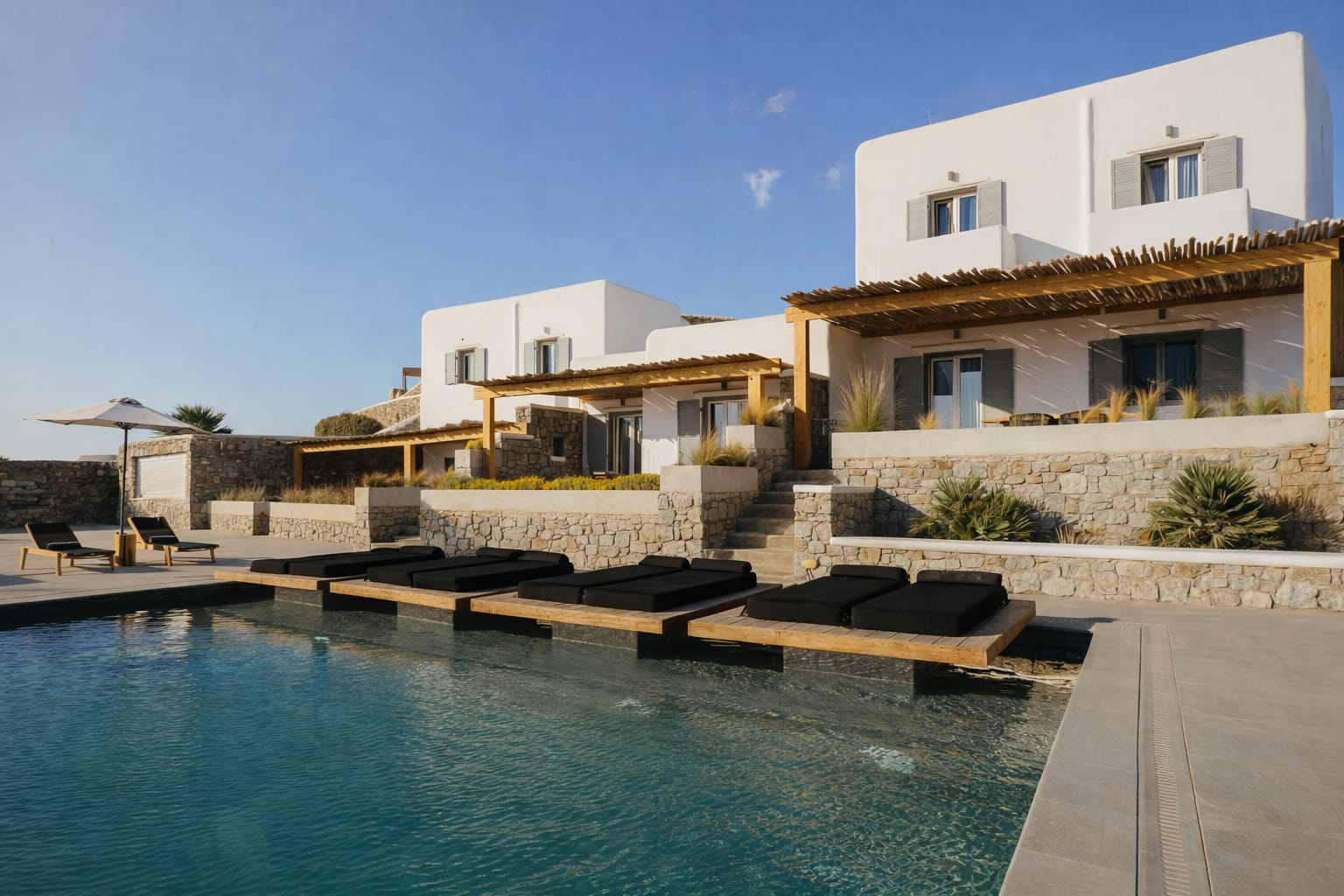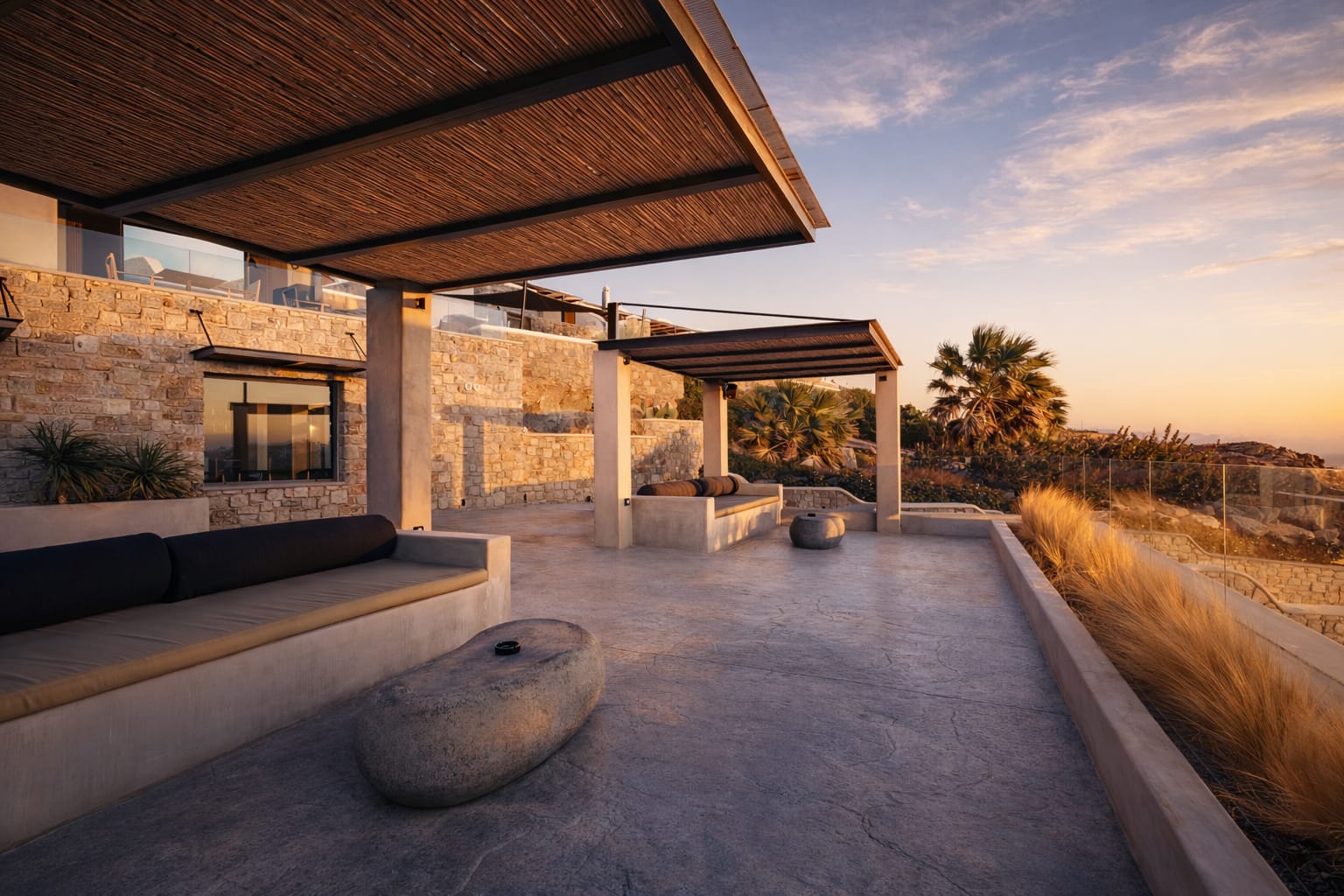 Built according to local architectural standards, the newly constructed building compliments its natural surroundings and is in perfect harmony with the land of Mykonos, honoring the Cycladic constructional forms. Villa Evi includes four luxury villas, ideal for couples, groups and VIPs, who seek luxury, modern amenities and personalized service every moment of the day.