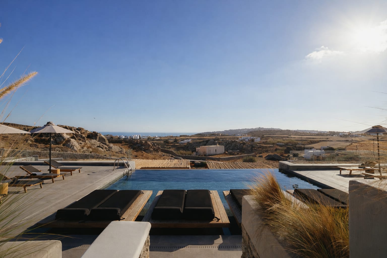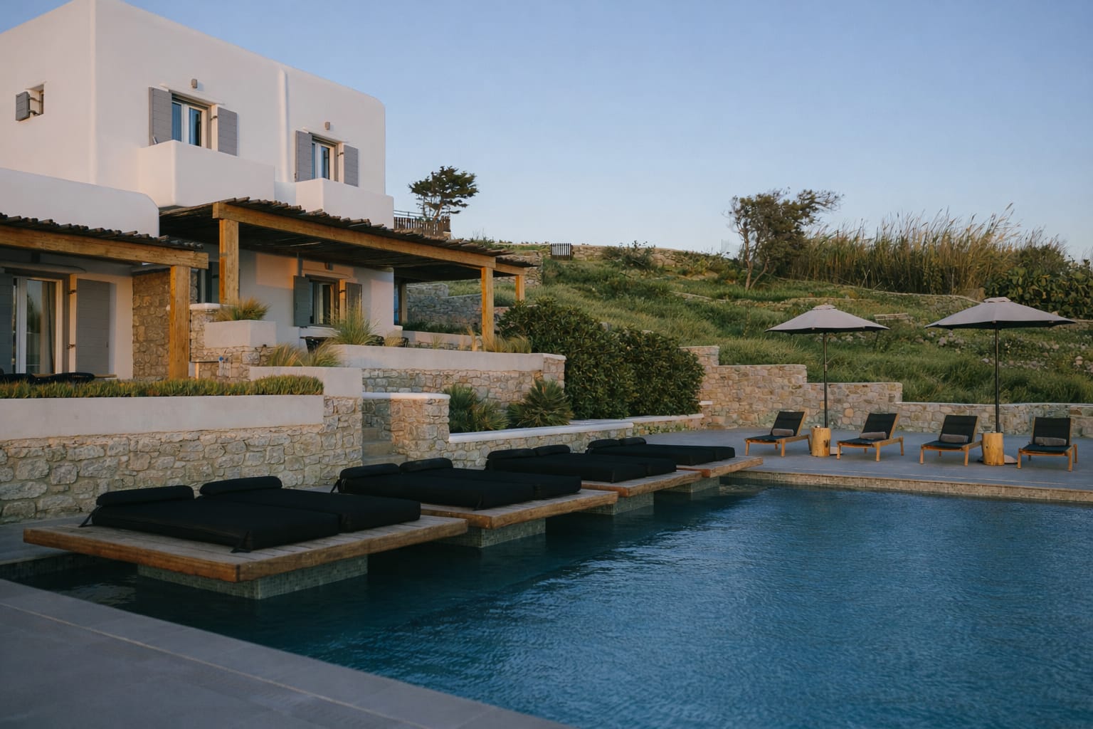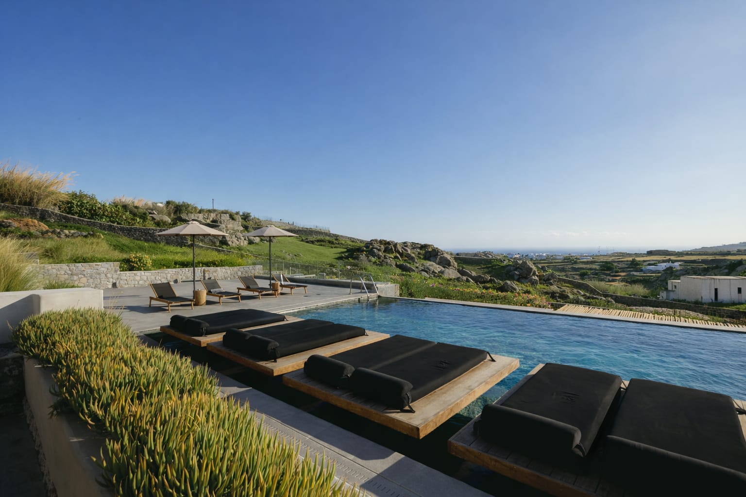 Following a private road overlooking the quintessential views of Mykonian landscape, you reach your destination for this summer, Villa Evi. In a restricted, quiet location with unparalleled panoramic views of the Aegean Sea and the Mykonian sunsets, the luxurious complex is ideal for moments of absolute serenity, peace and tranquility, away from the large crowds.