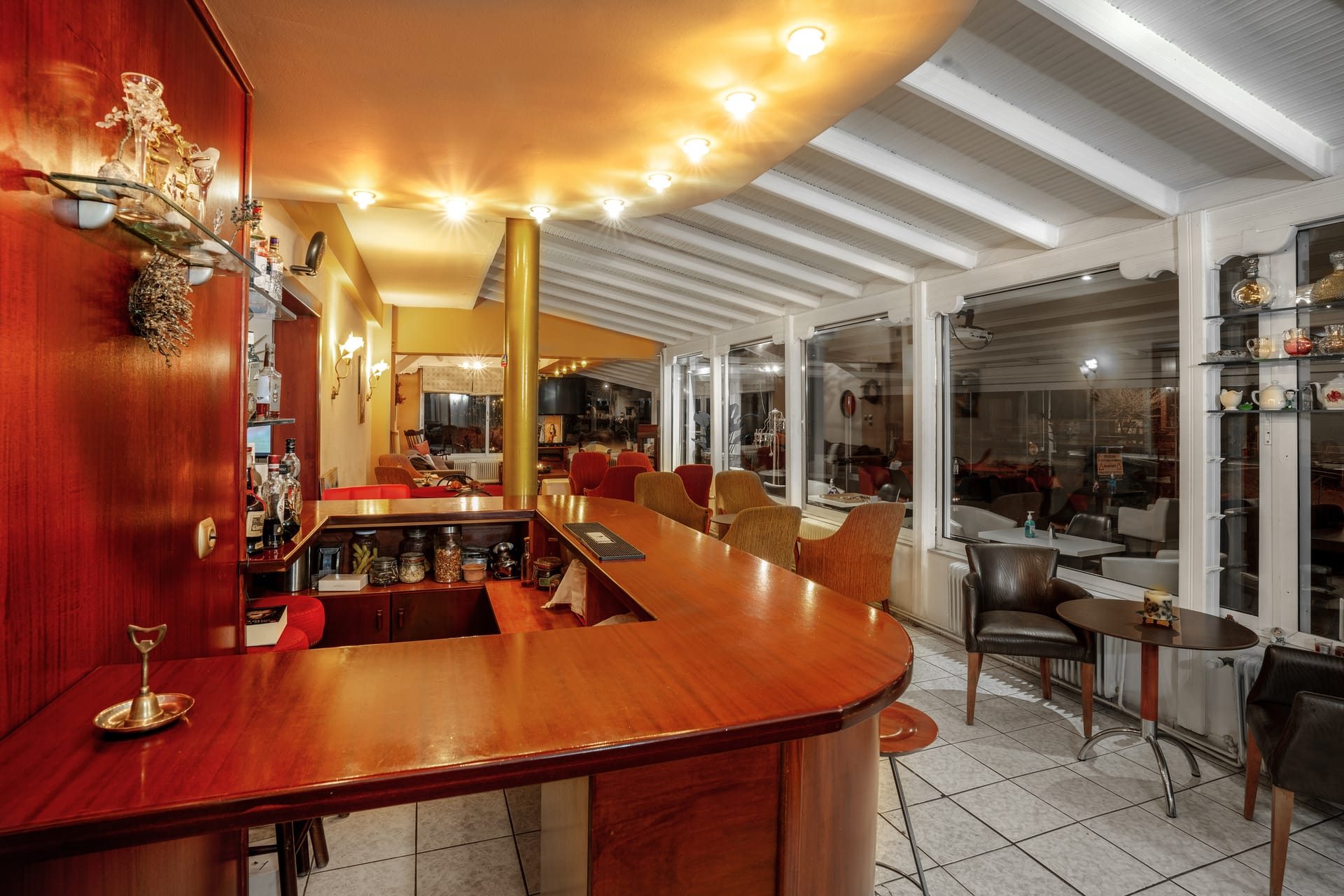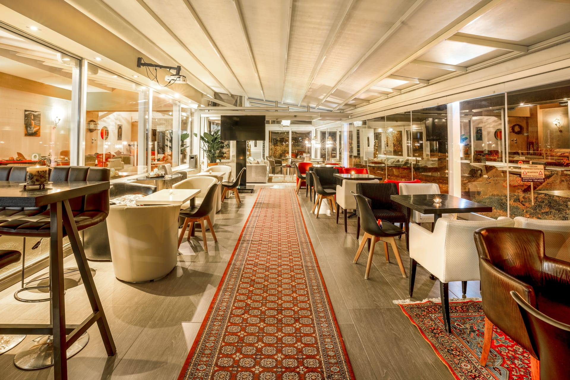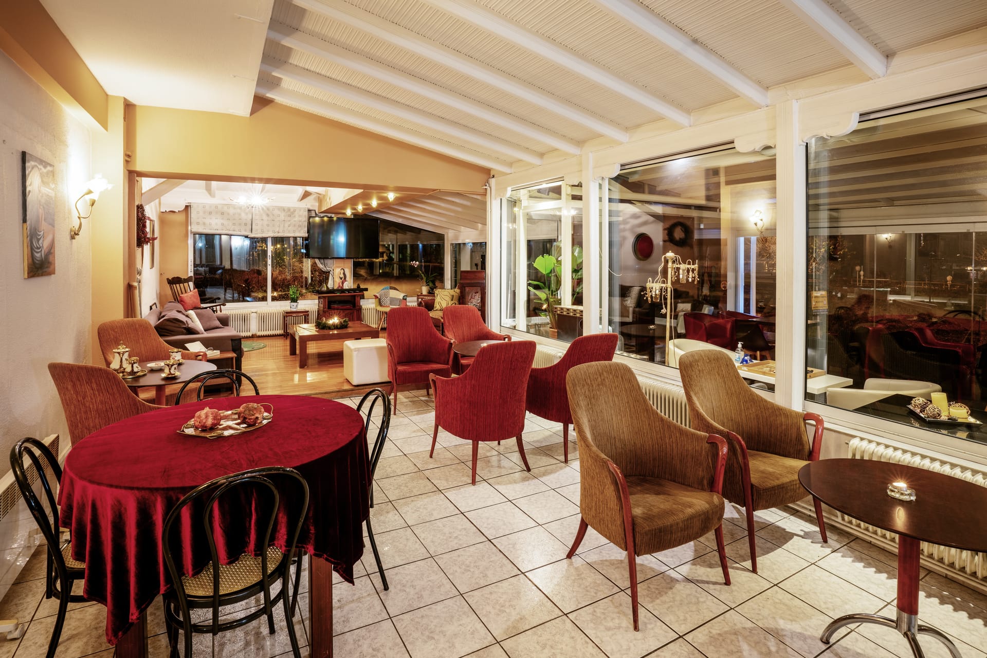 During the winter months you can sit comfortably next to the large fireplace, enjoying your drink while in the summer you will spend beautiful nights relaxing in the comfortable armchairs-swinging chairs of the lush garden.