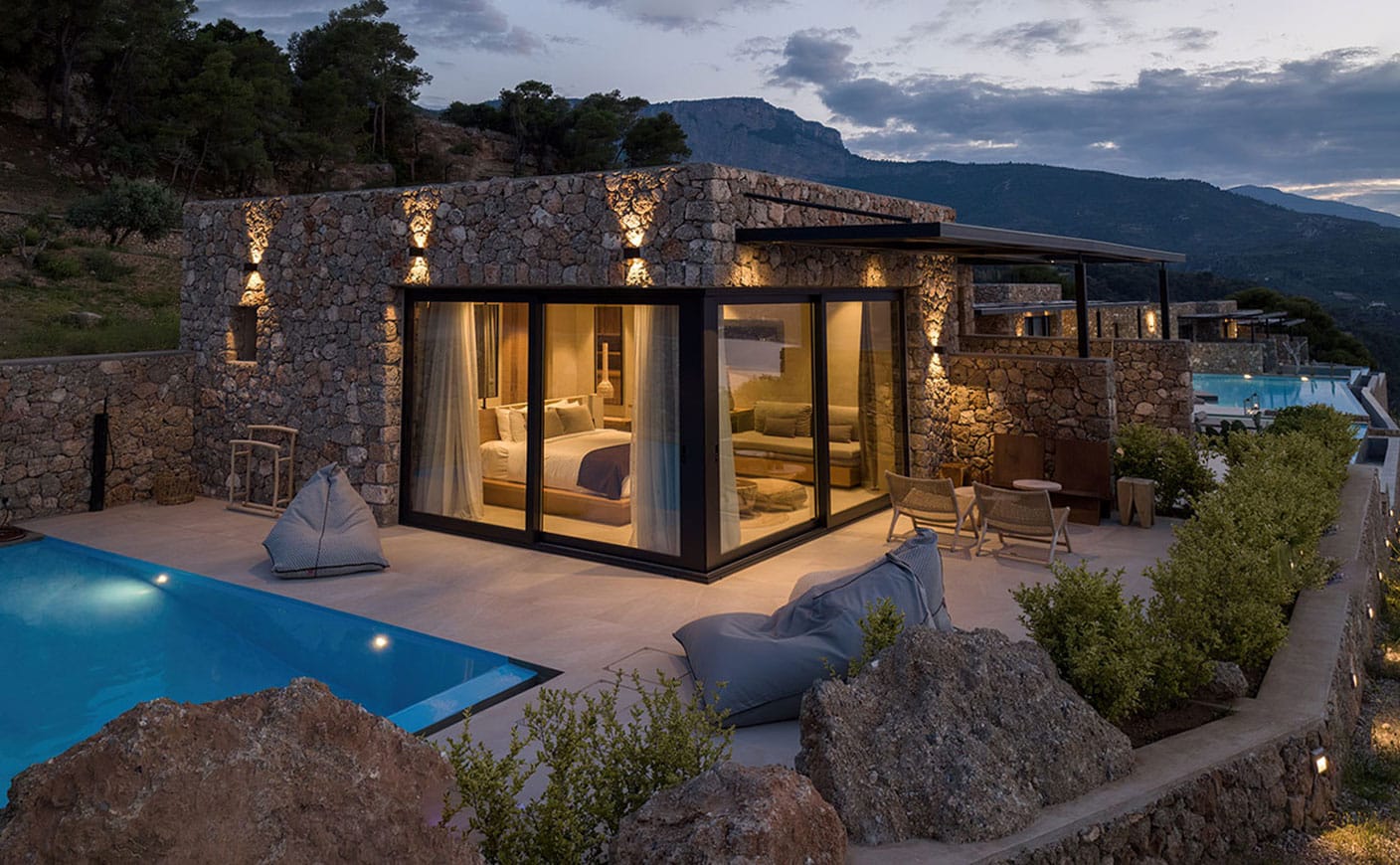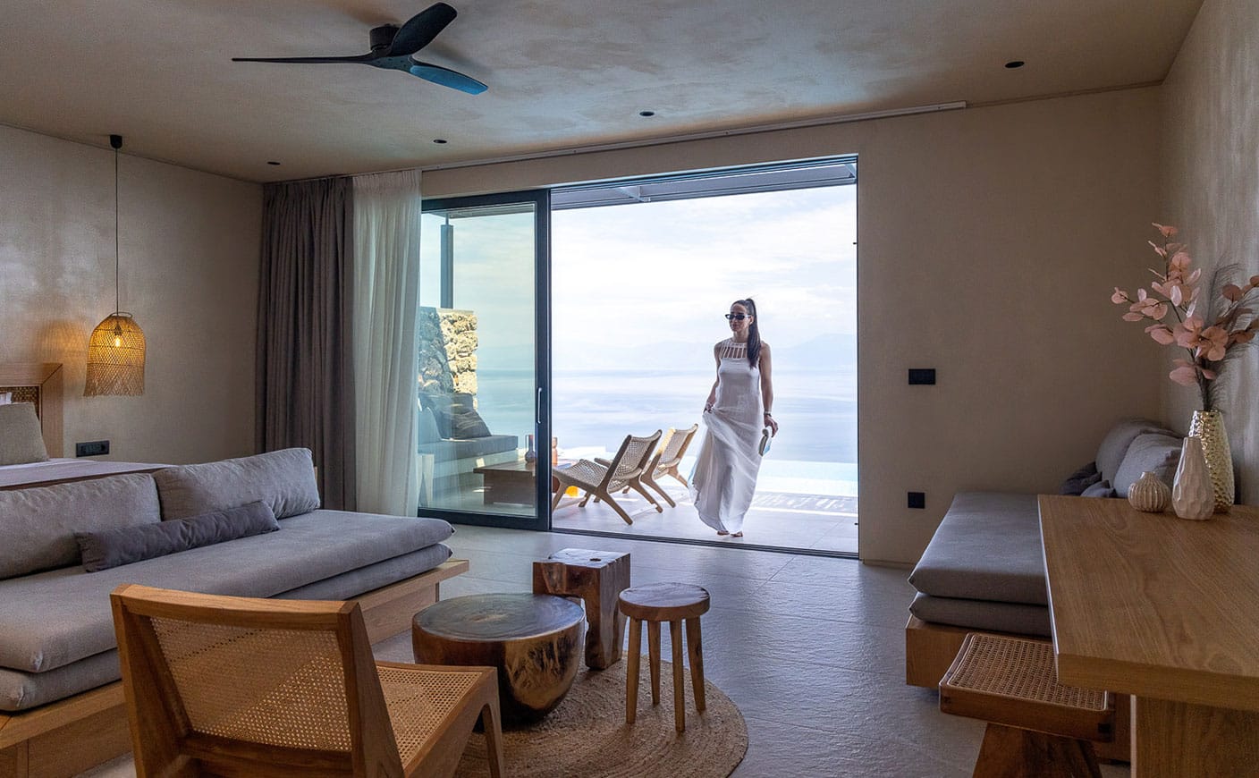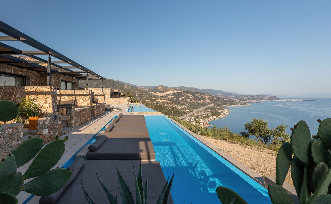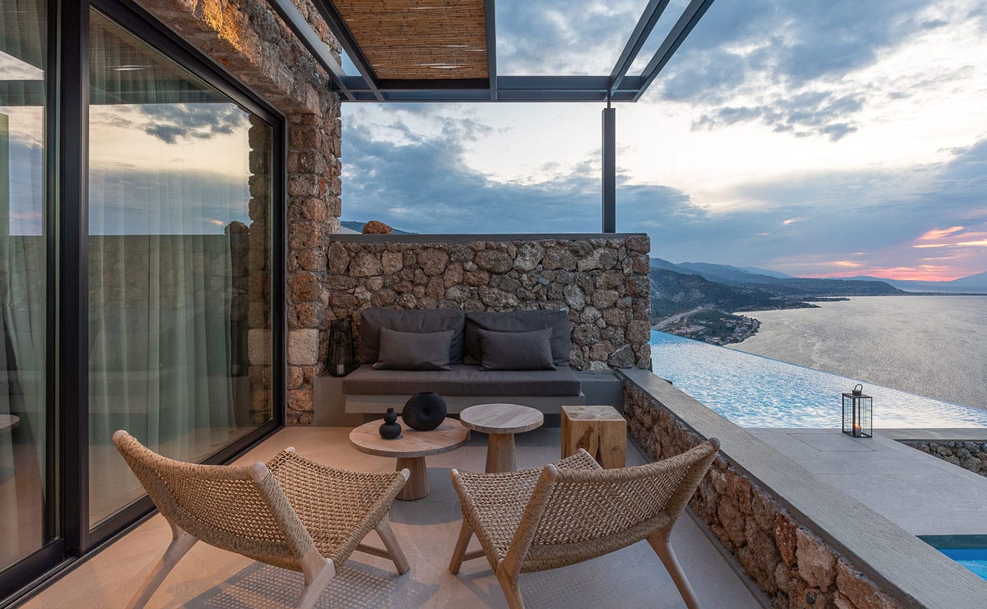 All nine suites are spacious combining earthy and natural materials with modern design and uncompromising comfort. All attractively appointed to create a distinctive and inspiring environment of authentic luxury and heartfelt hospitality in the Peloponnese, Greece, featuring private terraces, infinity pools and incredible vistas.