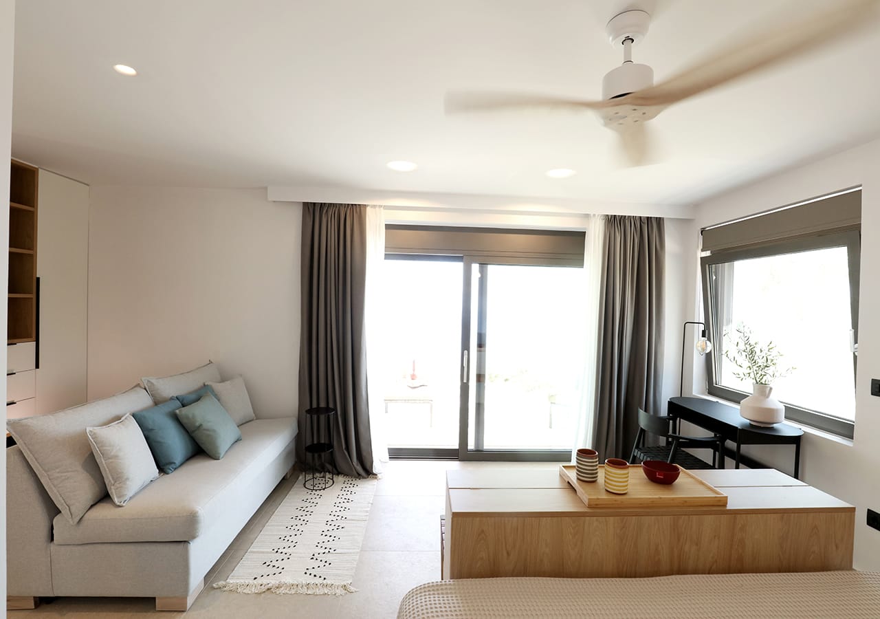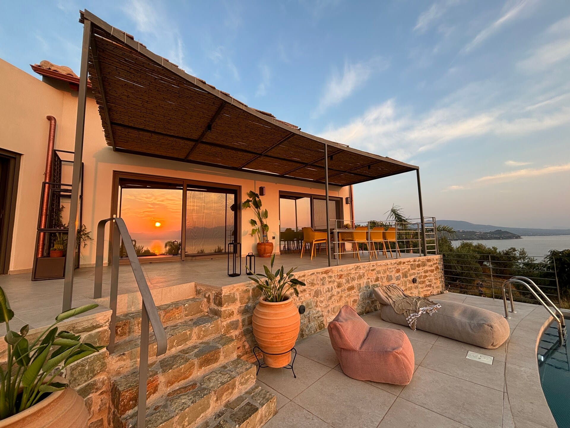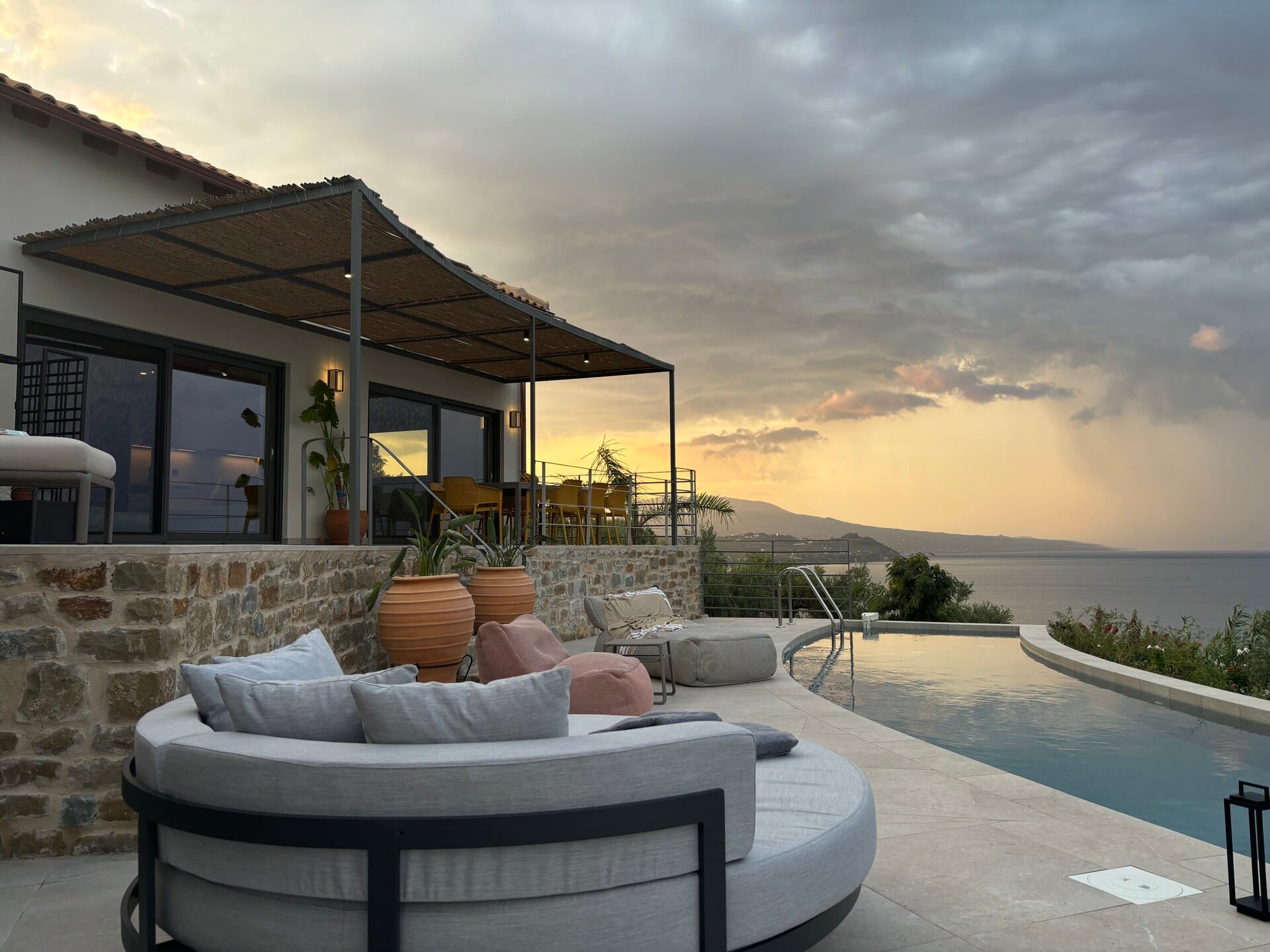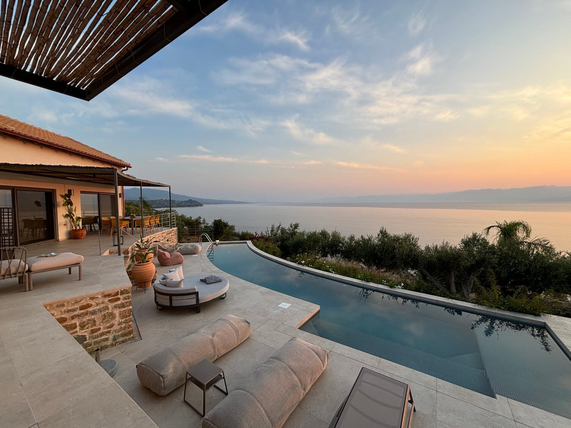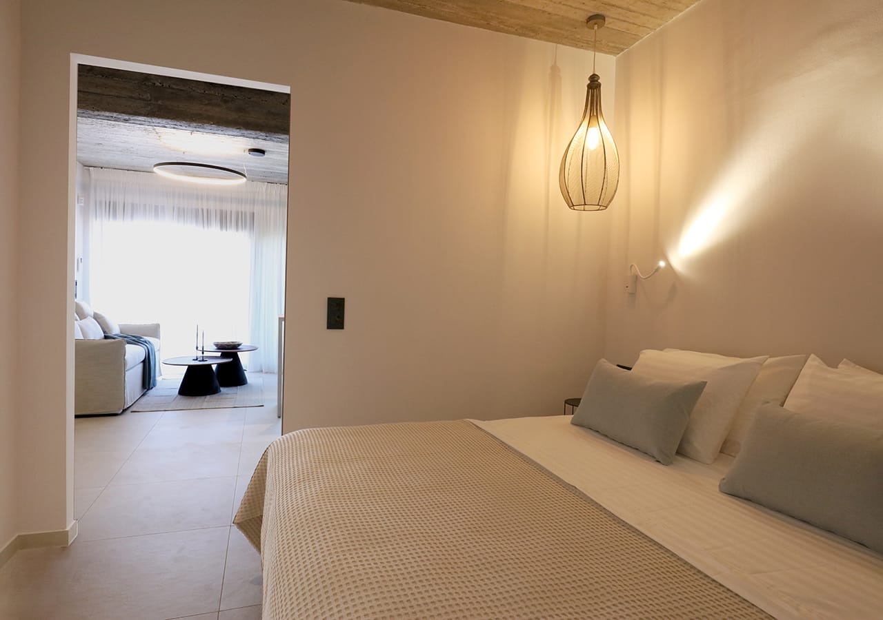 'Akria Suites' offer a perfect retreat with unlimited views of the Messinian bay, either for single or befriended couples and families, that enjoy a 10m saltwater pool right in front of their living room.