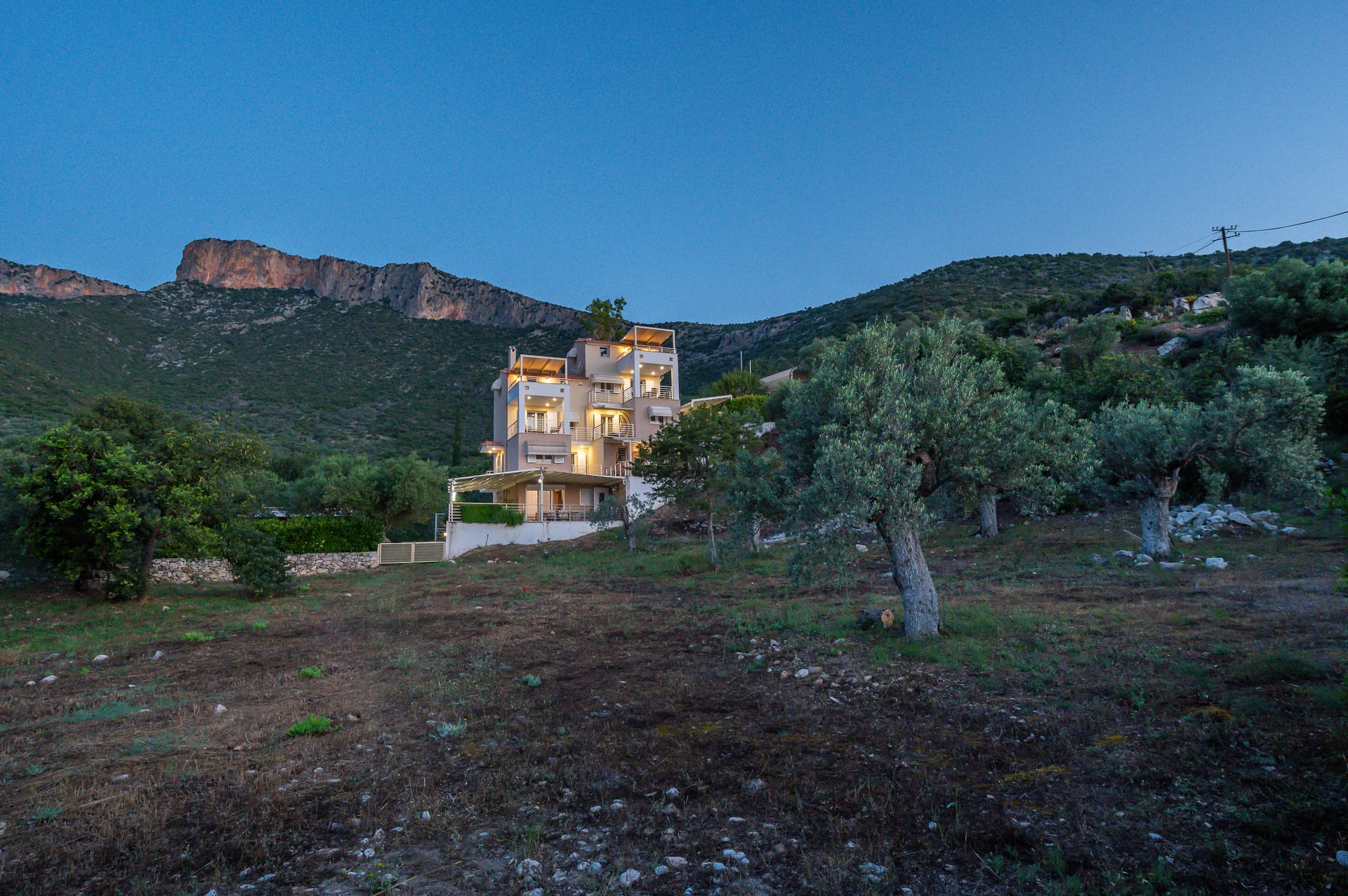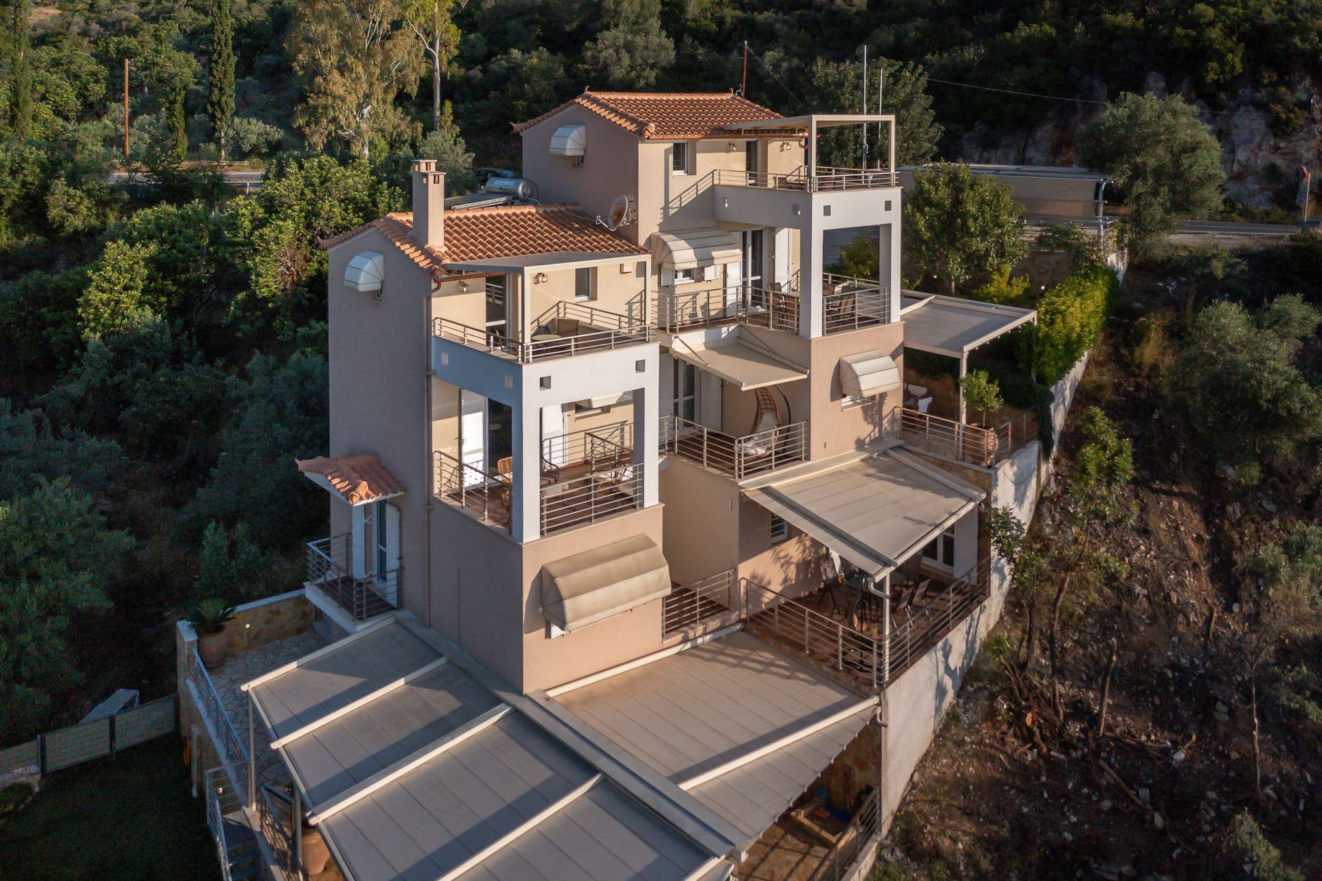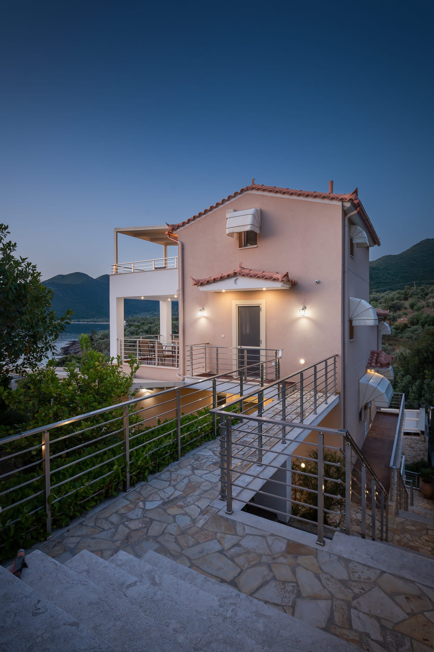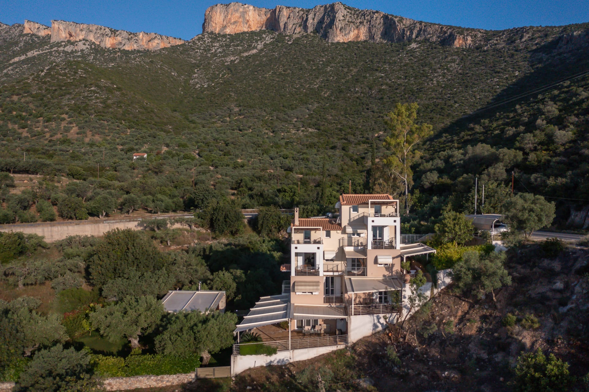 The one with 180sqm on the 1st floor has 2 rooms with double beds (TV, wardrobe), 2 rooms with bunk beds and a two-room desk (TV, wardrobe) 2 bathrooms (shower) and 1 storage room (washing machine, electric vacuum, ironing board, bucket with mop, broom with dustpan, clothes dryer) on the 2nd floor is in an open space 1 living room (TV) 1 fully equipped kitchen (dishwasher, Refrigerator, oven, hobs, coffee maker for French, coffee maker for Esresso, frappe maker, kettle etc), with a large dining room where billiards are made and 1 wc. The floor on both floors is tiled. Most areas open onto large verandas with incredible sea and mountain views where you can enjoy the enchanting dawn.