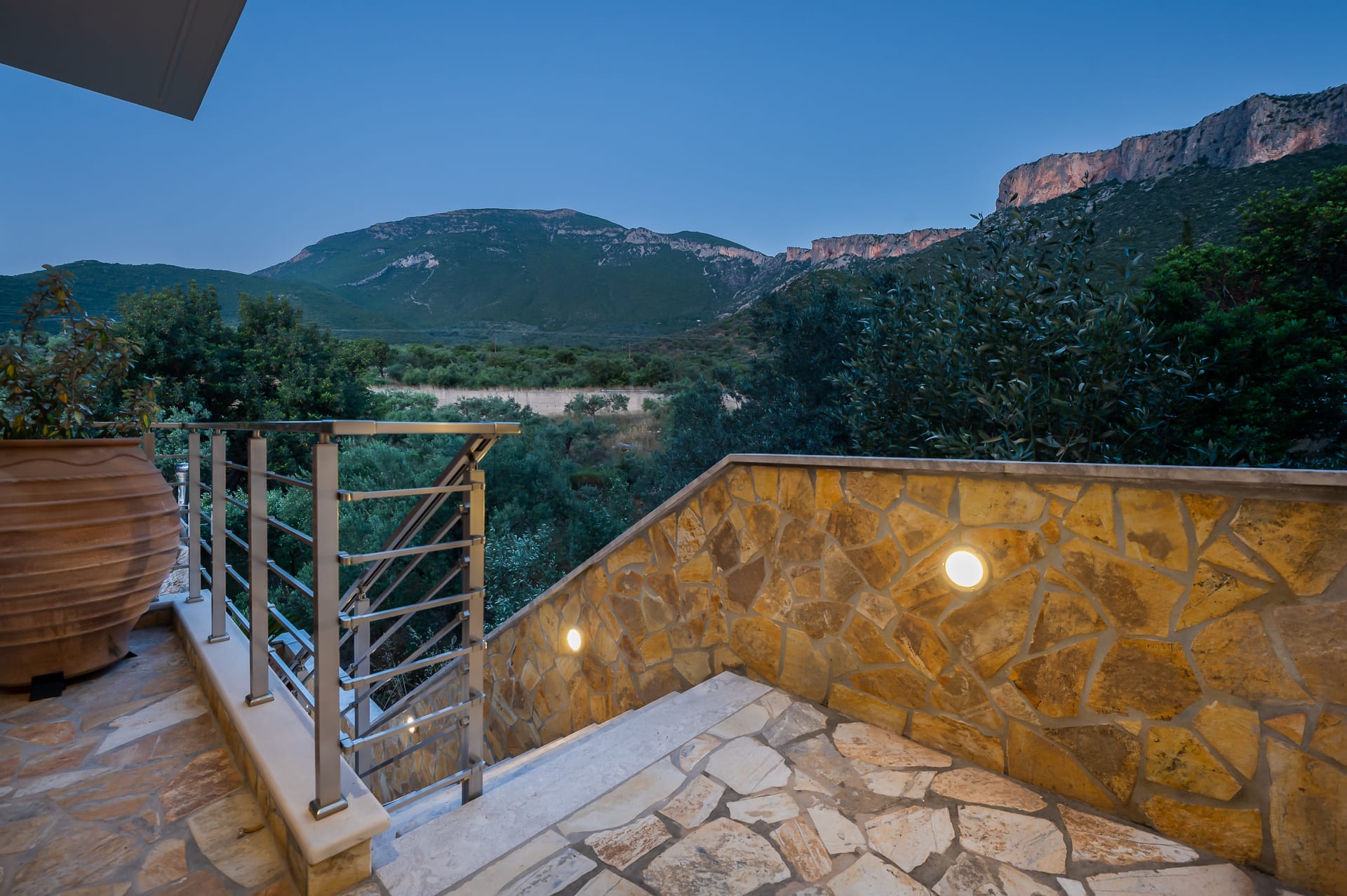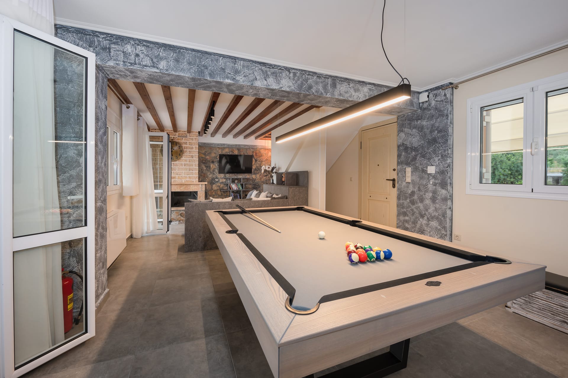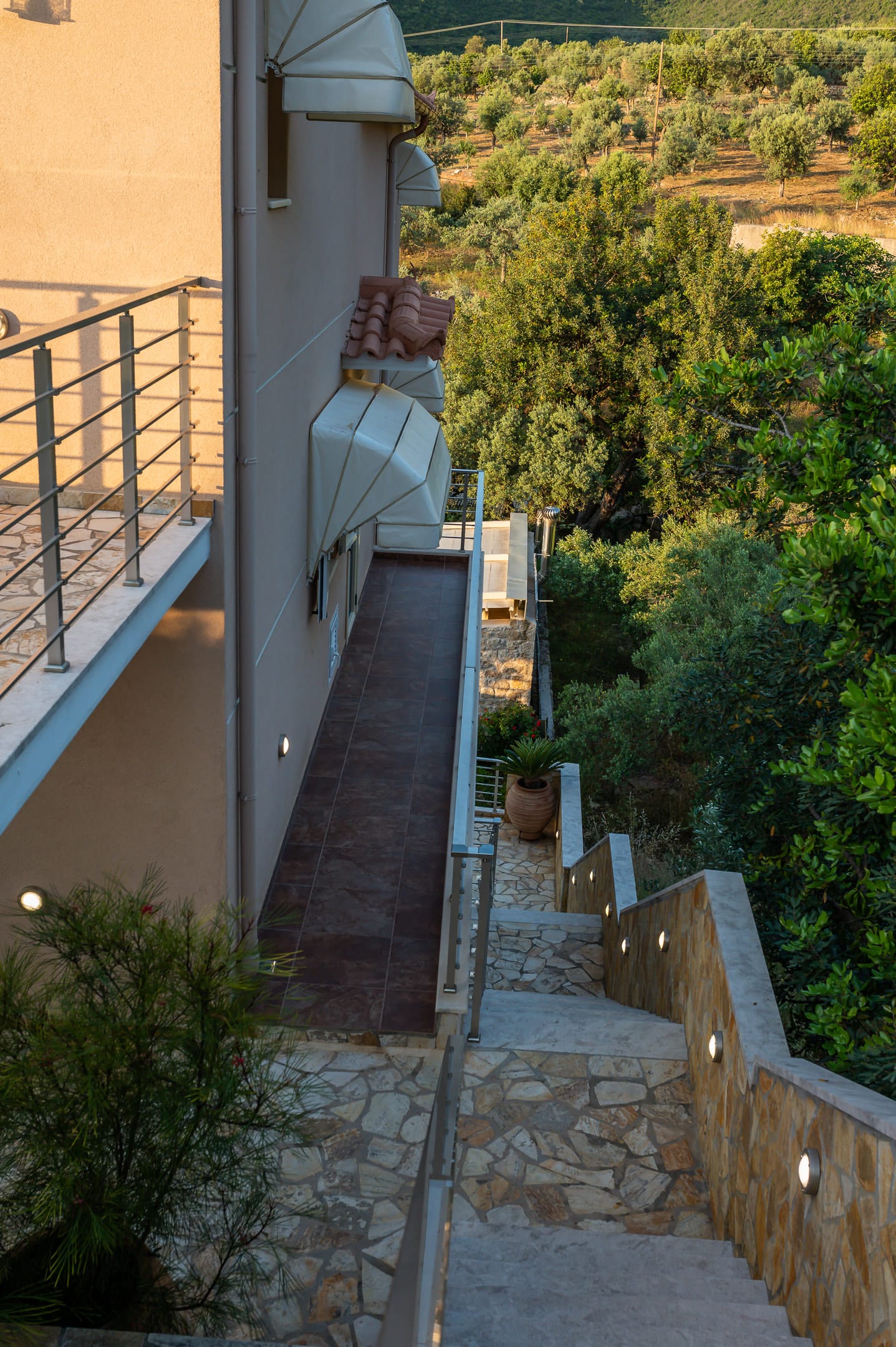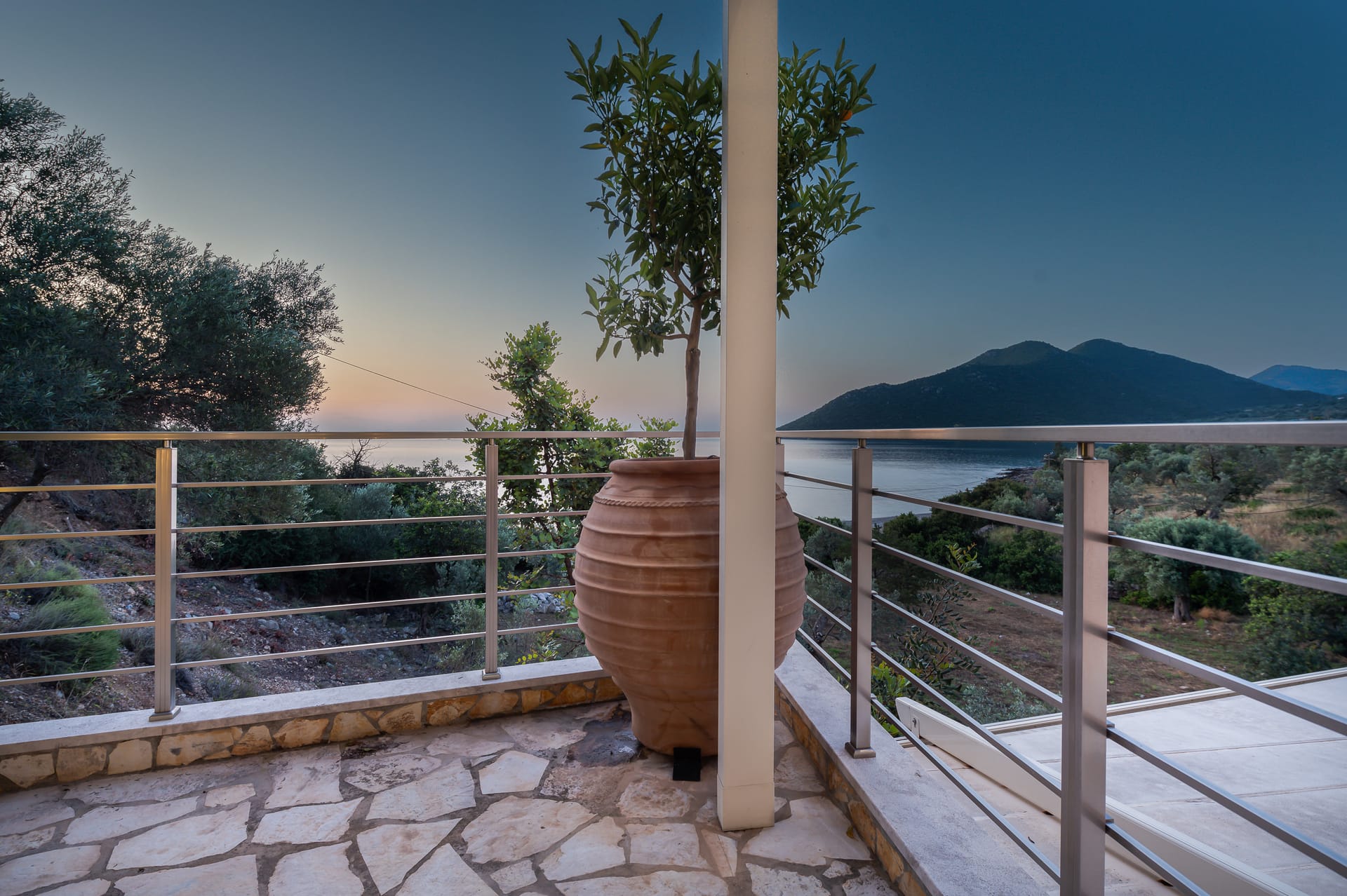 The one with 180sqm on the 1st floor has 2 rooms with double beds (TV, wardrobe), 2 rooms with bunk beds and a two-room desk (TV, wardrobe) 2 bathrooms (shower) and 1 storage room (washing machine, electric vacuum, ironing board, bucket with mop, broom with dustpan, clothes dryer) on the 2nd floor is in an open space 1 living room (TV) 1 fully equipped kitchen (dishwasher, Refrigerator, oven, hobs, coffee maker for French, coffee maker for Esresso, frappe maker, kettle etc), with a large dining room where billiards are made and 1 wc. The floor on both floors is tiled. Most areas open onto large verandas with incredible sea and mountain views where you can enjoy the enchanting dawn.