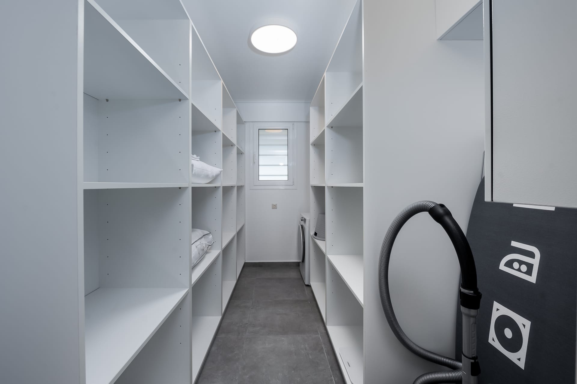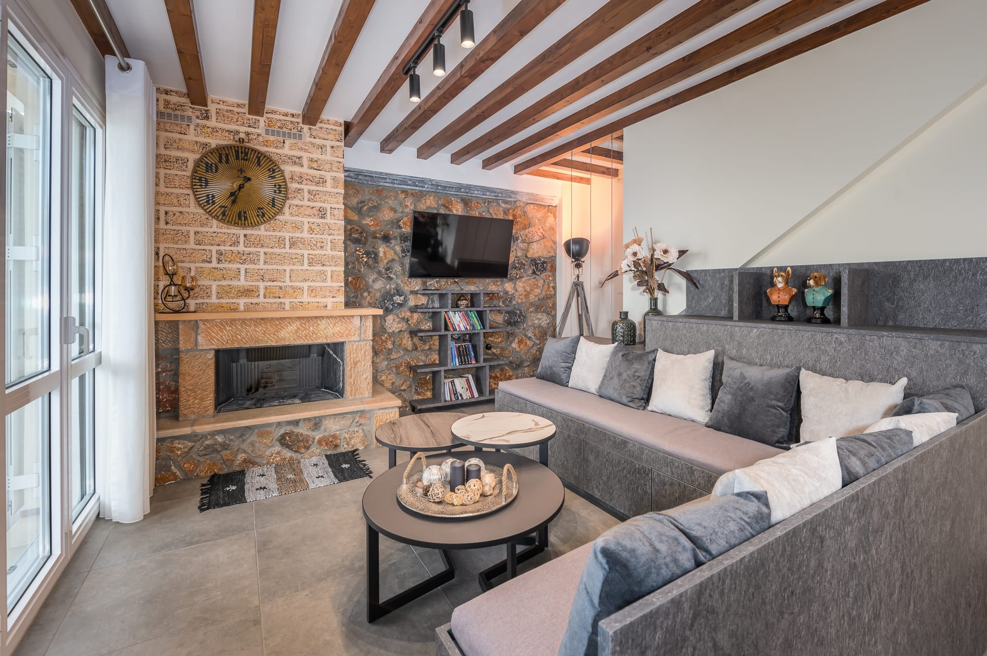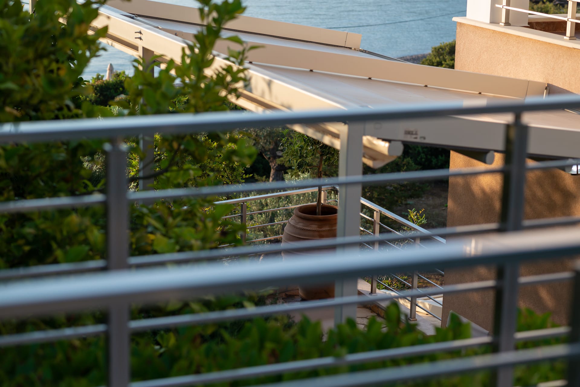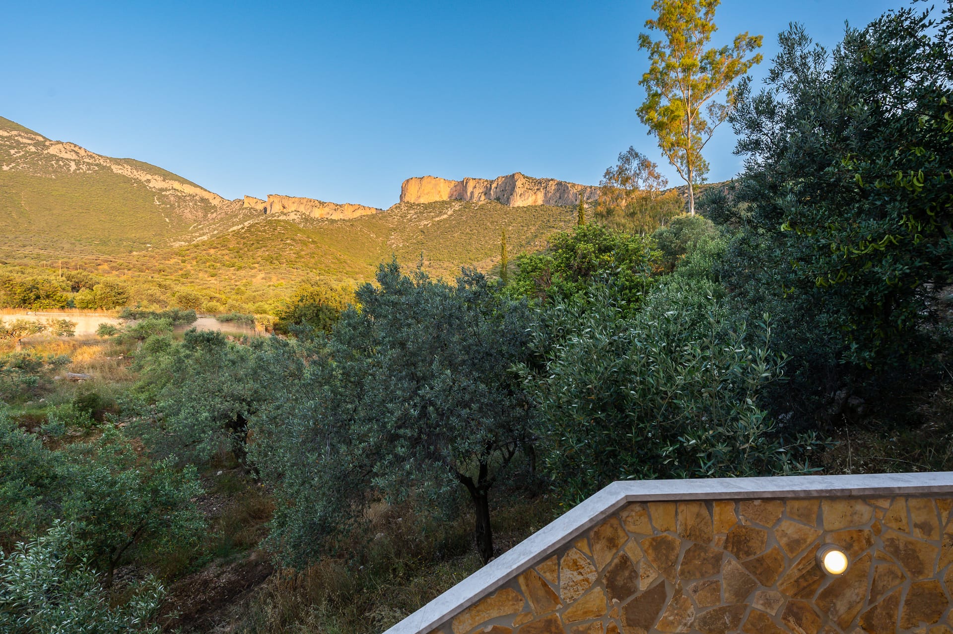 The one with 180sqm on the 1st floor has 2 rooms with double beds (TV, wardrobe), 2 rooms with bunk beds and a two-room desk (TV, wardrobe) 2 bathrooms (shower) and 1 storage room (washing machine, electric vacuum, ironing board, bucket with mop, broom with dustpan, clothes dryer) on the 2nd floor is in an open space 1 living room (TV) 1 fully equipped kitchen (dishwasher, Refrigerator, oven, hobs, coffee maker for French, coffee maker for Esresso, frappe maker, kettle etc), with a large dining room where billiards are made and 1 wc. The floor on both floors is tiled. Most areas open onto large verandas with incredible sea and mountain views where you can enjoy the enchanting dawn.