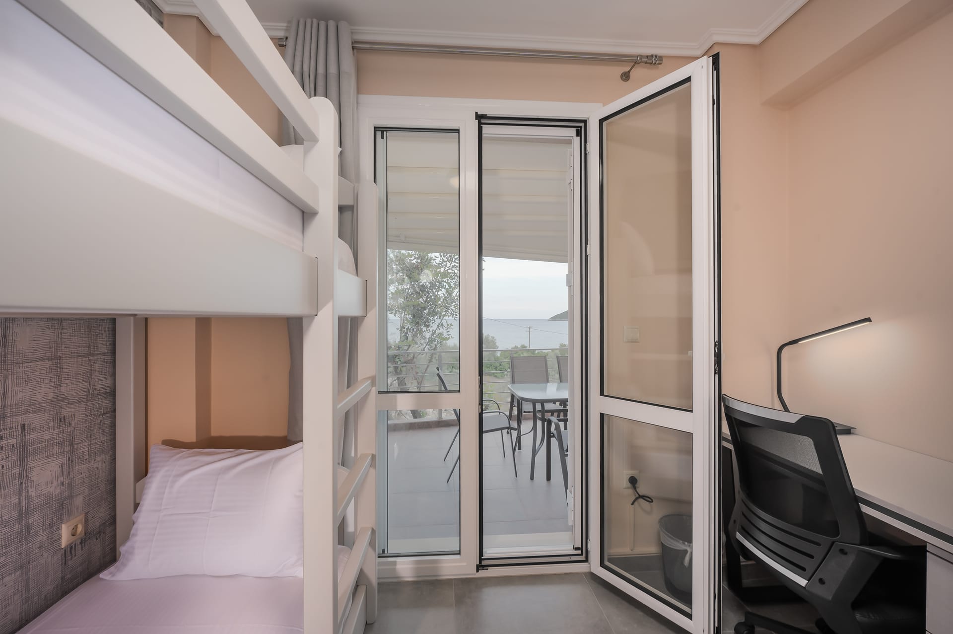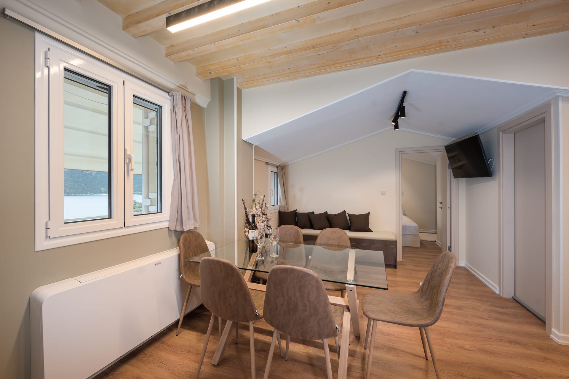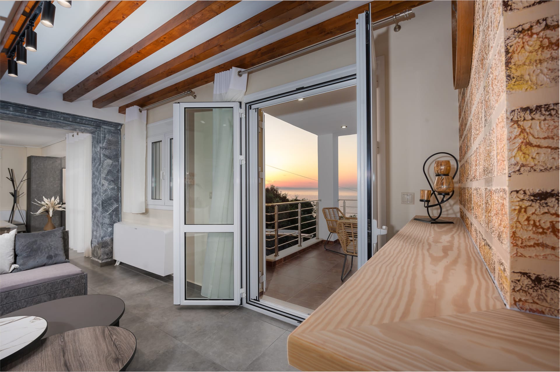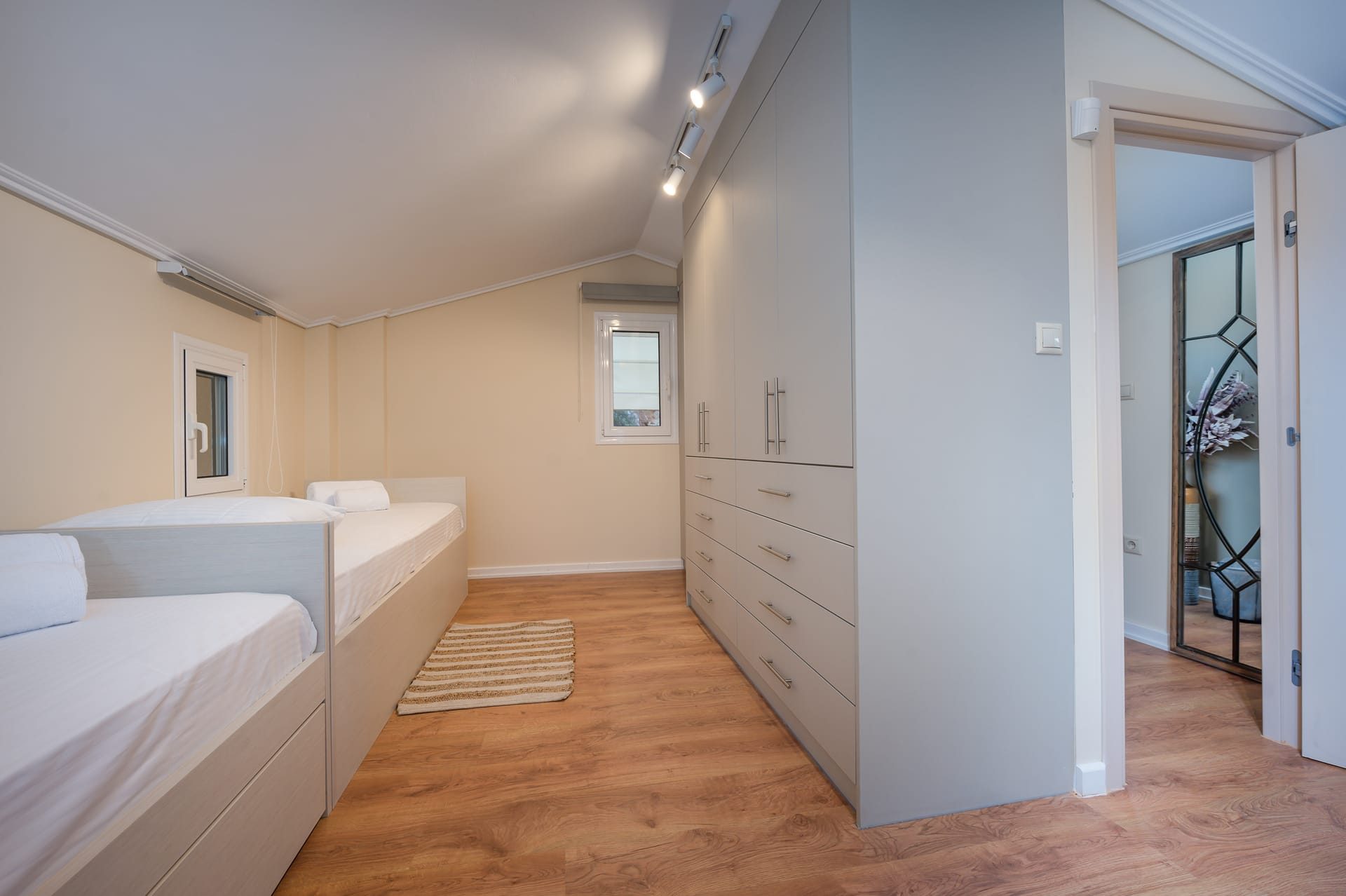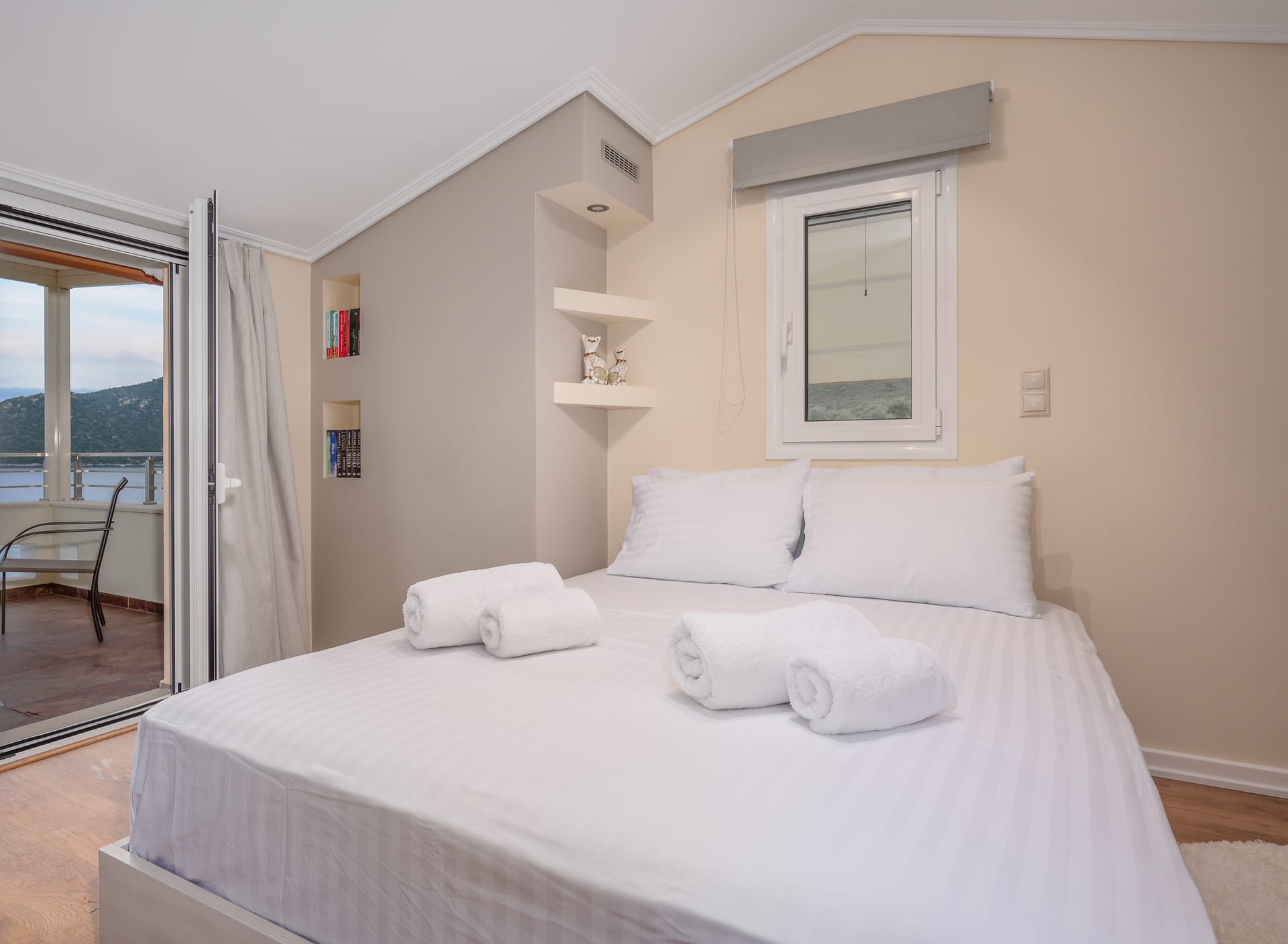 This one of 80sqm on the 3rd floor has 1 room with 1 double bed (wardrobe, painting toilet with mirror and stool) in an open space 1 living room (TV) and 1 fully equipped kitchen (dishwasher, refrigerator, oven, hob, washing machine, coffee maker for French coffee, coffee maker for esresso, frappe maker, kettle etc), 1 small storage room (electric vacuum, ironing board, swiffer mop with vetex, broom with dustpan, clothes rack) and 1 bathroom (shower).Going up to the 4th floor by a wooden staircase is 1 room with 3 single beds and 1 two-seat desk (wardrobe, TV).The floor on both floors is made of wood except for the bathroom which is tiled. All areas open onto large verandas with sea and mountain views where you can enjoy the enchanting dawn.