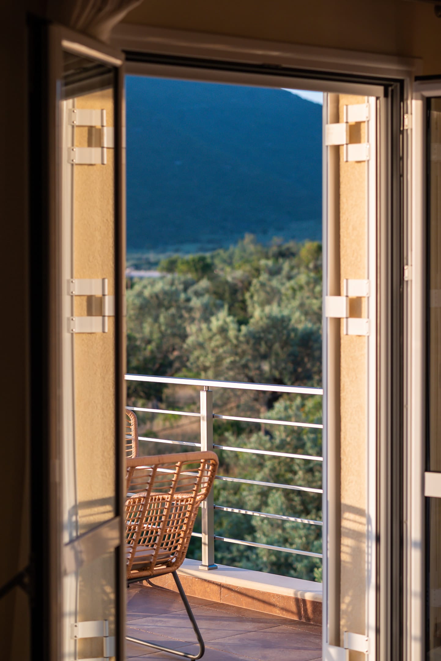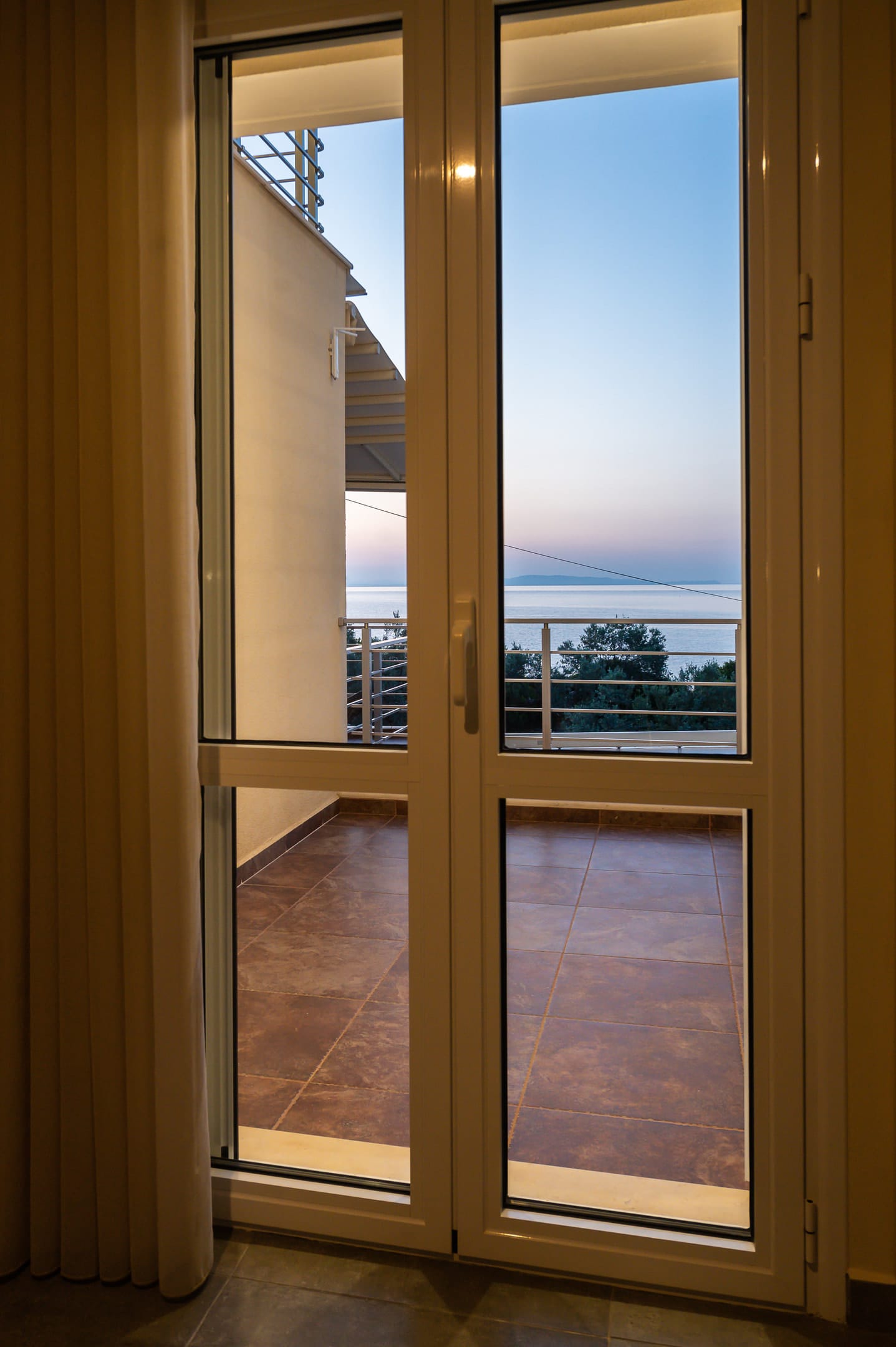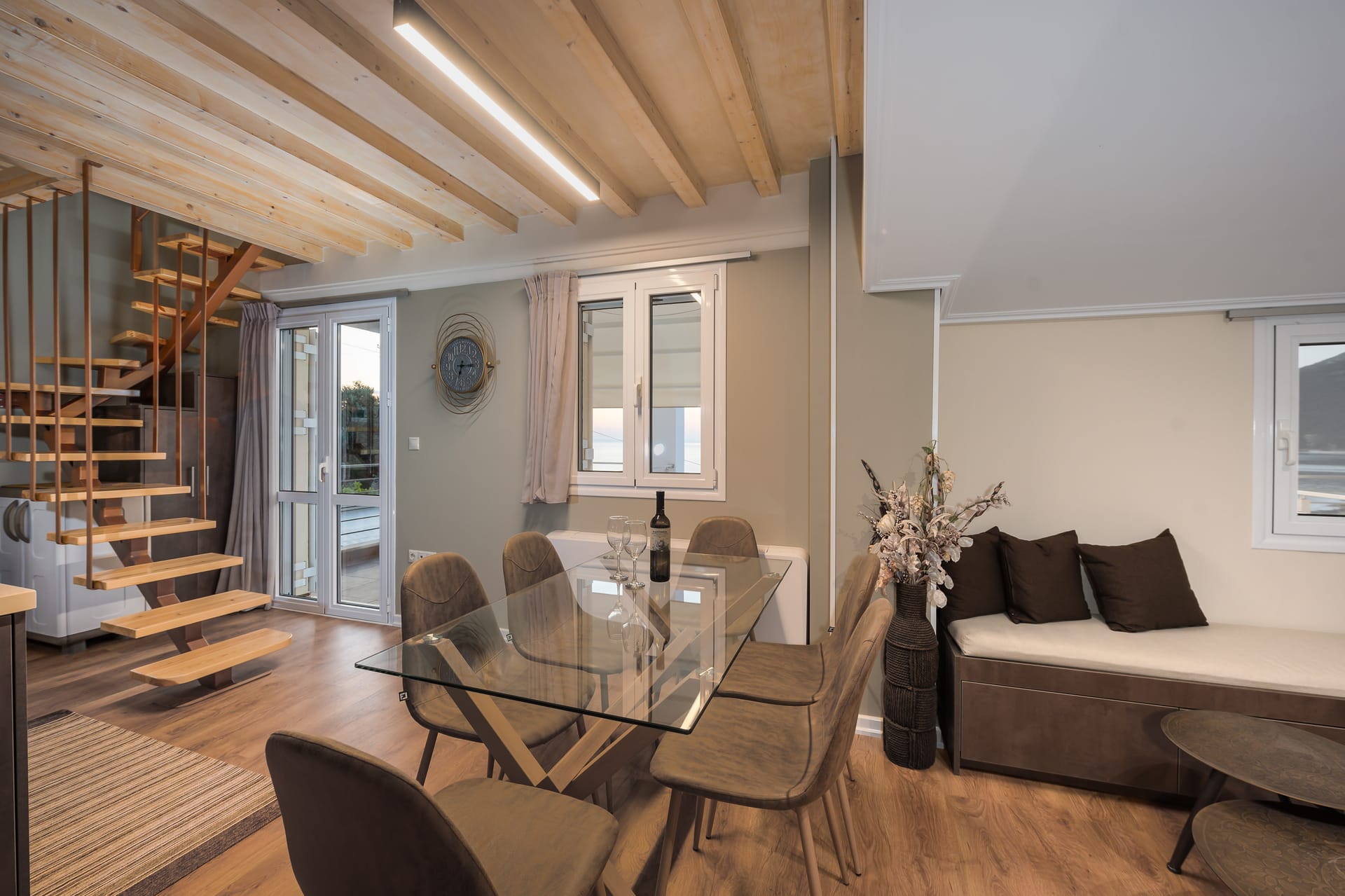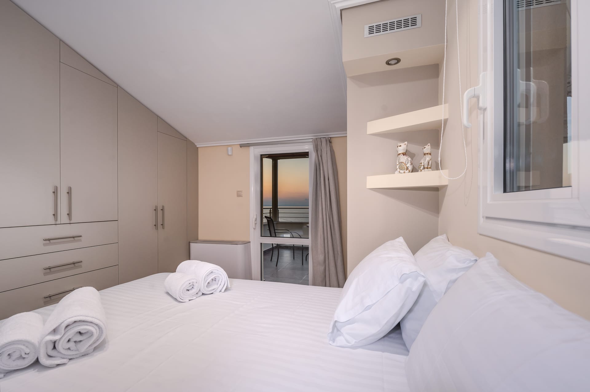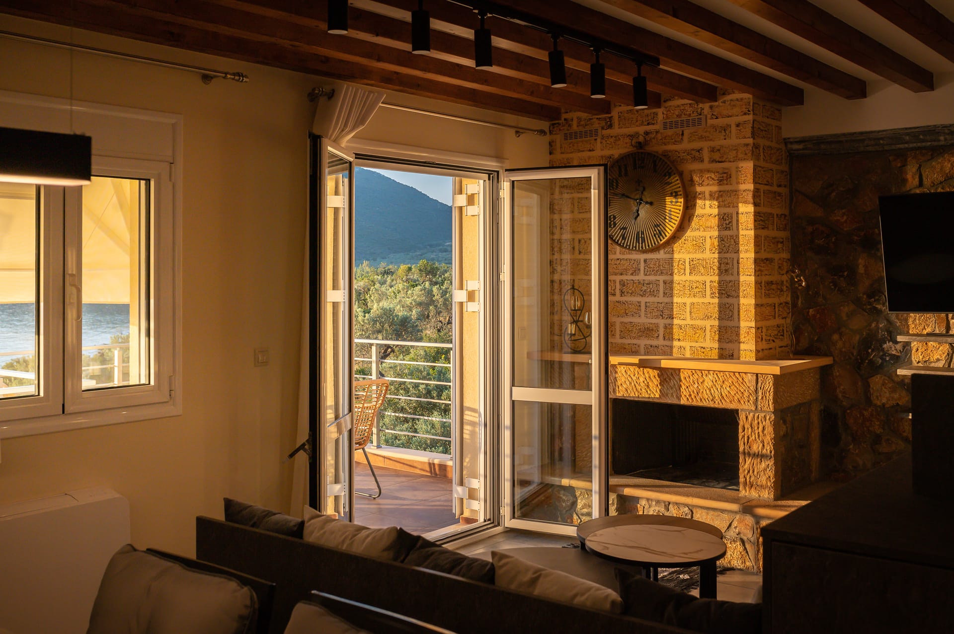 This one of 80sqm on the 3rd floor has 1 room with 1 double bed (wardrobe, painting toilet with mirror and stool) in an open space 1 living room (TV) and 1 fully equipped kitchen (dishwasher, refrigerator, oven, hob, washing machine, coffee maker for French coffee, coffee maker for esresso, frappe maker, kettle etc), 1 small storage room (electric vacuum, ironing board, swiffer mop with vetex, broom with dustpan, clothes rack) and 1 bathroom (shower).Going up to the 4th floor by a wooden staircase is 1 room with 3 single beds and 1 two-seat desk (wardrobe, TV).The floor on both floors is made of wood except for the bathroom which is tiled. All areas open onto large verandas with sea and mountain views where you can enjoy the enchanting dawn.