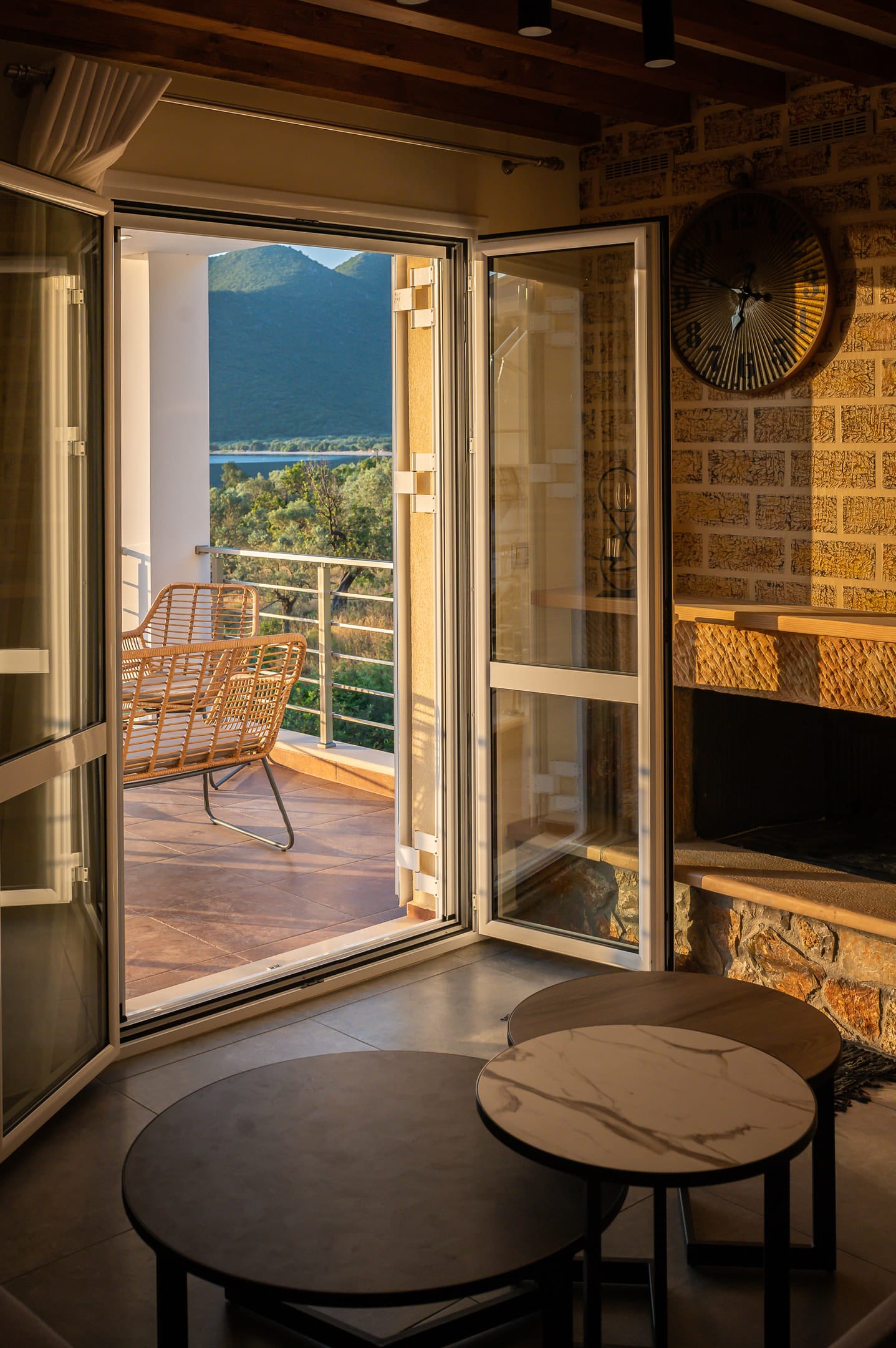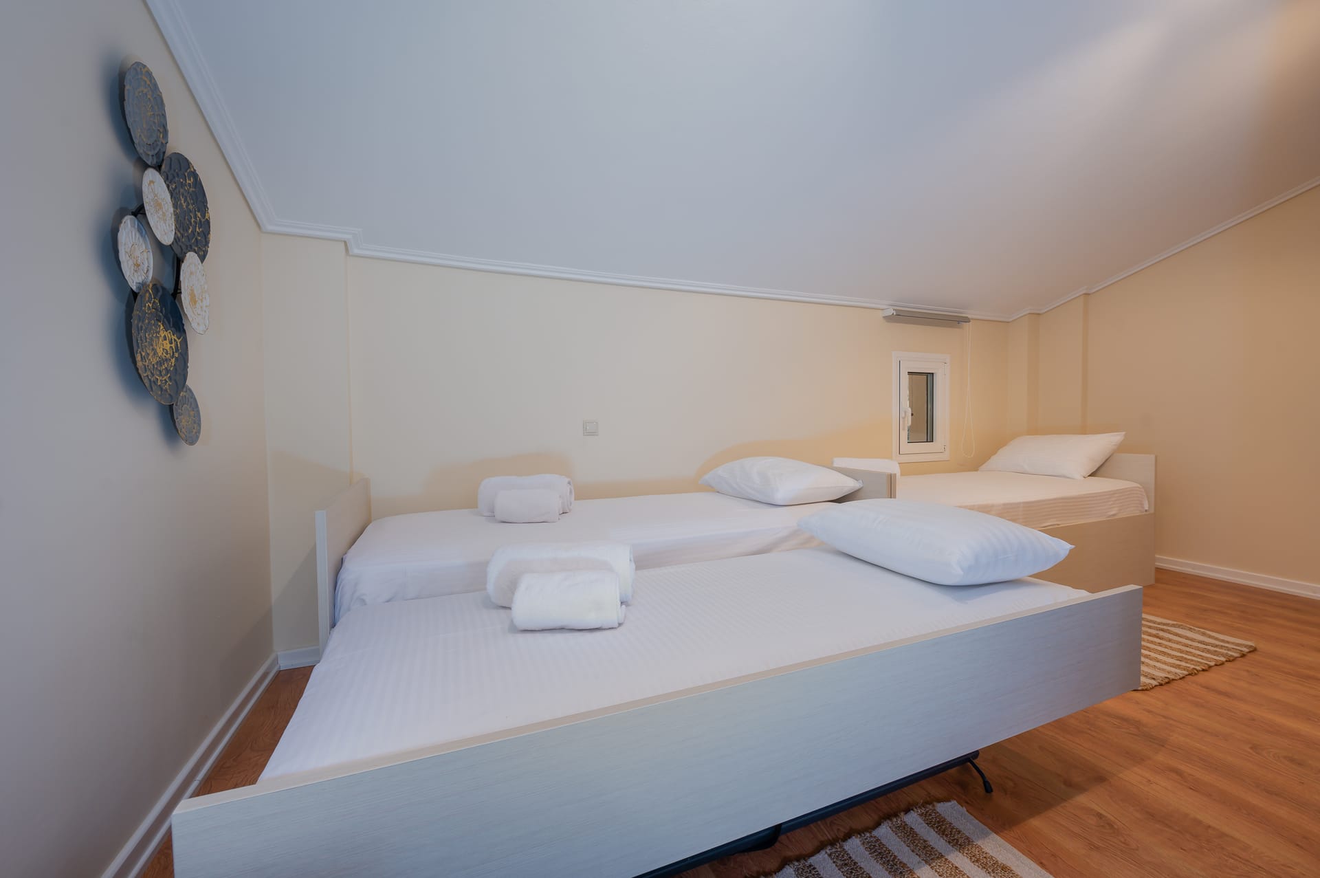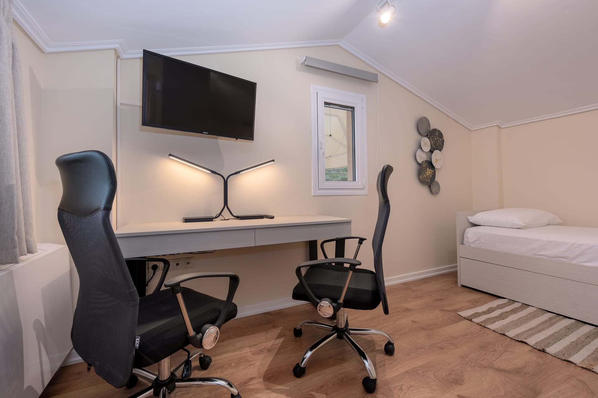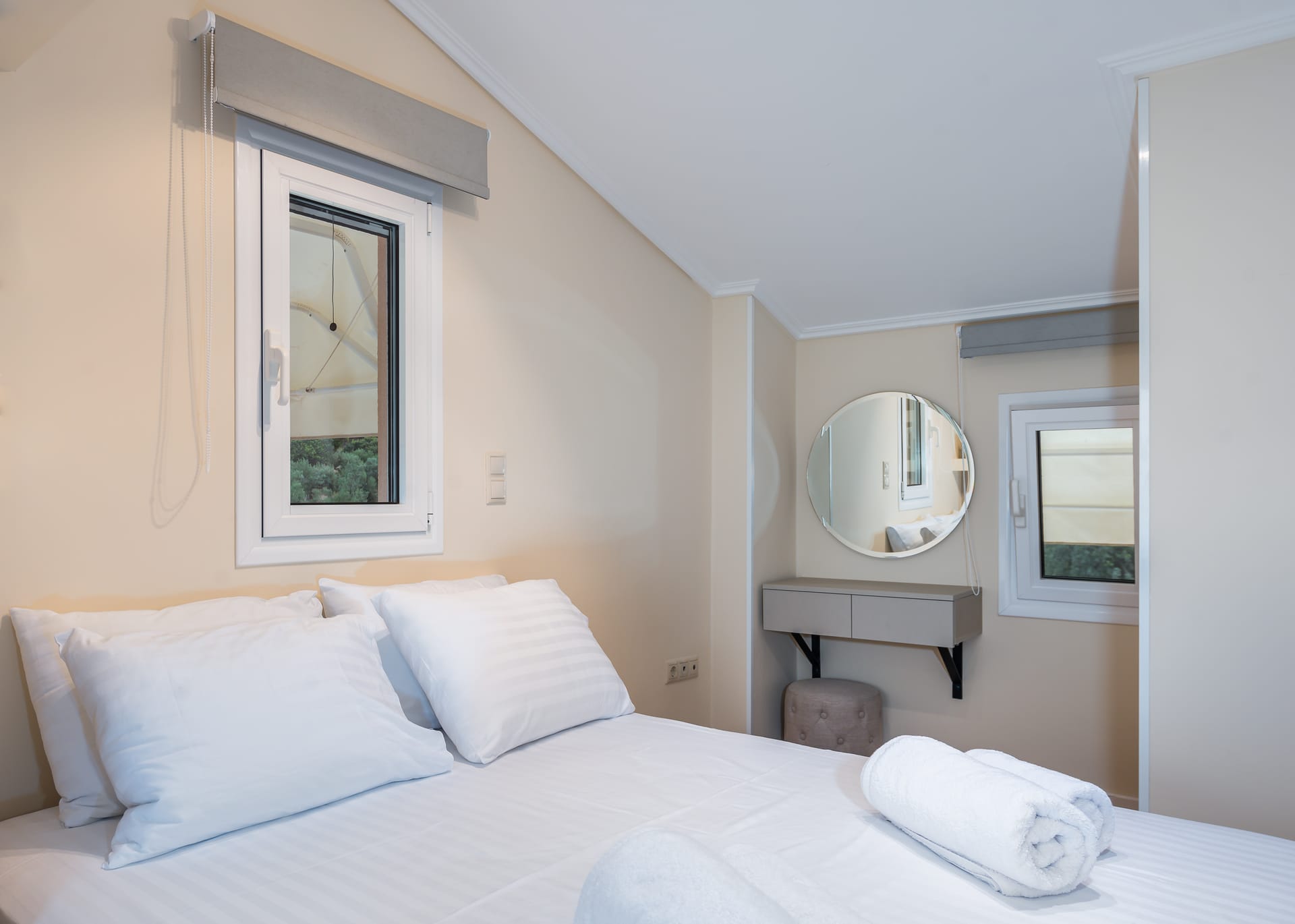 This one of 80sqm on the 3rd floor has 1 room with 1 double bed (wardrobe, painting toilet with mirror and stool) in an open space 1 living room (TV) and 1 fully equipped kitchen (dishwasher, refrigerator, oven, hob, washing machine, coffee maker for French coffee, coffee maker for esresso, frappe maker, kettle etc), 1 small storage room (electric vacuum, ironing board, swiffer mop with vetex, broom with dustpan, clothes rack) and 1 bathroom (shower).Going up to the 4th floor by a wooden staircase is 1 room with 3 single beds and 1 two-seat desk (wardrobe, TV).The floor on both floors is made of wood except for the bathroom which is tiled. All areas open onto large verandas with sea and mountain views where you can enjoy the enchanting dawn.