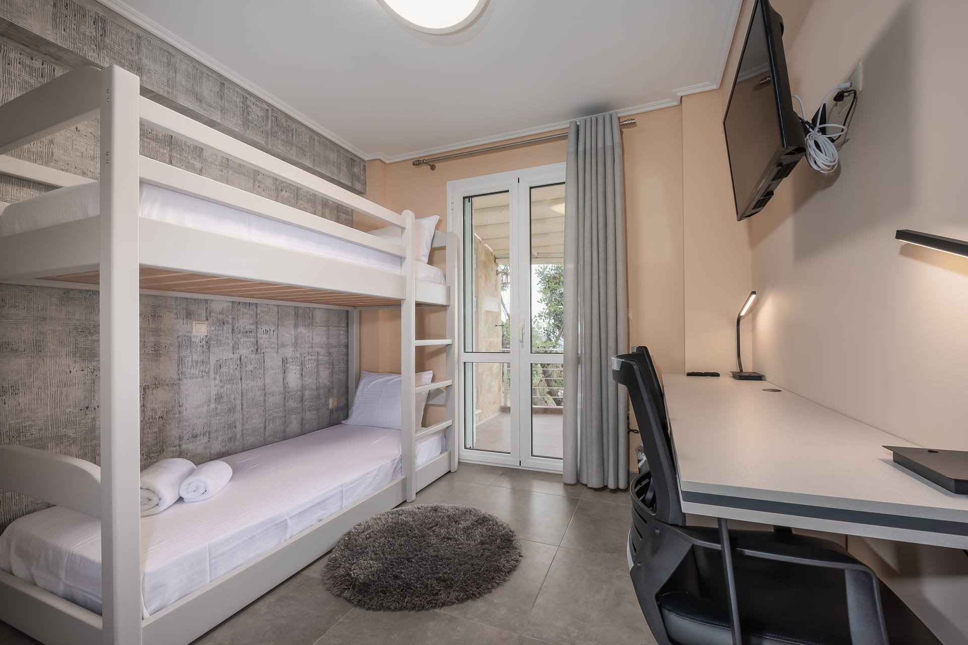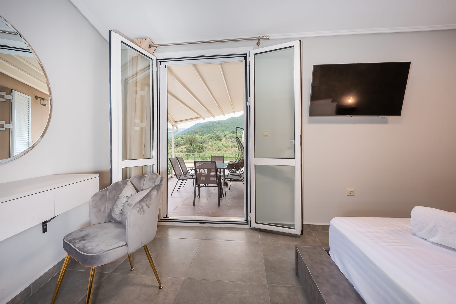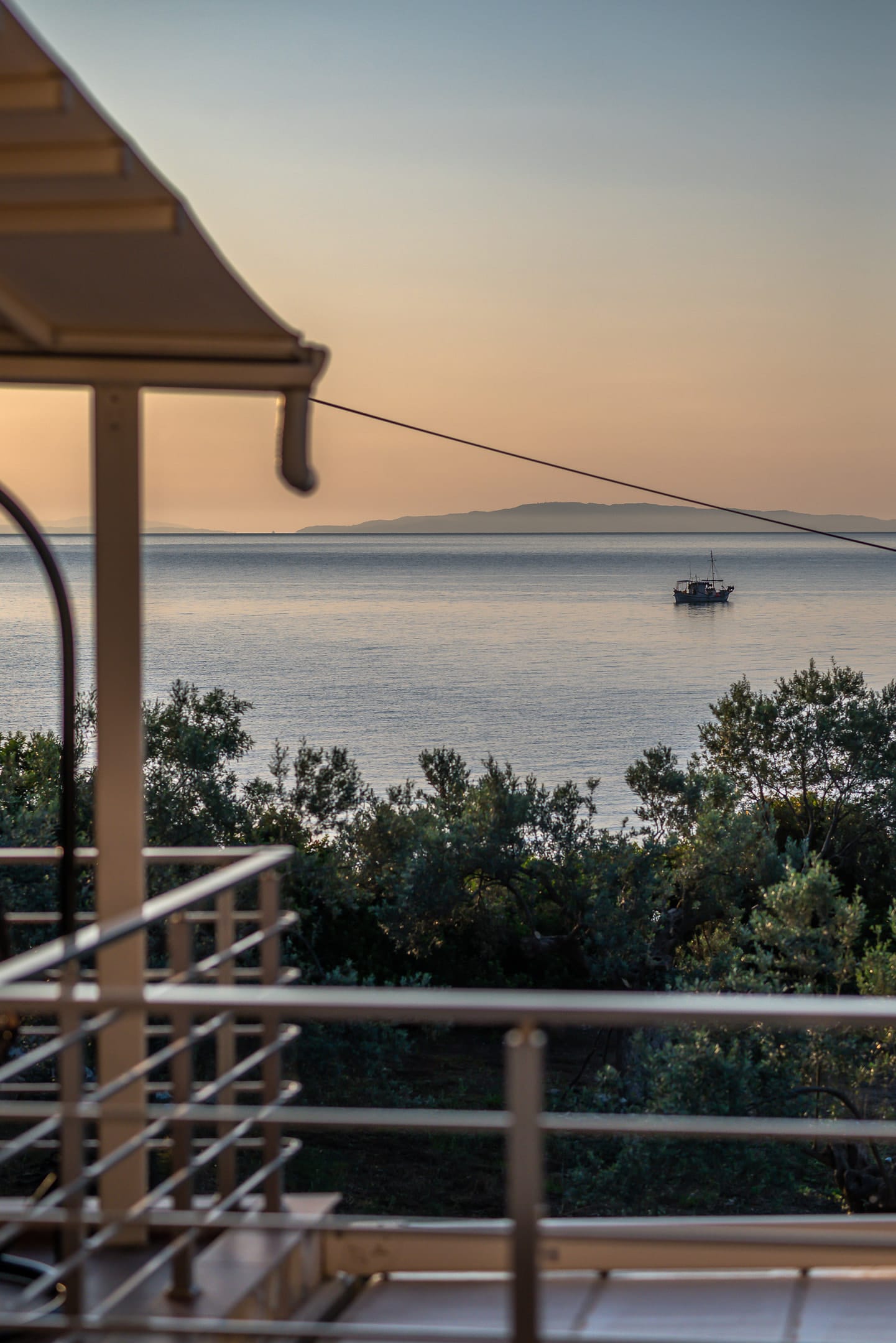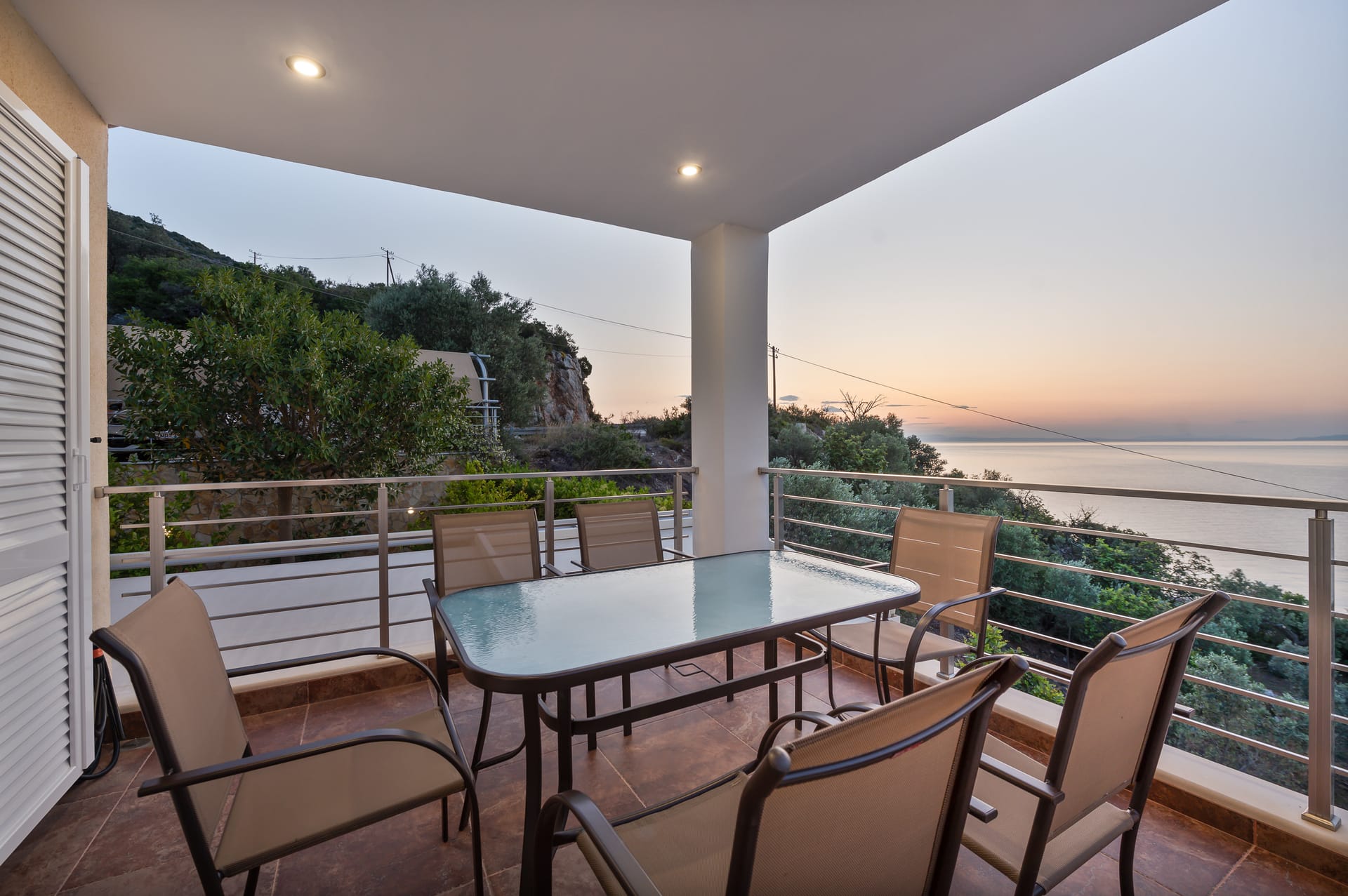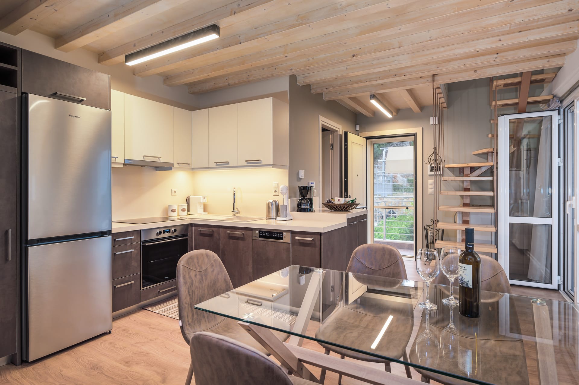 This one of 80sqm on the 3rd floor has 1 room with 1 double bed (wardrobe, painting toilet with mirror and stool) in an open space 1 living room (TV) and 1 fully equipped kitchen (dishwasher, refrigerator, oven, hob, washing machine, coffee maker for French coffee, coffee maker for esresso, frappe maker, kettle etc), 1 small storage room (electric vacuum, ironing board, swiffer mop with vetex, broom with dustpan, clothes rack) and 1 bathroom (shower).Going up to the 4th floor by a wooden staircase is 1 room with 3 single beds and 1 two-seat desk (wardrobe, TV).The floor on both floors is made of wood except for the bathroom which is tiled. All areas open onto large verandas with sea and mountain views where you can enjoy the enchanting dawn.