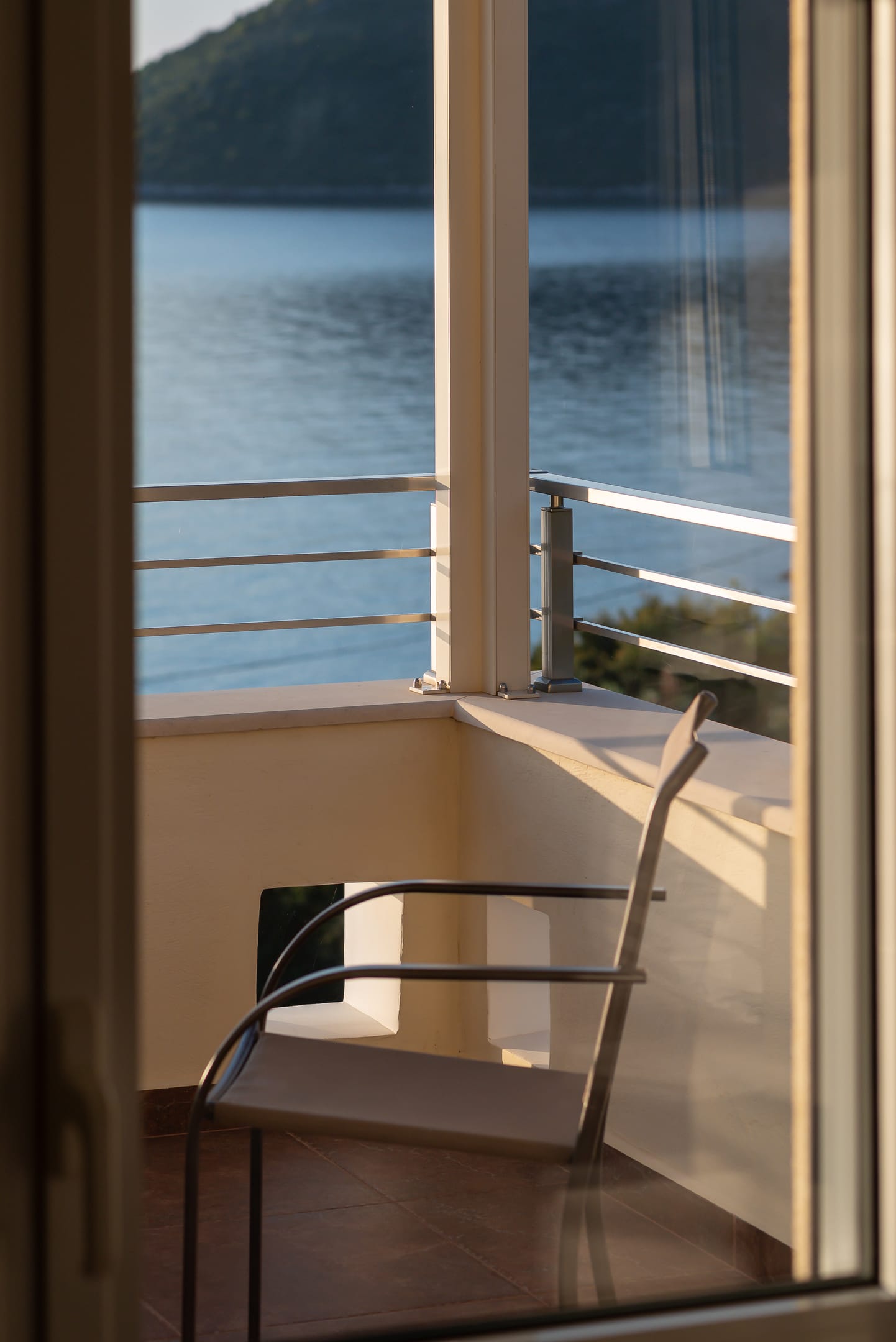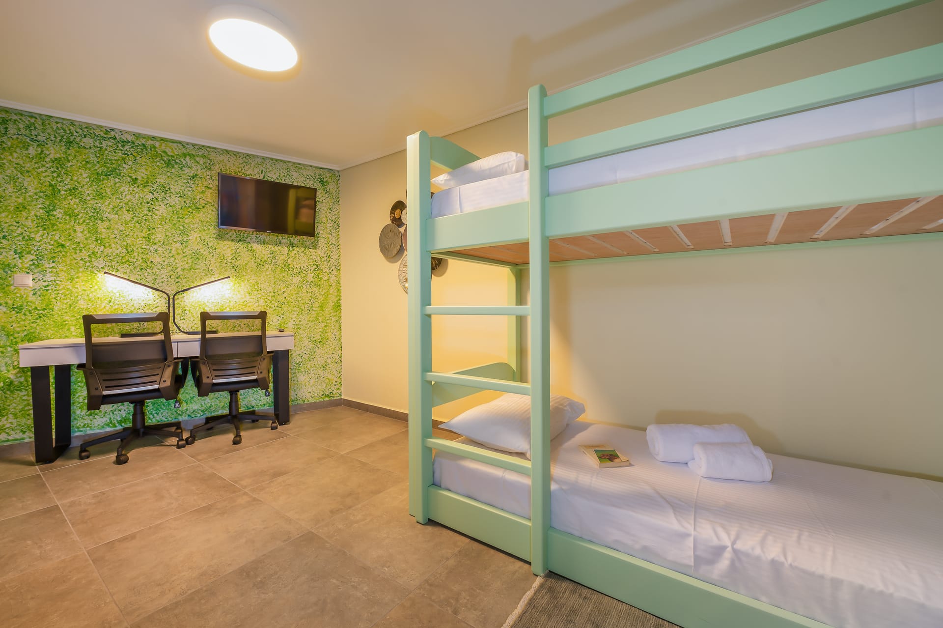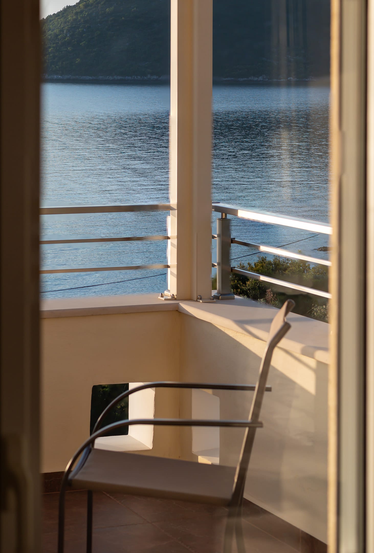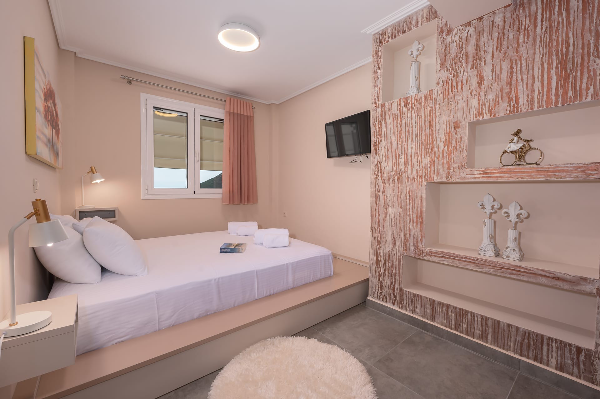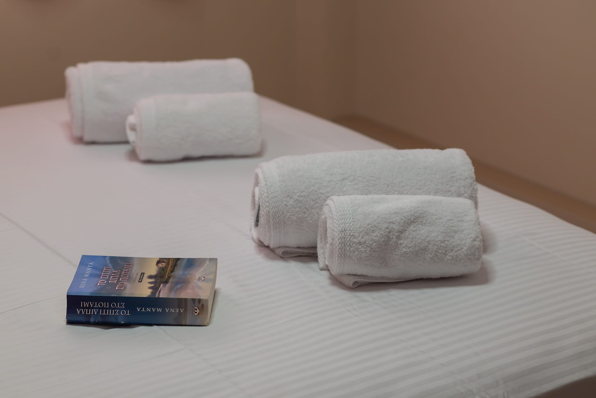 This one of 80sqm on the 3rd floor has 1 room with 1 double bed (wardrobe, painting toilet with mirror and stool) in an open space 1 living room (TV) and 1 fully equipped kitchen (dishwasher, refrigerator, oven, hob, washing machine, coffee maker for French coffee, coffee maker for esresso, frappe maker, kettle etc), 1 small storage room (electric vacuum, ironing board, swiffer mop with vetex, broom with dustpan, clothes rack) and 1 bathroom (shower).Going up to the 4th floor by a wooden staircase is 1 room with 3 single beds and 1 two-seat desk (wardrobe, TV).The floor on both floors is made of wood except for the bathroom which is tiled. All areas open onto large verandas with sea and mountain views where you can enjoy the enchanting dawn.